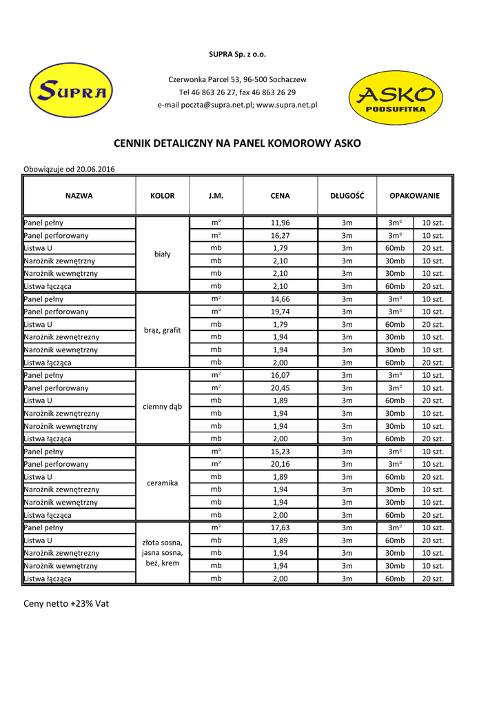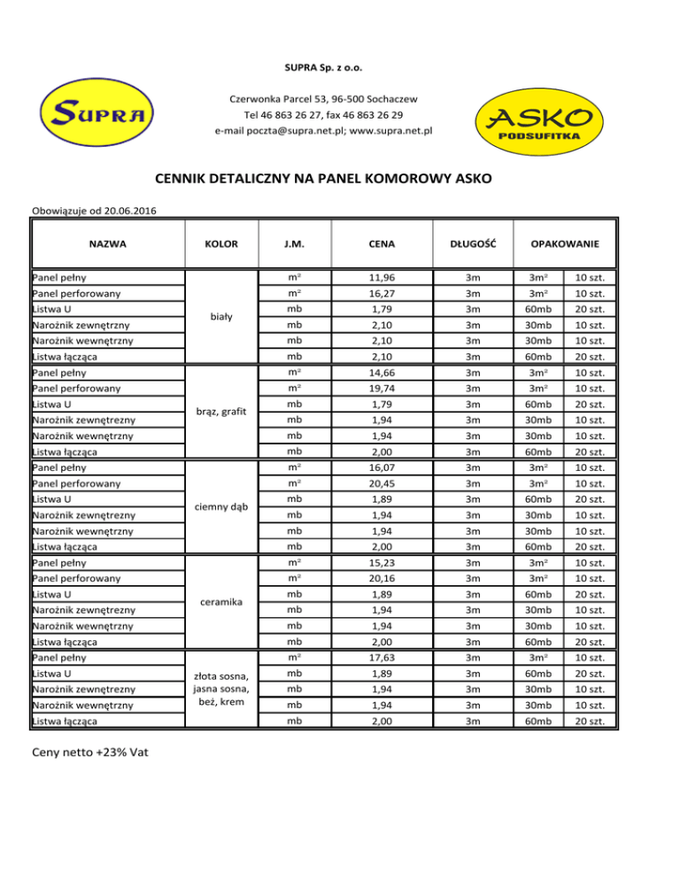 SUPRA Sp. z o.o. Czerwonka Parcel 53, 96-500 Sochaczew Tel 46 863 26 27, fax 46 863 26 29 e-mail [email protected]; www.supra.net.pl CENNIK DETALICZNY NA PANEL KOMOROWY ASKO Obowiązuje od 20.06.2016 NAZWA J.M. CENA DŁUGOŚĆ Panel pełny m2 11,96 3m 3m2 10 szt. Panel perforowany m2 16,27 3m 3m 10 szt. Listwa U mb 1,79 3m 60mb 20 szt. mb 2,10 3m 30mb 10 szt. Narożnik wewnętrzny mb 2,10 3m 30mb 10 szt. Listwa łącząca mb 2,10 3m 60mb 20 szt. Panel pełny m2 14,66 3m 3m 2 10 szt. Panel perforowany m2 19,74 3m 3m2 10 szt. mb 1,79 3m 60mb 20 szt. mb 1,94 3m 30mb 10 szt. Narożnik wewnętrzny mb 1,94 3m 30mb 10 szt. Listwa łącząca mb 2,00 3m 60mb 20 szt. Panel pełny m 2 16,07 3m 3m 2 10 szt. Panel perforowany m 2 20,45 3m 3m 2 10 szt. mb 1,89 3m 60mb 20 szt. Narożnik zewnętrzny Listwa U Narożnik zewnętrezny Listwa U KOLOR biały brąz, grafit ciemny dąb OPAKOWANIE 2 mb 1,94 3m 30mb 10 szt. Narożnik wewnętrzny mb 1,94 3m 30mb 10 szt. Listwa łącząca mb 2,00 3m 60mb 20 szt. Panel pełny m 2 15,23 3m 3m 2 10 szt. Panel perforowany m 2 20,16 3m 3m 2 10 szt. Listwa U mb 1,89 3m 60mb 20 szt. mb 1,94 3m 30mb 10 szt. Narożnik wewnętrzny mb 1,94 3m 30mb 10 szt. Listwa łącząca mb 2,00 3m 60mb 20 szt. Panel pełny m 17,63 3m 3m 10 szt. Listwa U mb 1,89 3m 60mb 20 szt. mb 1,94 3m 30mb 10 szt. mb 1,94 3m 30mb 10 szt. mb 2,00 3m 60mb 20 szt. Narożnik zewnętrezny Narożnik zewnętrezny Narożnik zewnętrezny Narożnik wewnętrzny Listwa łącząca Ceny netto +23% Vat ceramika złota sosna, jasna sosna, beż, krem 2 2