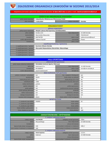 ZGŁOSZENIE ORGANIZACJI ZAWODÓW W SEZONIE 2013/2014 Wypełniony formularz zgłoszenia należy przesłać do dnia 31 lipca 2013 roku na adres e-mail: [email protected] OFERTA NA ORGANIZACJĘ ZAWODÓW pełna nazwa zawodów data zawodów Indywidualne Młodziezowe Mistrzostwa Polski 7-9.03.2014 miejsce zawodów Ostróda kod, miejscowość 14-100 Ostróda ORGANIZATORZY główny organizator pełna nazwa statutowa Miejski Ludowy Klub Sportowy OSTRÓDZIANKA adres siedziby Herdera 3/1 województwo Warmińsko-Mazurskie kontakt tel. osoba odpowiedzialna NIP 664736790 adres e-mail Tadeusz Czyczel stanowisko kontakt tel. 7411915147 [email protected] Prezes adres e-mail współorganizatorzy / sponsorzy 1. współorganizator / sponsor Burmistrz Miasta Ostróda 2. współorganizator / sponsor Marszałek Województwa Warmińsko- Mazurskiego 3. współorganizator / sponsor 4. współorganizator / sponsor 5. współorganizator / sponsor HALA SPORTOWA właściciel hali sportowej pełna nazwa statutowa właściciela adres hali kontakt tel. osoba odpowiedzialna Ostródzkie Centrum Sportu i Rekreacji Kościuszki 22 a kod, miejscowość 89 6460813 adres e-mail Jacek Krzekotowski 14-100 Ostróda [email protected] kontakt tel. dane techniczne hali sportowej szatnie z toaletami i natryskami wymiary hali liczba pół gry (14 x 7 m) oświetlenie (LX) rodzaj nawierzchni tak bar z napojami chłodzącymi tak liczba miejsc na widowni 700 liczba pół gry (12 x 6 m) 16 zaciemnienie otworów okiennych tak podium tak 44x24 12 1200 parkiet opieka medyczna tak pokój organizatora tak pokój sędziów tak pomieszczenie kontroli rakietek tak stolik sędziego głównego tak drukarka tak tablica informacyjna tak nagłośnienie, mikrofon tak obsługa komputerowa tak dostęp do internetu tak wymiary hali treningowej 24x11 liczba stołów w hali treningowej 5 sprzęt sportowy 1. producent, typ stołów ANDRO liczba stołów 2. producent, typ stołów 24 liczba stołów 3. producent, typ stołów liczba stołów liczba stolików sędziowskich 16 liczba numeratorów liczba stojaków na ręczniki 32 liczba płotków 16 160 ZAKWATEROWANIE I WYŻYWIENIE 1. miejsce zakwaterowania rodzaj i nazwa adres PLATINUM odległość od hali sportowej Wyszyńskiego kod, miejscowość kontakt tel. 250m 14-100 Ostróda strona internetowa łączna liczba miejsc noclegowych 120 cena w pokoju 1-osobowym ze śniadaniem cena w pokoju 2-osobowym ze śniadaniem 140 cena w pokoju 3-osobowym ze śniadaniem 190 zł 2. miejsce zakwaterowania rodzaj i nazwa adres Hotel Sajmino Kajkowo odległość od hali sportowej kod, miejscowość kontakt tel. strona internetowa łączna liczba miejsc noclegowych cena w pokoju 1-osobowym ze śniadaniem 2,5 km 14-100 Ostróda cena w pokoju 2-osobowym ze śniadaniem 95 ZŁ 75 ZŁ cena w pokoju 3-osobowym ze śniadaniem 3. miejsce zakwaterowania rodzaj i nazwa adres Centr. Konf. SARMATIA cena w pokoju 2-osobowym ze śniadaniem 14-100 Ostróda kod, miejscowość kontakt tel. łączna liczba miejsc noclegowych 200 m odległość od hali sportowej Pieniężnego strona internetowa 110 cena w pokoju 1-osobowym ze śniadaniem 90 ZŁ 70 ZŁ cena w pokoju 3-osobowym ze śniadaniem ceny wyżywienia cena obiadu cena kolacji NAGRODY suma nagród finansowych (seniorzy) puchary (i medale) dla 4 najlepszych 5000 Zł suma nagród rzeczowych TAK TAK dyplomy dla 4 najlepszych INFORMACJE DODATKOWE Komitet Organizacyjny działania promocyjne materiały prasowe ceremonia otwarcia imprezy towarzyszące ceremonia otwarcia sprawozdanie z zawodów dokumentacja fotograficzna TAK TAK TAK TAK TAK TAK TAK TAK OSOBY UPOWAŻNIONIONE DO REPREZENTOWANIA ORGANIZATORA NAZWISKO imię Tadeusz CZYCZEL funkcja Prezes kontakt tel. 664736790 adres e-mail [email protected] Oświadczamy, że w przypadku przyznania nam organizacji zawodów, podejmiemy z należytą starannością wszelkie działania w celu zorganizowania zawodów zgodnie z umową podpisaną z Polskim Związkiem Tenisa Stołowego. UWAGI PZTS data wpłynięcia zgłoszenia 2013.07.31