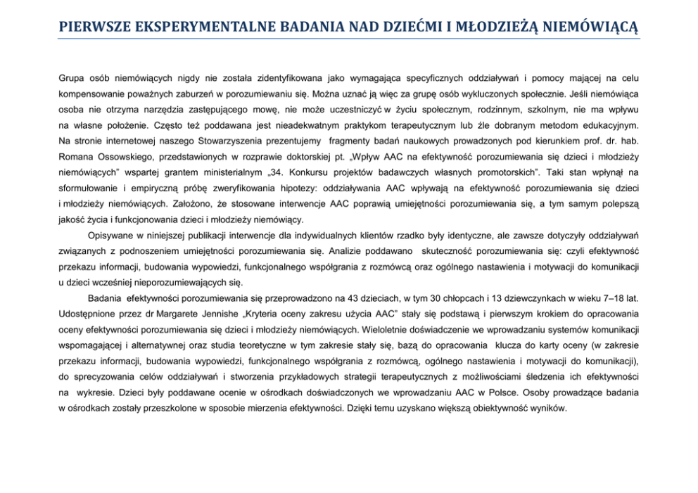 PIERWSZE EKSPERYMENTALNE BADANIA NAD DZIEĆMI I MŁODZIEŻĄ NIEMÓWIĄCĄ Grupa osób niemówiących nigdy nie została zidentyfikowana jako wymagająca specyficznych oddziaływań i pomocy mającej na celu kompensowanie poważnych zaburzeń w porozumiewaniu się. Można uznać ją więc za grupę osób wykluczonych społecznie. Jeśli niemówiąca osoba nie otrzyma narzędzia zastępującego mowę, nie może uczestniczyć w życiu społecznym, rodzinnym, szkolnym, nie ma wpływu na własne położenie. Często też poddawana jest nieadekwatnym praktykom terapeutycznym lub źle dobranym metodom edukacyjnym. Na stronie internetowej naszego Stowarzyszenia prezentujemy fragmenty badań naukowych prowadzonych pod kierunkiem prof. dr. hab. Romana Ossowskiego, przedstawionych w rozprawie doktorskiej pt. „Wpływ AAC na efektywność porozumiewania się dzieci i młodzieży niemówiących” wspartej grantem ministerialnym „34. Konkursu projektów badawczych własnych promotorskich”. Taki stan wpłynął na sformułowanie i empiryczną próbę zweryfikowania hipotezy: oddziaływania AAC wpływają na efektywność porozumiewania się dzieci i młodzieży niemówiących. Założono, że stosowane interwencje AAC poprawią umiejętności porozumiewania się, a tym samym polepszą jakość życia i funkcjonowania dzieci i młodzieży niemówiący. Opisywane w niniejszej publikacji interwencje dla indywidualnych klientów rzadko były identyczne, ale zawsze dotyczyły oddziaływań związanych z podnoszeniem umiejętności porozumiewania się. Analizie poddawano skuteczność porozumiewania się: czyli efektywność przekazu informacji, budowania wypowiedzi, funkcjonalnego współgrania z rozmówcą oraz ogólnego nastawienia i motywacji do komunikacji u dzieci wcześniej nieporozumiewających się. Badania efektywności porozumiewania się przeprowadzono na 43 dzieciach, w tym 30 chłopcach i 13 dziewczynkach w wieku 7–18 lat. Udostępnione przez dr Margarete Jennishe „Kryteria oceny zakresu użycia AAC” stały się podstawą i pierwszym krokiem do opracowania oceny efektywności porozumiewania się dzieci i młodzieży niemówiących. Wieloletnie doświadczenie we wprowadzaniu systemów komunikacji wspomagającej i alternatywnej oraz studia teoretyczne w tym zakresie stały się, bazą do opracowania klucza do karty oceny (w zakresie przekazu informacji, budowania wypowiedzi, funkcjonalnego współgrania z rozmówcą, ogólnego nastawienia i motywacji do komunikacji), do sprecyzowania celów oddziaływań i stworzenia przykładowych strategii terapeutycznych z możliwościami śledzenia ich efektywności na wykresie. Dzieci były poddawane ocenie w ośrodkach doświadczonych we wprowadzaniu AAC w Polsce. Osoby prowadzące badania w ośrodkach zostały przeszkolone w sposobie mierzenia efektywności. Dzięki temu uzyskano większą obiektywność wyników. W każdym z czterech przeprowadzonych badań najniższe wyniki uzyskiwane przez użytkowników AAC dotyczyły zmiennej: budowanie wypowiedzi. Można więc wnioskować, że jest to najtrudniejszy element procesu porozumiewania się do wprowadzania w system użytkownika. Wynikać to może z wielu przyczyn. Budowanie złożonych wypowiedzi przez użytkownika AAC wymaga bowiem wielu aktywności i czasu. Użytkownicy często ograniczeni są narzędziami oraz doświadczeniami w porozumiewaniu się. Tworzą własną kulturę języka, często rozwijają pasywny styl porozumiewania się. Kolejną przyczynę może stanowić fakt, że terapeuci, współtworząc systemy wspomagające, ograniczają się wiedzą dotyczącą języka mówionego, a przecież komunikacja wspomagająca i alternatywna nie jest mową. Posiada odrębne podstawy teoretyczne i metodyczne. W zakresie tego elementu potrzeba będzie jeszcze wielu poszukiwań i doświadczeń. Mimo to należy podkreślić, że stosowane strategie z zakresu komunikacji wspomagającej i alternatywnej przyniosły wyraźne wzrosty we wszystkich czterech wskaźnikach objętych badaniami. Dynamika postępów w okresie trzech pierwszych badań była wyższa niż w okresie objętym czwartym badaniem. Takie rozłożenie dynamiki postępów wskazuje na możliwość przyjęcia hipotezy, że niska skuteczność umiejętności porozumiewania się stwierdzona w pierwszym badaniu wynika z braku pozytywnych doświadczeń komunikacyjnych u dzieci i młodzieży niemówiących. Długotrwałe i intensywne stosowanie strategii AAC przyniosło wzrost umiejętności we wszystkich wskaźnikach podczas całego okresu objętego badaniem. Stąd wniosek, że ten rodzaj interwencji powinien być częścią długofalowego procesu rehabilitacyjnego osób niemówiących. Przeprowadzone w badaniach analizy statystyczne nie ukazują pełnego obrazu wpływu AAC na skuteczność porozumiewania się dzieci niemówiących. Statystyczna interpretacja wyników badań wykazuje bowiem jedynie na występowanie pewnych tendencji w badanej populacji. Oznacza to, że u większości dzieci w określonych sytuacjach możemy spodziewać się zmian w zakresie umiejętności porozumiewania się następujących zgodnie z ujawnionymi tendencjami. Badacza klinicystę zawsze jednak interesuje, co zrobi, jak zachowa się to konkretne dziecko. Bardziej jest skupiony na analizie indywidualnych zmian w zachowaniach i uzyskiwanych przez nie umiejętnościach. Studia konkretnych przypadków w niniejszych badaniach dostarczają wielu uzupełniających danych, by dopełnić prezentowaną analizę wpływu AAC na skuteczność porozumiewania się dzieci i młodzieży niemówiących. Ze względu na specyfikę prowadzonych badań znacznie szerzej niż inne elementy terapii omówiono proces dotyczący stymulacji porozumiewania się, natomiast pozostałe umiejętności dziecka, które w okresie terapii były poddawane oddziaływaniom terapeutycznym, przedstawione zostały w skrótowej formie. Narzędzia wykorzystywane do badań znajdą Państwo w podręczniku aut