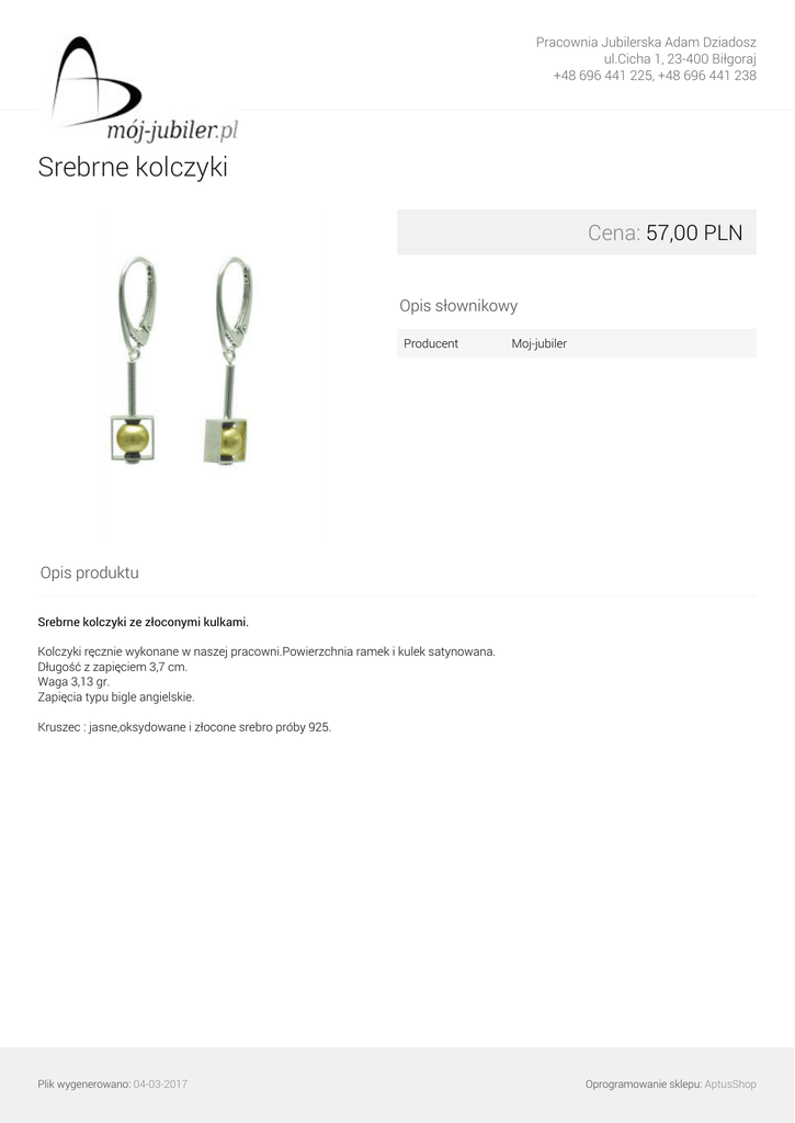 Pracownia Jubilerska Adam Dziadosz ul.Cicha 1, 23-400 Biłgoraj +48 696 441 225, +48 696 441 238 Srebrne kolczyki Cena: 57,00 PLN Opis słownikowy Producent Moj-jubiler Opis produktu Srebrne kolczyki ze złoconymi kulkami. Kolczyki ręcznie wykonane w naszej pracowni.Powierzchnia ramek i kulek satynowana. Długość z zapięciem 3,7 cm. Waga 3,13 gr. Zapięcia typu bigle angielskie. Kruszec : jasne,oksydowane i złocone srebro próby 925. Plik wygenerowano: 04-03-2017 Powered by TCPDF (www.tcpdf.org) Oprogramowanie sklepu: AptusShop