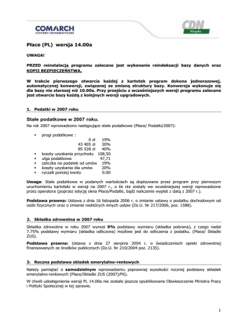 Płace (PL) wersja 14.00a UWAGA! PRZED reinstalacją programu zalecane jest wykonanie reindeksacji bazy danych oraz KOPII BEZPIECZEŃSTWA. W trakcie pierwszego otwarcia kaŜdej z kartotek program dokona jednorazowej, automatycznej konwersji, związanej ze zmianą struktury bazy. Konwersja wykonuje się dla bazy nie starszej niŜ 10.00a. Przy przejściu z wcześniejszych wersji programu zalecane jest otwarcie bazy kaŜdą z kolejnych wersji upgradowych. 1. Podatki w 2007 roku Stałe podatkowe w 2007 roku. Na rok 2007 wprowadzono następujące stałe podatkowe (Płace/ Podatki/2007): progi podatkowe : 0 zł 19% 43 405 zł 30% 85 528 zł 40% koszty uzyskania przychodu 108,50 ulga podatkowa 47,71 zaliczka na podatek od umów 19% koszty uzyskania dla umów 20% ryczałt poniŜej kwoty 0.00 Uwaga: Stałe podatkowe w podanych wartościach są dopisywane przez program przy pierwszym uruchomieniu kartoteki w wersji na 2007 r., o ile nie zostały we wcześniejszej wersji wprowadzone przez operatora (poprzez edycję okna Płace/Podatki, bądź naliczenie wypłat z datą z 2007 r.). Podstawa prawna: Ustawa z dnia 16 listopada 2006 r. o zmianie ustawy o podatku dochodowym od osób fizycznych oraz o zmianie niektórych innych ustaw (Dz.U. Nr 217/2006, poz. 1588). 2. Składka zdrowotna w 2007 roku Składka zdrowotna w roku 2007 wynosi 9% podstawy wymiaru (składka pobrana), z czego nadal 7.75% podstawy wymiaru (składka odliczona) moŜliwe jest do odliczenia z podatku. (Płace/ Składki ZUS). Podstawa prawna: Ustawa z dnia 27 sierpnia 2004 r. o świadczeniach opieki zdrowotnej finansowanych ze środków publicznych (Dz.U. Nr 210/2004 poz. 2135). 3. Roczna podstawa składek emerytalno-rentowych NaleŜy pamiętać o samodzielnym wprowadzeniu poprawnej wysokości rocznej podstawy składek emerytalno-rentowych (Płace/Składki ZUS (2007)/F6). W chwili udostępnienia wersji PL 14.00a nie zostało jeszcze opublikowane Obwieszczenie Ministra Pracy i Polityki Społecznej w tej sprawie. 1 4. Minimalne wynagrodzenie Od 1 stycznia 2007 r. obowiązuje nowa, podwyŜszona stawka minimalnego wynagrodzenie 936 zł. W programie stawka minimalna zapisywana jest oddzielnie dla kaŜdego miesiąca (Konfiguracja – Normy miesięczne – F7). Jej wartość proponowana jest na podstawie zmiennej globalnej @RRRR-Minimalna. Podstawa prawna: Rozporządzenie Rady Ministrów z dnia 12 września 2006 r. w sprawie wysokości minimalnego wynagrodzenia za pracę w 2007 r. (Dz. U. Nr 171/2006, poz. 1227). 5. Indywidualna składka wypadkowa dla właściciela Na formularzu pracownika - (F3) Etat - F10 Menu - dodano pozycję - 7. Indywid. skł. wypad. Po zatwierdzeniu pola (Tak) program pozwala na ustalenie odrębnej składki dla właściciela. Podczas naliczania indywidualnej deklaracji DRA dla właściciela program pobiera procent składki z tego pola. UWAGA: JeŜeli na jednej deklaracji DRA rozlicza się właściciel i pracownicy to nie powinna być zaznaczona na formularzu właściciela indywidualna składka wypadkowa 6. FGŚP i osoby spokrewnione Dla osób spokrewnionych z pracodawcą/właścicielem i zatrudnionych na podstawie umowy o pracę od wersji 14.00a nie nalicza się składka na Fundusz Gwarantowanych Świadczeń Pracowniczych. Osoby spokrewnione rozpoznawane są na podstawie kodu pokrewieństwa wpisanego na formularzu Dodatkowych danych dla ubezpieczeń. JeŜeli składki na FP/FGŚP na deklaracji DRA - liczone od sumy podstaw (zmienna globalna @Wersja DRA <>1) przy sumowaniu podstawy do FGŚP nie są uwzględniane wypłaty osób spokrewnionych z pracodawcą. Podstawa prawna: Ustawa z dnia 13 lipca 2006 r. o ochronie roszczeń pracowniczych w razie niewypłacalności pracodawcy (Dz.U. Nr 158/2006, poz.1121). 7. Nowe kody ubezpieczenia Dla nowych kodów ubezpieczenia dla właścicieli - 0560 XX, 0561 XX, 0562 XX, 0563XX realizowana jest refundacja składek. - właściciel z lekkim stopniem niepełnosprawności (056X X1) - refundujemy składkę wypadkową (50% ubezpieczony, 50% PFRON), - właściciel z umiarkowanym stopniem niepełnosprawności (056X X2) – refundujemy składkę emerytalną (50% ubezpieczony, 50%-PFRON), - właściciel ze znacznym stopniem niepełnosprawności (056X X3)- refundujemy składkę emerytalną (25% - ubezpieczony, 75%-PFRON). 8. Podstawa urlopu wypoczynkowego JeŜeli nieobecność „Urlop wypoczynkowy” trwa na przełomie dwóch miesięcy i jest wpisana w jednej pozycji, to podstawa do naliczenia wynagrodzenia za urlop jest taka sama tzn. ustalona na dzień rozpoczęcia urlopu. JeŜeli natomiast nieobecność jest wprowadzona w dwóch zapisach zgodnych z miesiącami, to dla kaŜdej nieobecności podstawa liczona jest odrębnie. Przykład Pracownik przebywa na urlopie wypoczynkowym od dnia 30 listopada 2006 do dnia 1 grudnia 2006. Zapis nieobecności: 2 1. Od 2006-11-30 do dnia 2006-12-01 (podstawa liczona tylko raz na dzień rozpoczęcia nieobecności z miesięcy październik, wrzesień, sierpień) 2. Od dnia 2006-11-30 do dnia 2006-11-30 (podstawa liczona raz na dzień rozpoczęcia nieobecności z miesięcy październik, wrzesień, sierpień) Od dnia 2006-12-01 do dnia 2006-12-01 (podstawa liczona raz na dzień rozpoczęcia nieobecności z miesięcy listopad, październik, wrzesień) 9. Księgowanie do KP W związku z wprowadzeniem w programie Księga Podatkowa funkcjonalności pozwalającej na księgowanie „do bufora”, umoŜliwiono równieŜ taki rodzaj księgowania w programie PL. O rodzaju księgowania: „na czysto” lub „do bufora” decyduje zmienna "Ksiegowanie_Buf", która przyjmuje wartości: - Nie (wartość domyślna) - księgowanie bezpośrednio do księgi podatkowej („na czysto”) - Tak - księgowanie „do bufora” Sposób księgowania ustawia się w Konfiguracji/Księgowanie - Księgowanie przez bufor. Standardowo wartość ta ustawiona jest na NIE. 10. Umowa aktywizacyjna Dodano nowy rodzaj umowy cywilnoprawnej wchodzący na PIT 11 i PIT 4R a dotyczący naleŜności wy