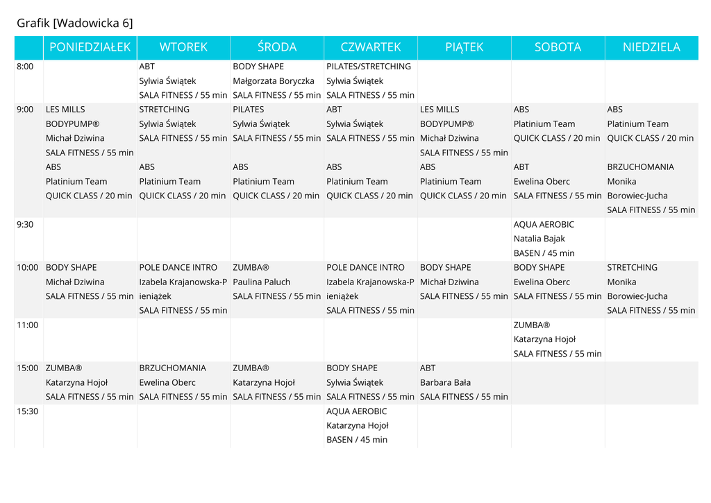 Grafik [Wadowicka 6] PONIEDZIAŁEK 8:00 WTOREK ŚRODA CZWARTEK ABT BODY SHAPE PILATES/STRETCHING Sylwia Świątek Małgorzata Boryczka Sylwia Świątek PIĄTEK SOBOTA NIEDZIELA SALA FITNESS / 55 min SALA FITNESS / 55 min SALA FITNESS / 55 min 9:00 LES MILLS STRETCHING PILATES ABT LES MILLS ABS ABS BODYPUMP® Sylwia Świątek Sylwia Świątek Sylwia Świątek BODYPUMP® Platinium Team Platinium Team Michał Dziwina SALA FITNESS / 55 min SALA FITNESS / 55 min SALA FITNESS / 55 min Michał Dziwina SALA FITNESS / 55 min QUICK CLASS / 20 min QUICK CLASS / 20 min SALA FITNESS / 55 min ABS ABS ABS ABS ABS ABT BRZUCHOMANIA Platinium Team Platinium Team Platinium Team Platinium Team Platinium Team Ewelina Oberc Monika QUICK CLASS / 20 min QUICK CLASS / 20 min QUICK CLASS / 20 min QUICK CLASS / 20 min QUICK CLASS / 20 min SALA FITNESS / 55 min Borowiec-Jucha SALA FITNESS / 55 min 9:30 AQUA AEROBIC Natalia Bajak BASEN / 45 min 10:00 BODY SHAPE Michał Dziwina POLE DANCE INTRO ZUMBA® Izabela Krajanowska-P Paulina Paluch SALA FITNESS / 55 min ieniążek POLE DANCE INTRO Izabela Krajanowska-P Michał Dziwina SALA FITNESS / 55 min ieniążek SALA FITNESS / 55 min BODY SHAPE BODY SHAPE STRETCHING Ewelina Oberc Monika SALA FITNESS / 55 min SALA FITNESS / 55 min Borowiec-Jucha SALA FITNESS / 55 min SALA FITNESS / 55 min 11:00 ZUMBA® Katarzyna Hojoł SALA FITNESS / 55 min 15:00 ZUMBA® Katarzyna Hojoł BRZUCHOMANIA ZUMBA® BODY SHAPE ABT Ewelina Oberc Katarzyna Hojoł Sylwia Świątek Barbara Bała SALA FITNESS / 55 min SALA FITNESS / 55 min SALA FITNESS / 55 min SALA FITNESS / 55 min SALA FITNESS / 55 min 15:30 AQUA AEROBIC Katarzyna Hojoł BASEN / 45 min 16:00 ABT Sylwia Świątek BODY SHAPE ABT ZDROWY KRĘGOSŁUP BRZUCHOMANIA BRZUCHOMANIA ZUMBA® Sylwia Świątek Monika Sylwia Świątek Martyna Kundera Weronika Kosmowska SALA FITNESS / 55 min SALA FITNESS / 55 min Borowiec-Jucha Sylwia Świątek SALA FITNESS / 55 min SALA FITNESS / 55 min SALA FITNESS / 55 min SALA FITNESS / 55 min SALA FITNESS / 55 min PUPOMANIA Platinium Team QUICK CLASS / 30 min 16:30 AQUA AEROBIC AQUA POWER AQUA AEROBIC AQUA JOGGING AQUA POWER AQUA AEROBIC Katarzyna Hojoł Ewelina Oberc Katarzyna Hojoł Katarzyna Hojoł Katarzyna Hojoł Małgorzata Boryczka BASEN / 45 min BASEN / 45 min BASEN / 45 min BASEN / 45 min BASEN / 45 min BASEN / 45 min PILATES TBC+STEP FAT BURNING STRETCHING STRETCHING CARDIO Sylwia Świątek Monika Ewelina Oberc Sylwia Świątek Martyna Kundera Platinium Team 17:00 STRETCHING Sylwia Świątek SALA FITNESS / 55 min SALA FITNESS / 55 min Borowiec-Jucha SALA FITNESS / 55 min SALA FITNESS / 55 min SALA FITNESS / 55 min QUICK CLASS / 20 min SALA FITNESS / 55 min CARDIO CARDIO CARDIO CARDIO CARDIO CARDIO ABT Platinium Team Platinium Team Platinium Team Platinium Team Platinium Team Platinium Team Justyna Mazur QUICK CLASS / 20 min QUICK CLASS / 20 min QUICK CLASS / 20 min QUICK CLASS / 20 min QUICK CLASS / 20 min QUICK CLASS / 20 min SALA FITNESS / 55 min 17:30 AQUA POWER AQUA JOGGING AQUA POWER AQUA INTERWAŁ AQUA AEROBIC AQUA POWER Katarzyna Hojoł Ewelina Oberc Agata Wójcik Katarzyna Hojoł Katarzyna Hojoł Małgorzata Boryczka BASEN / 45 min BASEN / 45 min BASEN / 45 min BASEN / 45 min BASEN / 45 min BASEN / 45 min TBC+STEP FINAL CUTS BOSU ZUMBA® ABS ABS Justyna Mazur Ewelina Oberc Ewelina Oberc Adriana Frasik Platinium Team Platinium Team 18:00 BRZUCHOMANIA Małgorzata Boryczka SALA FITNESS / 55 min SALA FITNESS / 55 min SALA FITNESS / 55 min SALA FITNESS / 55 min SALA FITNESS / 55 min QUICK CLASS / 20 min QUICK CLASS / 20 min ABS ABS ABS ABS ABS BODY SHAPE Platinium Team Platinium Team Platinium Team Platinium Team Platinium Team Justyna Mazur QUICK CLASS / 20 min QUICK CLASS / 20 min QUICK CLASS / 20 min QUICK CLASS / 20 min QUICK CLASS / 20 min 18:30 AQUA AEROBIC AQUA AEROBIC AQUA INTERWAŁ AQUA AEROBIC AQUA INTERWAŁ Sylwia Świątek Sylwia Świątek Agata Wójcik Katarzyna Hojoł Małgorzata Boryczka BASEN / 45 min BASEN / 45 min BASEN / 45 min BASEN / 45 min BASEN / 45 min SALA FITNESS / 55 min 19:00 FIT BALL Martyna Kundera GT POWER PILATES LES MILLS FAT BURNING TRENING TRENING Blanka Potępa Sylwia Świątek BODYPUMP® Ewelina Oberc OBWODOWY DLA OBWODOWY DLA SALA FITNESS / 55 min SALA FITNESS / 55 min SALA FITNESS / 55 min Michał Dziwina SALA FITNESS / 55 min PAŃ SALA FITNESS / 55 min Platinium Team PAŃ Platinium Team QUICK CLASS / 30 min QUICK CLASS / 30 min TRENING TRENING TRENING TRENING TRENING OBWODOWY DLA OBWODOWY DLA OBWODOWY DLA OBWODOWY DLA OBWODOWY DLA PAŃ PAŃ PAŃ PAŃ PAŃ Platinium Team Platinium Team Platinium Team Platinium Team Platinium Team QUICK CLASS / 30 min QUICK CLASS / 30 min QUICK CLASS / 30 min QUICK CLASS / 30 min QUICK CLASS / 30 min 19:30 AQUA JOGGING AQUA INTERWAŁ AQUA AEROBIC AQUA POWER AQUA JOGGING Małgorzata Boryczka Sylwia Świątek Ewelina Oberc Ewelina Oberc Małgorzata Boryczka BASEN / 45 min BASEN / 45 min BASEN / 45 min BASEN / 45 min BASEN / 45 min LES MILLS BRZUCHOMANIA POLE DANCE INTRO LES MILLS Izabela Krajanowska-P BODYPUMP® Sylwia Świątek Eliza Hetka BODYPUMP® ieniążek SALA FITNESS / 55 min SALA FITNESS / 55 min Ewelina Oberc 20:00 POLE DANCE INTRO Michał Dziwina SALA FITNESS / 55 min SALA FITNESS / 55 min SALA FITNESS / 55 min ABS ABS ABS ABS ABS Platinium Team Platinium Team Platinium Team Platinium Team Platinium Team QUICK CLASS / 20 min QUICK CLASS / 20 min QUICK CLASS / 20 min QUICK CLASS / 20 min QUICK CLASS / 20 min 21:00 POLE DANCE POLE DANCE FAT BURNING Izabela Krajanowska-P Izabela Krajanowska-P Barbara Bała ieniążek ieniążek POLE DANCE Eliza Hetka SALA FITNESS / 55 min SALA FITNESS / 55 min SALA FITNESS / 55 min SALA FITNESS / 55 min PUPOMANIA PUPOMANIA PUPOMANIA Platinium Team Platinium Team Platinium Team QUICK CLASS / 30 min QUICK CLASS / 30 min QUICK CLASS / 30 min