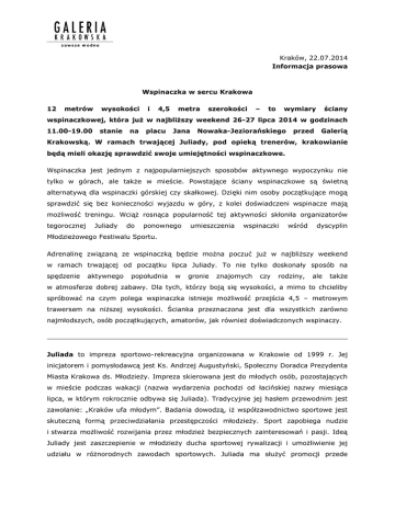 Kraków, 22.07.2014 Informacja prasowa Wspinaczka w sercu Krakowa 12 metrów wysokości i 4,5 metra szerokości – to wymiary ściany wspinaczkowej, która już w najbliższy weekend 26-27 lipca 2014 w godzinach 11.00-19.00 stanie na placu Jana Nowaka-Jeziorańskiego przed Galerią Krakowską. W ramach trwającej Juliady, pod opieką trenerów, krakowianie będą mieli okazję sprawdzić swoje umiejętności wspinaczkowe. Wspinaczka jest jednym z najpopularniejszych sposobów aktywnego wypoczynku nie tylko w górach, ale także w mieście. Powstające ściany wspinaczkowe są świetną alternatywą dla wspinaczki górskiej czy skałkowej. Dzięki nim osoby początkujące mogą sprawdzić się bez konieczności wyjazdu w góry, z kolei doświadczeni wspinacze mają możliwość treningu. Wciąż rosnąca popularność tej aktywności skłoniła organizatorów tegorocznej Juliady do ponownego umieszczenia wspinaczki wśród dyscyplin Młodzieżowego Festiwalu Sportu. Adrenalinę związaną ze wspinaczką będzie można poczuć już w najbliższy weekend w ramach trwającej od początku lipca Juliady. To nie tylko doskonały sposób na spędzenie aktywnego popołudnia w gronie znajomych czy rodziny, ale także w atmosferze dobrej zabawy. Dla tych, którzy boją się wysokości, a mimo to chcieliby spróbować na czym polega wspinaczka istnieje możliwość przejścia 4,5 – metrowym trawersem na niższej wysokości. Ścianka przeznaczona jest dla wszystkich zarówno najmłodszych, osób początkujących, amatorów, jak również doświadczonych wspinaczy. Juliada to impreza sportowo-rekreacyjna organizowana w Krakowie od 1999 r. Jej inicjatorem i pomysłodawcą jest Ks. Andrzej Augustyński, Społeczny Doradca Prezydenta Miasta Krakowa ds. Młodzieży. Impreza skierowana jest do młodych osób, pozostających w mieście podczas wakacji (nazwa wydarzenia pochodzi od łacińskiej nazwy miesiąca lipca, w którym rokrocznie odbywa się Juliada). Tradycyjnie jej hasłem przewodnim jest zawołanie: „Kraków ufa młodym”. Badania dowodzą, iż współzawodnictwo sportowe jest skuteczną formą przeciwdziałania przestępczości młodzieży. Sport zapobiega nudzie i stwarza możliwość rozwijania przez młodzież bezpiecznych zainteresowań i pasji. Ideą Juliady jest zaszczepienie w młodzieży ducha sportowej rywalizacji i umożliwienie jej udziału w różnorodnych zawodach sportowych. Juliada ma służyć promocji przede wszystkim sportów masowych, w które zaangażować się mogą dzieci i młodzież w każdym wieku i co równie ważne bez względu na dochody ich rodzin. Impreza wystartowała 29 czerwca i potrwa do 27 lipca! W trakcie Juliady będziemy promować dziesięć dyscyplin sportowych, w których będziemy organizować zawody dla dzieci i młodzieży: STREETBALL, PIŁKA RĘCZNA, TENIS STOŁOWY, FUTSAL (PIŁKA NOŻNA HALOWA), PIŁKA NOŻNA, BADMINTON, SIATKÓWKA, SZACHY, BREAKDANCE, WSPINACZKA. Więcej informacji udziela: Ryszard Wysokiński - Dyrektor Centrum Galerii Krakowskiej, ECE Projektmanagement Polska, tel.: +48 12 428 99 00, e-mail: [email protected]