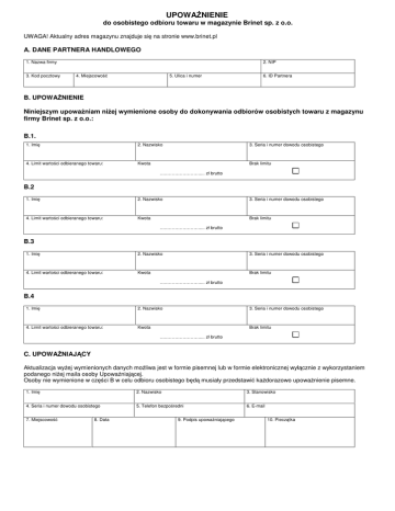 UPOWAŻNIENIE do osobistego odbioru towaru w magazynie Brinet sp. z o.o. UWAGA! Aktualny adres magazynu znajduje się na stronie www.brinet.pl A. DANE PARTNERA HANDLOWEGO 1. Nazwa firmy 3. Kod pocztowy 2. NIP 4. Miejscowość 5. Ulica i numer 6. ID Partnera B. UPOWAŻNIENIE Niniejszym upoważniam niżej wymienione osoby do dokonywania odbiorów osobistych towaru z magazynu firmy Brinet sp. z o.o.: B.1. 1. Imię 2. Nazwisko 3. Seria i numer dowodu osobistego 4. Limit wartości odbieranego towaru: Kwota Brak limitu ….…………………..... zł brutto B.2 1. Imię 2. Nazwisko 3. Seria i numer dowodu osobistego 4. Limit wartości odbieranego towaru: Kwota Brak limitu ….…………………..... zł brutto B.3 1. Imię 2. Nazwisko 3. Seria i numer dowodu osobistego 4. Limit wartości odbieranego towaru: Kwota Brak limitu ….…………………..... zł brutto B.4 1. Imię 2. Nazwisko 3. Seria i numer dowodu osobistego 4. Limit wartości odbieranego towaru: Kwota Brak limitu ….…………………..... zł brutto C. UPOWAŻNIAJĄCY Aktualizacja wyżej wymienionych danych możliwa jest w formie pisemnej lub w formie elektronicznej wyłącznie z wykorzystaniem podanego niżej maila osoby Upoważniającej. Osoby nie wymienione w części B w celu odbioru osobistego będą musiały przedstawić każdorazowo upoważnienie pisemne. 1. Imię 2. Nazwisko 3. Stanowisko 4. Seria i numer dowodu osobistego 5. Telefon bezpośredni 6. E-mail 7. Miejscowość 8. Data 9. Podpis upoważniającego 10. Pieczątka