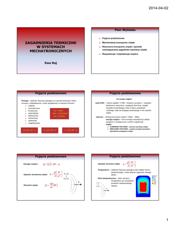 2014-04-02 Plan Wykładu Pojęcia podstawowe ZAGADNIENIA TERMICZNE W SYSTEMACH MECHATRONICZNYCH Mechanizmy transportu ciepła Równania transportu ciepła i sposób rozwiązywania zagadnień wymiany ciepła Rezystancja i impedancja cieplna Ewa Raj Pojęcia podstawowe Pojęcia podstawowe Co to jest ciepło? Energia - wielkość fizyczna opisująca (w sposób ilościowy) różne procesy i oddziaływania, może występować w różnych formach: cieplnej mechanicznej 1 kJ = 1000 J kinetycznej potencjalnej 1 Btu = 1,055056 kJ elektrycznej 1 cal = 4,1868 J chemicznej nuklearnej magnetycznej Q = [J ] = [W ⋅ s] E = [J ] = [W ⋅ s] U = [J ] = [W ⋅ s] wiek XVIII – „Teoria cieplika” (1789 – Antoine Lavoisier) – nieważki, bezbarwny, bezwonny, sprężysty fluid (tzw. cieplik) wszystko przenikający, który można „przelewać” z jednego ciała do drugiego przekazując w ten sposób ciepło. obecnie – „Kinetyczna teoria materii” (1856 – 1906) energia cieplna – forma energii wewnętrznej układu związana z chaotycznym ruchem cząsteczek ciepło: ZJAWISKO FIZYCZNE – proces wymiany ciepła WIELKOŚĆ FIZYCZNA – zmiana energii wywołana zjawiskiem przepływu ciepła 3 Pojęcia podstawowe Energia cieplna: Q = [J ] = [W ⋅ s] Gęstość strumienia ciepła: Strumień ciepła: Q& W q= 2 A m dQ Q& = [W ] dt Pojęcia podstawowe Gęstość strumień ciepła: q= Q& W A m 2 Temperatura – wielkość fizyczna opisująca stan układu termodynamicznego, miara stopnia nagrzania danego biektu Pole temperaturowe – zbiór wartości temperatury we wszystkich punktach analizowanego obiektu 1 2014-04-02 Pojęcia podstawowe Pojęcia podstawowe Jeszcze trochę historii ~1600 – Galileusz – pierwszy termoskop 1650 – Florencka Akademia Nauk – pierwszy termoskop z zasklepioną rurką i podziałką 1669 – Fabri – pierwsze stałe punkty termometryczne (temperatura śniegu oraz temperatura najgorętszego dnia letniego) 1724 – Fahrenheit – ojciec termometrii – twórca pierwszego szklanego termometru rtęciowego; trzy stałe punkty - temperatura: • ciała ludzkiego 96° • mieszanina lodu i wody 32° • mieszanina lodu, wody i chlorku amonu 0° Pojęcia podstawowe Zasady termodynamiki Pierwsza zasada termodynamiki Zmiana energii wewnętrznej ciała lub układu ciał jest możliwa jedynie na skutek przekazania energii w wyniku wykonanej pracy nad ciałem lub przez ciało oraz/lub przepływu ciepła. Druga zasada termodynamiki Nie istnieje proces termodynamiczny, którego jedynym wynikiem byłoby pobranie ciepła ze zbiornika o temperaturze niższej i przekazanie go do zbiornika o temperaturze wyższej (wg. Clausiusa). Trzecia zasada termodynamiki Nie jest możliwe ochłodzenie układu do temperatury zera bezwzględnego za pomocą skończonego procesu. Pojęcia podstawowe Wymiana ciepła: Jeszcze trochę historii 1742 – Celcjusz – 100-stopniowa skala termometryczna oparta na punktach przemian fazowych wody przy ciśnieniu atmosferycznym: • wrzenie wody 0° • topnienie lody 100° 1848 – Lord Kelvin – temperatura bezwzględna i wykorzystanie temperatury zera bezwzględnego 1850 – Stromer – odwrócona skala Celcjusza Zero absolutne Zero Fahrenheita Zamarzanie wody Średnia temperatura ciała człowieka Wrzenie wody Kelwin Celsjusz Fahrenheit 0,00 -273,15 -459,67 Rankine 0,00 255,37 -17,78 0,00 459,67 273,15 0,00 32,00 491,67 309,75 36,60 97,88 557,55 373,15 100,00 212,00 671,67 Pojęcia podstawowe Zasady termodynamiki Zerowa zasada termodynamiki Jeśli układy A i B są z sobą w równowadze termicznej, i to samo jest prawdą dla układów B i C, to układy A i C również są ze sobą w równowadze termicznej. Pierwsza zasada termodynamiki – prawo zachowania energii Parafraza wg Resnicka-Holidaya: „Nie możesz nic wygrać” Druga zasada termodynamiki – prawo stałego wzrostu entropii Parafraza wg Resnicka-Holidaya: „Nie możesz wyjść na swoje” Trzecia zasada termodynamiki – prawo dążenia entropii do zera ze spadkiem temperatury Parafraza wg Resnicka-Holidaya: „Nie możesz wyjść z gry” Zerowa zasada termodynamiki – prawo równocenności stanów układów termodynamicznych Mechanizmy transportu ciepła ustalona – zjawiska wymiany ciepła oraz powiązane z nimi pole temperaturowe nie zmieniają się wraz z upływem czasu Przewodnictwo cieplne - występuje głównie w obszarze ciała stałego; polega ono na przekazywaniu energii wewnętrznej na skutek istnienia różnic temperatur. Zgodnie z prawem Fouriera: nieustalona – zjawiska wymiany ciepła oraz powiązane z nimi pole temperaturowe zmienia się wraz z upływem czasu q = −λ ⋅ grad (T ) Wymiana ciepła może zachodzić w oparciu o trzy podstawowe mechanizmy transportu ciepła: gdzie: q – gęstość strumienia ciepła [W/m2] λ – przewodność cieplna materiału [W/mK] grad(T) – gradient temperatury [K/m] PRZEWODZENIE KONWEKCJE PROMIENIOWANIE 2 2014-04-02 Mechanizmy transportu ciepła Mechanizmy transportu ciepła współczynnik przewodzenia ciepła Konwekcja – to dominujący proces transportu ciepła w obszarze płynów (np. woda, powietrze); przenoszenie ciepła zachodzi na skutek ruchu (dyfuzji) cząstek medium wynikającego z różnicy temperatur (konwekcja naturalna), lub też z zewnętrznie działających sił wymuszających ten ruch (konwekcja wymuszona). diament: 2300 W/mK miedź: 386 W/mK woda: 0,6 W/mK T PŁYN CHŁODZĄCY α powietrze: 0,02 W/mK λ Wiśniewski S., Wiśniewski T.S., Wymiana ciepła, Wyd. 5, WNT, Warszawa, 2000 Mechanizmy transportu ciepła Mechanizmy transportu ciepła Przejmowanie ciepła = przewodzenie + konwekcja Przejmowanie ciepła jest opisane prawem Newtona. Współczynnik przejmowania ciepła q = α ⋅ (TS − TP ) WSPÓŁCZYNNIK PRZEJMOWANIA CIEPŁA [W/m2K] KONWEKCJA gdzie: q – strumień ciepła [W/m2] α – współczynnik przejmowania ciepła [W/m2K] Ts – temperatura powierzchni ciała stałego [K] Tp – temperatura odniesienia pł