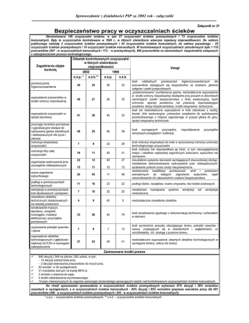 Sprawozdanie z działalności PIP za 2002 rok - załączniki Załącznik nr 31 Bezpieczeństwo pracy w oczyszczalniach ścieków Skontrolowano 100 oczyszczalni ścieków, w tym 27 oczyszczalni ścieków przemysłowych i 73 oczyszczalnie ścieków komunalnych. Były to oczyszczalnie kontrolowane w 1998 r., w których stwierdzono wówczas najwięcej nieprawidłowości. Do sektora publicznego należały 2 oczyszczalnie ścieków przemysłowych i 63 oczyszczalnie ścieków komunalnych, do sektora prywatnego - 25 oczyszczalni ścieków przemysłowych i 10 oczyszczalni ścieków komunalnych. W kontrolowanych oczyszczalniach zatrudnionych było 1 119 pracowników (947 - w oczyszczalniach komunalnych i 172 - w przemysłowych), 896 pracowników na stanowiskach bezpośrednio związanych z zabezpieczeniem procesu technologicznego. Zagadnienia objęte kontrolą Odsetek kontrolowanych oczyszczalni w których stwierdzono nieprawidłowości 2002 1998 o.ś.p. * o.ś.k.** o.ś.p. o.ś.k. Uwagi brak oddzielnych pomieszczeń higienicznosanitarnych dla pracowników stykających się bezpośrednio ze ściekami, głównie ustępów i szatni przepustowych. „przeterminowane” pochłaniacze gazów, niedostateczne wyposażenie w środki ochrony indywidualnej niezbędne przy pracach w zbiornikach zamkniętych (szelki bezpieczeństwa z linką ewakuacyjną, kaski ochronne, aparaty powietrzne lub przewody doprowadzające powietrze, lampy bezpieczeństwa), środki niesprawne technicznie. brak lub niedostateczne wyposażenie w koła ratunkowe z rzutką, bosaki, linki asekuracyjne, przewoźne urządzenia do wydobywania poszkodowanego z miejsca zagrożonego w pozycji głową do góry, sprzęt niesprawny technicznie. pomieszczenia higienicznosanitarne 30 25 29 32 wyposażenie pracowników w środki ochrony indywidualnej 48 27 26 35 wyposażenie oczyszczalni w sprzęt ratunkowy 41 38 45 33 48 25 46 38 7 9 23 29 18 11 45 31 22 12 48 37 15 11 10 13 22 55 11 58 11 16 23 22 podłogi śliskie, nasiąkliwe, trudno zmywalne, bez kratek ściekowych. 7 10 32 20 niewłaściwe rozwiązanie nieskuteczna. 4 9 42 5 niedostateczne oświetlenie obiektów. 33 26 45 79 brak oznakowania zgodnego z dokumentacją techniczną i schematem w sterowni. usytuowanie pokręteł zaworów i zasuw 7 9 7 13 brak wyniesienia powyżej otaczającego terenu pokręteł zaworów i zasuw, znajdujących się w studzienkach i zagłębieniach, co umożliwiałoby ich obsługę z poziomu terenu. wyposażenie obiektów technologicznych o głębokości większej niż 0,5m w wymagane zabezpieczenia 37 23 29 41 niedostateczne wyposażenie otwartych obiektów technologicznych w wymagane bariery, osłony lub ściany. przyrządy kontrolno-pomiarowe i sygnalizacyjne służące do wykrywania gazów szkodliwych i niebezpiecznych dla życia i zdrowia instrukcja eksploatacji oczyszczalni instrukcja bhp całej oczyszczalni organizacja wykonywania prac szczególnie niebezpiecznych ocena zagrożenia wybuchowego podłogi w pomieszczeniach technologicznych wentylacja w pomieszczeniach krat obudowanych i pompowni oświetlenie obiektów technicznych zlokalizowanych na otwartej przestrzeni oznakowanie maszyn, aparatury, urządzeń, rurociągów, instalacji elektrycznej i przyrządów pomiarowych brak wymaganych przyrządów, okresowym przeglądom i kalibracji. niepoddawanie przyrządów brak instrukcji eksploatacji lub brak w opracowanej instrukcji schematu technologicznego oczyszczalni. brak instrukcji lub nieprawidłowa jej treść, w tym nieuwzględnienie miejsc i obiektów najbardziej zagrożonych zatruciami, wybuchem lub utonięciem. nieustalenie wykazów stanowisk wymagających dwuosobowej obsługi, niewłaściwe dokumentowanie wykonywania prac niebezpiecznych, wydawanie poleceń przez osoby nieupoważnione. niedokonanie kwalifikacji pomieszczeń, stref i przestrzeni zewnętrznych do kategorii zagrożenia wybuchem, bądź nieoznakowanie ich odpowiednimi znakami bezpieczeństwa. systemu wentylacji lub wentylacja Zastosowane środki prawne 840 decyzji ( 548 na piśmie i 292 ustne), w tym: - 14 decyzji wstrzymania prac, - 2 decyzje skierowania pracowników do innych prac, 83 wnioski w 35 wystąpieniach, 31 mandatów karnych na kwotę 9910 zł, 2 wnioski o ukaranie do sądu, 4 środki oddziaływania wychowawczego, 14 pism interwencyjnych do organów samorządu terytorialnego sprawujących nadzór nad kontrolowanymi oczyszczalniami ścieków komunalnych. Do chwili opracowania sprawozdania w oczyszczalniach ścieków przemysłowych wykonano 87% decyzji i 58% wniosków zawartych w wystąpieniach, a w oczyszczalniach ścieków komunalnych - 80% decyzji i 85% wniosków (poprawa warunków pracy dla 691 pracowników (446 - w oczyszczalniach ścieków przemysłowych i 245 - w oczyszczalniach ścieków komunalnych). * o.ś.p. – oczyszczalnie ścieków przemysłowych, ** o.ś.k. – oczyszczalnie ścieków komunalnych