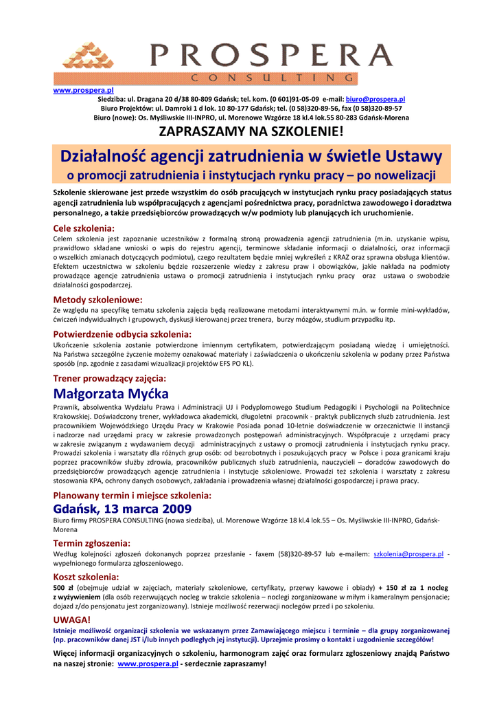 www.prospera.pl Siedziba: ul. Dragana 20 d/38 80-809 Gdańsk; tel. kom. (0 601)91-05-09 e-mail: [email protected] Biuro Projektów: ul. Damroki 1 d lok. 10 80-177 Gdańsk; tel. (0 58)320-89-56, fax (0 58)320-89-57 Biuro (nowe): Os. Myśliwskie III-INPRO, ul. Morenowe Wzgórze 18 kl.4 lok.55 80-283 Gdańsk-Morena ZAPRASZAMY NA SZKOLENIE! Działalność agencji zatrudnienia w świetle Ustawy o promocji zatrudnienia i instytucjach rynku pracy – po nowelizacji Szkolenie skierowane jest przede wszystkim do osób pracujących w instytucjach rynku pracy posiadających status agencji zatrudnienia lub współpracujących z agencjami pośrednictwa pracy, poradnictwa zawodowego i doradztwa personalnego, a także przedsiębiorców prowadzących w/w podmioty lub planujących ich uruchomienie. Cele szkolenia: Celem szkolenia jest zapoznanie uczestników z formalną stroną prowadzenia agencji zatrudnienia (m.in. uzyskanie wpisu, prawidłowo składane wnioski o wpis do rejestru agencji, terminowe składanie informacji o działalności, oraz informacji o wszelkich zmianach dotyczących podmiotu), czego rezultatem będzie mniej wykreśleń z KRAZ oraz sprawna obsługa klientów. Efektem uczestnictwa w szkoleniu będzie rozszerzenie wiedzy z zakresu praw i obowiązków, jakie nakłada na podmioty prowadzące agencje zatrudnienia ustawa o promocji zatrudnienia i instytucjach rynku pracy oraz ustawa o swobodzie działalności gospodarczej. Metody szkoleniowe: Ze względu na specyfikę tematu szkolenia zajęcia będą realizowane metodami interaktywnymi m.in. w formie mini-wykładów, ćwiczeń indywidualnych i grupowych, dyskusji kierowanej przez trenera, burzy mózgów, studium przypadku itp. Potwierdzenie odbycia szkolenia: Ukończenie szkolenia zostanie potwierdzone imiennym certyfikatem, potwierdzającym posiadaną wiedzę i umiejętności. Na Państwa szczególne życzenie możemy oznakować materiały i zaświadczenia o ukończeniu szkolenia w podany przez Państwa sposób (np. zgodnie z zasadami wizualizacji projektów EFS PO KL). Trener prowadzący zajęcia: Małgorzata Myćka Prawnik, absolwentka Wydziału Prawa i Administracji UJ i Podyplomowego Studium Pedagogiki i Psychologii na Politechnice Krakowskiej. Doświadczony trener, wykładowca akademicki, długoletni pracownik - praktyk publicznych służb zatrudnienia. Jest pracownikiem Wojewódzkiego Urzędu Pracy w Krakowie Posiada ponad 10-letnie doświadczenie w orzecznictwie II instancji i nadzorze nad urzędami pracy w zakresie prowadzonych postępowań administracyjnych. Współpracuje z urzędami pracy w zakresie związanym z wydawaniem decyzji administracyjnych z ustawy o promocji zatrudnienia i instytucjach rynku pracy. Prowadzi szkolenia i warsztaty dla różnych grup osób: od bezrobotnych i poszukujących pracy w Polsce i poza granicami kraju poprzez pracowników służby zdrowia, pracowników publicznych służb zatrudnienia, nauczycieli – doradców zawodowych do przedsiębiorców prowadzących agencje zatrudnienia i instytucje szkoleniowe. Prowadzi też szkolenia i warsztaty z zakresu stosowania KPA, ochrony danych osobowych, zakładania i prowadzenia własnej działalności gospodarczej i prawa pracy. Planowany termin i miejsce szkolenia: Gdańsk, 13 marca 2009 Biuro firmy PROSPERA CONSULTING (nowa siedziba), ul. Morenowe Wzgórze 18 kl.4 lok.55 – Os. Myśliwskie III-INPRO, GdańskMorena Termin zgłoszenia: Według kolejności zgłoszeń dokonanych poprzez przesłanie - faxem (58)320-89-57 lub e-mailem: [email protected] wypełnionego formularza zgłoszeniowego. Koszt szkolenia: 500 zł (obejmuje udział w zajęciach, materiały szkoleniowe, certyfikaty, przerwy kawowe i obiady) + 150 zł za 1 nocleg z wyżywieniem (dla osób rezerwujących nocleg w trakcie szkolenia – noclegi zorganizowane w miłym i kameralnym pensjonacie; dojazd z/do pensjonatu jest zorganizowany). Istnieje możliwość rezerwacji noclegów przed i po szkoleniu. UWAGA! Istnieje możliwość organizacji szkolenia we wskazanym przez Zamawiającego miejscu i terminie – dla grupy zorganizowanej (np. pracowników danej JST i/lub innych podległych jej instytucji). Uprzejmie prosimy o kontakt i uzgodnienie szczegółów! Więcej informacji organizacyjnych o szkoleniu, harmonogram zajęć oraz formularz zgłoszeniowy znajdą Państwo na naszej stronie: www.prospera.pl - serdecznie zapraszamy!