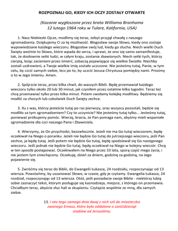 ROZPOZNALI GO, KIEDY ICH OCZY ZOSTAŁY OTWARTE (Kazanie wygłoszone przez brata Williama Branhama 12 lutego 1964 roku w Tulare, Kalifornia, USA) 1. Nasz Niebieski Ojcze, modlimy się teraz, żebyś przyjął chwałę z naszego zgromadzenia. Dziękujemy Ci za tę możliwośd. Błogosław swoje Słowo, kiedy ono zostaje wypowiedziane każdego wieczoru. Błogosław swój lud, kiedy go słucha. Niech wielki Duch Święty weźmie to Słowo, które wpada do serca, i sprawi, że ono się samo zamanifestuje, tak, że dosłownie setki ludzi, w całym kraju, zostanie zbawionych. Niech setki tych, którzy cierpią, leżąc zacienieni przez śmierd, zobaczą pojawiające się wielkie Światło. Niechby zostali uzdrowieni, a Twoje wielkie imię zostało uczczone. Nie jesteśmy tutaj, Panie, w tym celu, by czcid samych siebie, lecz po to, by uczcid Jezusa Chrystusa pomiędzy nami. Prosimy o to w Jego imieniu. Amen. 2. Spójrzcie teraz, przez kilka chwil, do waszych Biblii. Będę przemawiał każdego wieczoru tylko około 20 lub 30 minut, jak czyniłem przez ostatnie kilka tygodni. Teraz też chcę przemawiad tylko przez kilka minut. Potem zwołamy kolejkę modlitwy. Będziemy się modlid za chorych lub cokolwiek Duch Święty zechce. 3. Ilu z was, którzy jesteście tutaj po raz pierwszy, oraz wszyscy pozostali, będzie się modliło za tym zgromadzeniem? Czy to uczynicie? Nie jesteśmy tutaj tylko... Jesteśmy tutaj, ponieważ próbujemy pomóc. Wierzę, bracia, że Pan pomaga nam, abyśmy mieli wspaniałe zgromadzenie dla czci naszego Pana i Zbawiciela. 4. Wierzymy, że On przychodzi, bezzwłocznie. Jeżeli nie ma Go tutaj wieczorem, będę oczekiwał na Niego o poranku. Jeżeli nie będzie Go tutaj do jutrzejszego wieczoru, jeśli Pan zechce, ja będę tutaj. Jeśli potem nie będzie Go tutaj, będę spodziewał się Go następnego wieczoru. Jeśli jednak nie będzie Go tutaj, będę oczekiwał na Niego w kolejny wieczór. Chcę w ten sposób postępowad. Oczekiwałem na Niego przez 33 lata, sporą częśd mego życia, i nie jestem tym zniechęcony. Oczekuję, dzieo za dniem, godzinę za godziną, na Jego pojawienie się. 5. Zwródmy się teraz do Biblii, do Ewangelii Łukasza, 24 rozdziału, rozpoczynając od 13 wiersza. Powstaomy, by uszanowad Słowo, w czasie, gdy je czytamy. Ewangelia Łukasza, 24 rozdział, rozpoczynając od 13 wiersza. Otóż, jeśli posiadacie swoje Biblie - niektórzy lubią sobie zaznaczyd tekst, którym posługuje się kaznodzieja, miejsce, z którego on przemawia. Chciałbym teraz, abyście słuc hali w skupieniu. Czytajcie wspólnie ze mną, dla samych siebie. 13. I oto tego samego dnia dwaj z nich szli do miasteczka zwanego Emaus, które było oddalone o sześddziesiąt stadiów od Jerozolimy. 14. Szli razem... o tych wszystkich wydarzeniach. (Przepraszam). I rozmawiali z sobą o tych wszystkich wydarzeniach. 15. A gdy tak rozmawiali i nawzajem się pytali, sam Jezus, przybliżywszy się, szedł z nimi. 16. Lecz oczy ich były zasłonięte, tak że Go poznad nie mogli. 17. I rzekł do nich: Cóż to za rozmowy, idąc, prowadzicie z sobą? I przystanęli przygnębieni. 18. A odpowiadając jeden, imieniem Kleopas, rzekł do niego: Czyś ty jedyny pątnik w Jerozolimie, który nie wie, co się w niej w tych dniach stało? 19. Rzekł im: Co? Oni zaś odpowiedzieli mu: Z Jezusem Nazareoskim, który był mężem, prorokiem mocarnym w czynie i w słowie przed Bogiem i wszystkim ludem, 20. Jak arcykapłani i zwierzchnicy nasi wydali na niego wyrok śmierci i ukrzyżowali Go. 21. A myśmy się spodziewali, że On odkupi Izraela, lecz po tym wszystkim już dziś trzeci dzieo, jak się to stało. 22. Lecz i niektóre nasze niewiasty, które były wczesnym rankiem u grobu, wprawiły nas w zdumienie, 23. Bo nie znalazłszy Jego ciała, przyszły, mówiąc, że miały widzenie aniołów, powiadających, iż On żyje. 24. Toteż niektórzy z tych, którzy byli z nami, poszli do grobu i zastali to tak, jak mówiły niewiasty, lecz Jego nie widzieli. 25. A On rzekł do niech: O głupi i gnuśnego serca, by uwierzyd we wszystko, co powiedzieli prorocy. 26. Czyż Chrystus nie musiał tego wycierpied, by wejśd do swojej chwały? 27. I począwszy od Mojżesza poprzez wszystkich proroków wykładał im, co o Nim było napisane we wszystkich Pismach. 28. I zbliżyli się do miasteczka, do którego zdążali, a On okazywał, jakoby miał iśd dalej. 29. I przymusili Go, by został, mówiąc: Zostao z nami, gdyż ma się ku wieczorowi i dzieo się już nachylił. I wstąpił, by zostad z nimi. 30. A gdy zasiadł z nimi przy stole, wziąwszy chleb, pobłogosławił i rozłamawszy, podawał im. 31. Wtedy otworzyły się ich oczy i poznali Go. Lecz On znikł sprzed ich oczu. 32. I rzekli do siebie: Czyż serce nasze nie pałało w nas, gdy mówił do nas w drodze i Pisma przed nami otwierał? 33. I wstawszy tejże godziny, powrócili do Jerozolimy i znaleźli zgromadzonych jedenastu i tych, którzy z nimi byli, 34. Mówiących: Wstał Pan prawdziwie i ukazał się Szymonowi. 35. A oni też opowiedzieli o tym, co zaszło w drodze i jak Go poznali po łamaniu chleba. 6. Skłoomy nasze głowy. Panie Jezu, modlimy się, abyś dał się nam poznad w podobny sposób tego wieczoru, gdy na Ciebie oczekujemy. Modlimy się w imieniu Jezusa. Amen. Możecie usiąśd. 7. Aby obrad temat, chciałbym posłużyd się tymi słowami: Rozpoznali Go, kiedy ich oczy zostały otwarte. 8. Otóż, przemawiamy oczywiście na temat zmartwychwstania, w które wierzą wszyscy dzisiejsi chrześcijanie. Jest ono nadzieją kościoła. Jeżeli Chrystus nie powstał z martwych, jesteśmy zgubieni. Otóż, chrześcijaostwo jest zbudowane na zmartwychwstaniu, a nie na zamianie. Zmartwychwstanie! Na przykład, gdybym upuścił tutaj na podłogę ten motelowy klucz i powiedział: "Otóż, upuściłem ten klucz, a teraz położę tutaj inny, podobny do tego". To nie jest zmartwychwstanie, to jest zamiana. Rozumiecie? Zmartwychwstan