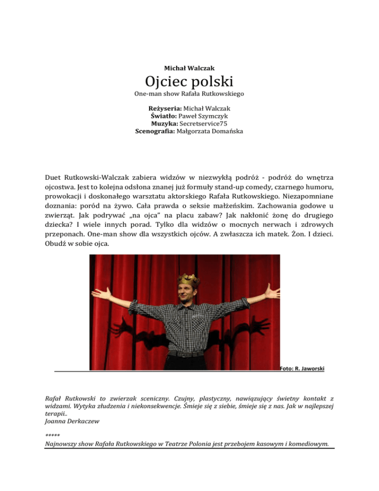 Michał Walczak Ojciec polski One-man show Rafała Rutkowskiego Reżyseria: Michał Walczak Światło: Paweł Szymczyk Muzyka: Secretservice75 Scenografia: Małgorzata Domańska Duet Rutkowski-Walczak zabiera widzów w niezwykłą podróż - podróż do wnętrza ojcostwa. Jest to kolejna odsłona znanej już formuły stand-up comedy, czarnego humoru, prowokacji i doskonałego warsztatu aktorskiego Rafała Rutkowskiego. Niezapomniane doznania: poród na żywo. Cała prawda o seksie małżeńskim. Zachowania godowe u zwierząt. Jak podrywać „na ojca” na placu zabaw? Jak nakłonić żonę do drugiego dziecka? I wiele innych porad. Tylko dla widzów o mocnych nerwach i zdrowych przeponach. One-man show dla wszystkich ojców. A zwłaszcza ich matek. Żon. I dzieci. Obudź w sobie ojca. Foto: R. Jaworski Rafał Rutkowski to zwierzak sceniczny. Czujny, plastyczny, nawiązujący świetny kontakt z widzami. Wytyka złudzenia i niekonsekwencje. Śmieje się z siebie, śmieje się z nas. Jak w najlepszej terapii.. Joanna Derkaczew ***** Najnowszy show Rafała Rutkowskiego w Teatrze Polonia jest przebojem kasowym i komediowym. Rutkowski jest najlepszy wtedy, gdy prowadzi dialog z wyimaginowanymi rozmówcami. Wtedy widzowie mają frajdę, bo wydaje im się, że showman rozmawia z którymś z nich. W przedstawieniu w Polonii aktor stara się nawet przełamać tę ostatnią barierę, bo zwraca się do wybranych widzów, wciągając ich w wir spektaklu. Przez półtorej godziny śmieszy, tumani, przestrasza. I ma jeszcze siły, by się ukłonić na pożegnanie. Bronisław Tumiłowicz