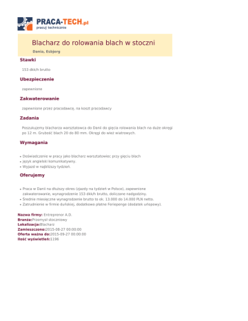 Blacharz do rolowania blach w stoczni Dania, Esbjerg Stawki 153 dkk/h brutto Ubezpieczenie zapewnione Zakwaterowanie zapewnione przez pracodawcę, na koszt pracodawcy Zadania Poszukujemy blacharza warsztatowca do Danii do gięcia rolowania blach na duże okręgi po 12 m. Grubość blach 20 do 80 mm. Okręgi do wież wiatrowych. Wymagania ● ● ● Doświadczenie w pracy jako blacharz warsztatowiec przy gięciu blach język angielski komunikatywny. Wyjazd w najbliższy tydzień. Oferujemy ● ● ● Praca w Danii na dłuższy okres (zjazdy na tydzień w Polsce), zapewnione zakwaterowanie, wynagrodzenie 153 dkk/h brutto, doliczane nadgodziny. Średnie miesięczne wynagrodzenie brutto to ok. 13.000 do 14.000 PLN netto. Zatrudnienie w firmie duńskiej, dodatkowo płatne Feriepenge (dodatek urlopowy). Nazwa firmy: Entreprenor A.D. Branża:Przemysł stoczniowy Lokalizacja:Blacharz Zamieszczono:2015-08-27 00:00:00 Oferta ważna do:2015-09-27 00:00:00 Ilość wyświetleń:1196