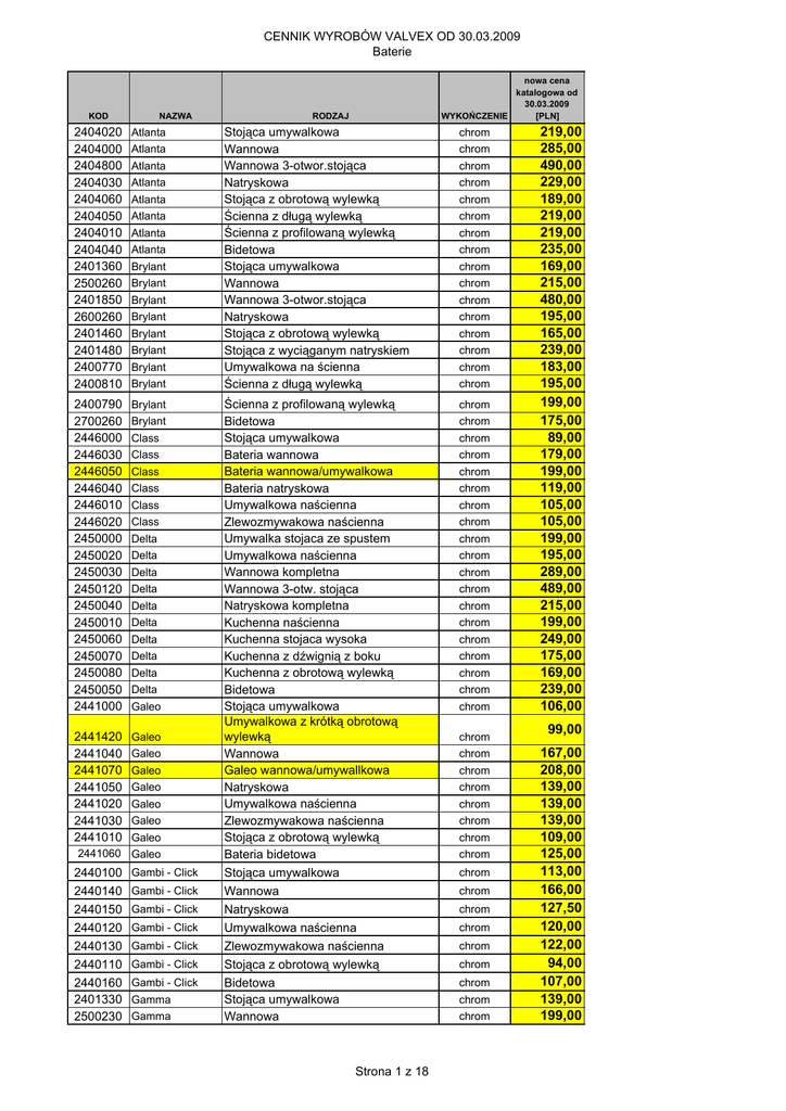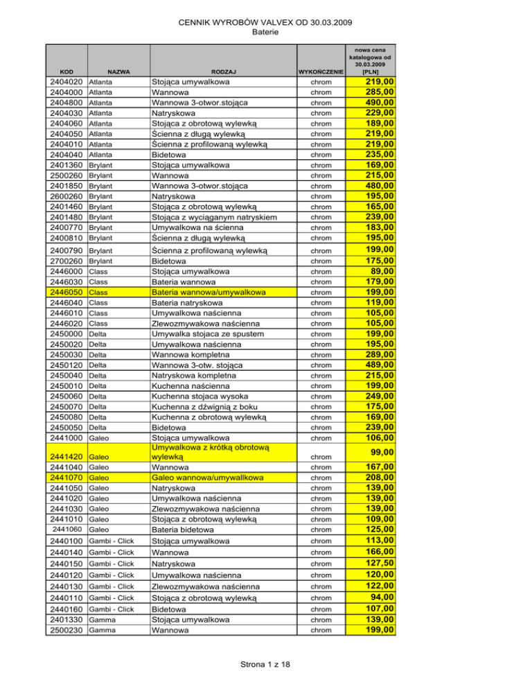 CENNIK WYROBÓW VALVEX OD 30.03.2009 Baterie KOD NAZWA 2404020 2404000 2404800 2404030 2404060 2404050 2404010 2404040 2401360 2500260 2401850 2600260 2401460 2401480 2400770 2400810 Atlanta 2400790 2700260 2446000 2446030 2446050 2446040 2446010 2446020 2450000 2450020 2450030 2450120 2450040 2450010 2450060 2450070 2450080 2450050 2441000 Brylant 2441420 2441040 2441070 2441050 2441020 2441030 2441010 Galeo Atlanta Atlanta Atlanta Atlanta Atlanta Atlanta Atlanta Brylant Brylant Brylant Brylant Brylant Brylant Brylant Brylant Brylant Class Class Class Class Class Class Delta Delta Delta Delta Delta Delta Delta Delta Delta Delta Galeo Galeo Galeo Galeo Galeo Galeo Galeo 2441060 Galeo 2440100 2440140 2440150 2440120 2440130 2440110 2440160 2401330 2500230 Gambi - Click Gambi - Click Gambi - Click Gambi - Click Gambi - Click Gambi - Click Gambi - Click Gamma Gamma nowa cena katalogowa od 30.03.2009 [PLN] WYKOŃCZENIE RODZAJ Stojąca umywalkowa Wannowa Wannowa 3-otwor.stojąca Natryskowa Stojąca z obrotową wylewką Ścienna z długą wylewką Ścienna z profilowaną wylewką Bidetowa Stojąca umywalkowa Wannowa Wannowa 3-otwor.stojąca Natryskowa Stojąca z obrotową wylewką Stojąca z wyciąganym natryskiem Umywalkowa na ścienna Ścienna z długą wylewką chrom Ścienna z profilowaną wylewką Bidetowa Stojąca umywalkowa Bateria wannowa Bateria wannowa/umywalkowa Bateria natryskowa Umywalkowa naścienna Zlewozmywakowa naścienna Umywalka stojaca ze spustem Umywalkowa naścienna Wannowa kompletna Wannowa 3-otw. stojąca Natryskowa kompletna Kuchenna naścienna Kuchenna stojaca wysoka Kuchenna z dźwignią z boku Kuchenna z obrotową wylewką Bidetowa Stojąca umywalkowa Umywalkowa z krótką obrotową wylewką Wannowa Galeo wannowa/umywallkowa Natryskowa Umywalkowa naścienna Zlewozmywakowa naścienna Stojąca z obrotową wylewką Bateria bidetowa Stojąca umywalkowa Wannowa Natryskowa Umywalkowa naścienna Zlewozmywakowa naścienna Stojąca z obrotową wylewką Bidetowa Stojąca umywalkowa Wannowa chrom Strona 1 z 18 chrom chrom chrom chrom chrom chrom chrom chrom chrom chrom chrom chrom chrom chrom chrom chrom chrom chrom chrom chrom chrom chrom chrom chrom chrom chrom chrom chrom chrom chrom chrom chrom chrom chrom chrom chrom chrom chrom chrom chrom chrom chrom chrom chrom chrom chrom chrom chrom chrom chrom 219,00 285,00 490,00 229,00 189,00 219,00 219,00 235,00 169,00 215,00 480,00 195,00 165,00 239,00 183,00 195,00 199,00 175,00 89,00 179,00 199,00 119,00 105,00 105,00 199,00 195,00 289,00 489,00 215,00 199,00 249,00 175,00 169,00 239,00 106,00 99,00 167,00 208,00 139,00 139,00 139,00 109,00 125,00 113,00 166,00 127,50 120,00 122,00 94,00 107,00 139,00 199,00 CENNIK WYROBÓW VALVEX OD 30.03.2009 Baterie KOD 2600230 2401430 2400660 2400730 2700230 2408030 2408000 2408010 2408040 2408020 2408060 2408050 2443100 2443160 2443170 2443130 2443140 2443150 2443110 2443120 2443180 2450500 2450550 2450520 2450540 2450580 2450590 2450530 2450560 2450570 2450510 2446520 2446530 2446550 2446540 2446510 2446500 2423050 2423000 2423020 2423030 2423040 2423080 2423090 2423010 2423070 2401300 2500200 2600200 2401400 2400700 2400630 2700200 2444000 2444060 NAZWA Gamma Gamma Gamma Gamma Gamma Gemini Gemini Gemini Gemini Gemini Gemini Gemini Grafit - Click Grafit - Click Grafit - Click Grafit - Click Grafit - Click Grafit - Click Grafit - Click Grafit - Click Grafit - Click Grande Grande Grande Grande Grande Grande Grande Grande Grande Grande Krystal Krystal Krystal Krystal Krystal Krystal Neva Neva Neva Neva Neva Neva Neva Neva Neva Retro Retro Retro Retro Retro Retro Retro Rubin Rubin nowa cena katalogowa od 30.03.2009 [PLN] WYKOŃCZENIE RODZAJ Natryskowa Stojąca z obrotową wylewką Zlewozmywakowa naścienna Umywalkowa naścienna Bidetowa Umywalkowa stojąca Wannowa Natryskowa Stojąca z obrotową wylewką Zlewozmywakowa naścienna Umywalkowa naścienna Bidetowa Stojąca umywalkowa Wannowa Natryskowa Umywalkowa naścienna Zlewozmywakowa naścienna Ścienna z profilowaną wylewką Stojąca z obrotową wylewką Stojąca z wyciąganym natryskiem Bidetowa Umywalkowa stojąca ze spustem Umywalkowa naścienna Wannowa kompletna Natryskowa kompletna Kuchenna wysoka Kuchenna wz wyciąganym natryskiem Kuchenna z obrotową wylewką Kuchenna naścienna Kuchenna z dźwignią z boku Bidetowa ze spustem Stojąca umywalkowa Wannowa Bateria wannowa/umywalkowa Natryskowa Umywalkowa naścienna Zlewozmywakowa naścienna Umywalka stojąca Wannowa Natryskowa Umywalkowa 3 otwo Umywalkowa ścienna Kuchenna ścienna Kuchenna stojąca Wannowa 4 otworowa Bidetowa Stojąca umywalkowa Wannowa Natryskowa Stojąca z obrotową wylewką Umywalkowa naścienna Zlewozmywakowa naścienna Bidetowa Stojąca umywalkowa Wannowa Strona 2 z 18 chrom chrom chrom chrom chrom chrom chrom chrom chrom chrom chrom chrom chrom chrom chrom chrom chrom chrom chrom chrom chrom chrom chrom chrom chrom chrom chrom chrom chrom chrom chrom chrom chrom chrom chrom chrom chrom chrom chrom chrom chrom chrom chrom chrom chrom chrom chrom chrom chrom chrom chrom chrom chrom chrom chrom 159,00 129,00 150,00 150,00 145,00 132,00 179,00 162,00 122,00 166,00 159,00 153,00 139,00 199,00 159,00 163,00 165,00 175,00 169,00 259,00 145,00 199,90 215,00 285,00 219,00 219,00 249,00 179,00 225,00 249,00 225,00 92,00 182,00 202,00 122,00 108,00 108,00 231,00 282,50 251,00 325,00 272,00 220,00 230,00 944,00 221,00 175,00 230,00 159,00 135,00 119,00 119,00 169,00 159,00 199,00 CENNIK WYROBÓW VALVEX OD 30.03.2009 Baterie KOD 2444070 2444020 2444030 2444040 2444050 2444010 NAZWA nowa cena katalogowa od 30.03.2009 [PLN] WYKOŃCZENIE RODZAJ Natryskowa Stojąca z wyciąganym natryskiem Umywalkowa naścienna Zlewozmywakowa naścienna Ścienna z profilowaną wylewką Stojąca z obrotową wylewką chrom 2449000 Termostatyczne Umywalkowa stojąca chrom 2449010 Termostatyczne Wannowa b/a chrom 2449020 2448000 2448010 2448020 2422020 2422000 2422010 2422030 2422040 2422050 24220