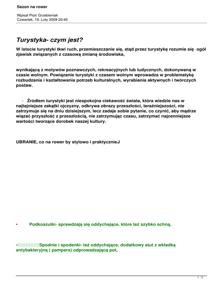 Sezon na rower Wpisał Piotr Grzebieniak Czwartek, 19. Luty 2009 20:45 Turystyka- czym jest? W istocie turystyki tkwi ruch, przemieszczanie się, stąd przez turystykę rozumie się ogół zjawisk związanych z czasową zmianą środowiska, wynikającą z motywów poznawczych, rekreacyjnych lub ludycznych, dokonywaną w czasie wolnym. Powiązanie turystyki z czasem wolnym wprowadza w problematykę rozbudzania i kształtowania potrzeb kulturalnych, wyrabiania aktywnych i twórczych postaw. - Źródłem turystyki jest niespokojna ciekawość świata, która wiedzie nas w najtajniejsze zakątki ojczyzny, odkrywa obrazy przeszłości, teraźniejszości, nie zatrzymuje się na dniu dzisiejszym, lecz zadaje sobie pytanie, co czynić, aby mądrze wiązać przyszłość z przeszłością, nie zatrzymując czasu, zatrzymać najcenniejsze wartości tworzące dorobek naszej kultury. UBRANIE, co na rower by stylowo i praktycznieJ • Podkoszulki- sprawdzają się oddychające, które też szybko schną, • Spodnie i spodenki- też oddychające, dodatkowy atut z wkładką antybakteryjną ( pampers) odprowadzającą pot, 1/6 Sezon na rower Wpisał Piotr Grzebieniak Czwartek, 19. Luty 2009 20:45 • Bluza- cienka i gruba w zależności od pogody, • Kurtka i spodnie przeciwdeszczowe- czasem może padaćJ, • Buty- wygodne, dobrze dopasowane do nogi, • Okulary- ochrona dla oczu przed wiatrem, słońcem, owadami i nie tolerowanymi gośćmi, • Kamizelka odblaskowa- fajnie jak Cię widzą • Rękawiczki rowerowe- wygoda, lans, w razie wywrotki chroni dłoń, • Okrycie głowy (chustka, czapka itp..)- chroni przed słońcem, • Kask- „od kasku głowa nie boli” NARZĘDZIA 2/6 Sezon na rower Wpisał Piotr Grzebieniak Czwartek, 19. Luty 2009 20:45 • Dętki, łatki- zapas zawsze się przyda, • Pompk a- patrz punkt wyżej J • Klucze- imbusy do kupienia w zestawach, płaskie( roz. 5-13), • Olej do łańcucha- nie lubimy jak nam skrzypi, • Oświetlenie • Licznik- by nie pytać: „ daleko jeszcze?” • Szmatka do czyszczenia łańcucha, DODATKOWE WYPOSAŻENIE 3/6 Sezon na rower Wpisał Piotr Grzebieniak Czwartek, 19. Luty 2009 20:45 • APARAT FOTO- by mieć na naszą klasę wspomnieniaJ, • BATERIE, • BIDON (Y)- na wzmocnienie, • LATARKA- nie wiadomo kiedy się wróci, • PREPARATY PRZECIW OWADOM- w trasie nie ma czasu na drapanie, • APTECZKA- osobista: plastry, opaski dziane i elastyczne, chusta trójkątna, • KREM NATŁUSZCZAJĄCY- ewentualnie opalający zależy od pory roku, • MAPĘ TERENU- chyba ważne a może 4/6 Sezon na rower Wpisał Piotr Grzebieniak Czwartek, 19. Luty 2009 20:45 najważniejsze, CZASEM PRZYDA SIĘ PARE DROBNYCH ZŁOTÓWEKmożemy nie mieć sił na powrót wtedy mozemy kupić jakis bilecik:) PRZED WYRUSZENIEM W TRASĘ: - sprawdź czy są dokręcone wszystkie koła, - sprawdź czy masz dobrze ustawione hamulce- przetrzyj obręcz z powłoki, która wytwarza się podczas hamowania, może ona obiniżyć szybkość hamowania, - ustaw i wereguluj przerzutki- pomoże to w szybkiej zmianie przełożeń, - nasmaruj łańcuch- wydłuży to jego żywotność, 5/6 Sezon na rower Wpisał Piotr Grzebieniak Czwartek, 19. Luty 2009 20:45 - sprawdż oświetlenie, - sprawdź inne śruby mocujace- kierownice, pedały, korbę, itp. ŻYCZYMY UDANYCH WYPRAW ROWEROWYCH I SILNEGO WIATRU W PLECY:) Chcesz dowiedzieć się więcej napisz gg 12041933 6/6