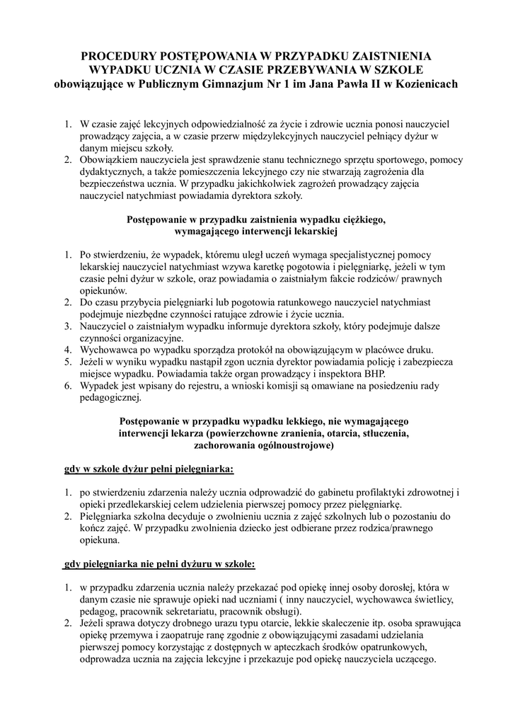 PROCEDURY POSTĘPOWANIA W PRZYPADKU ZAISTNIENIA WYPADKU UCZNIA W CZASIE PRZEBYWANIA W SZKOLE obowiązujące w Publicznym Gimnazjum Nr 1 im Jana Pawła II w Kozienicach 1. W czasie zajęć lekcyjnych odpowiedzialność za życie i zdrowie ucznia ponosi nauczyciel prowadzący zajęcia, a w czasie przerw międzylekcyjnych nauczyciel pełniący dyżur w danym miejscu szkoły. 2. Obowiązkiem nauczyciela jest sprawdzenie stanu technicznego sprzętu sportowego, pomocy dydaktycznych, a także pomieszczenia lekcyjnego czy nie stwarzają zagrożenia dla bezpieczeństwa ucznia. W przypadku jakichkolwiek zagrożeń prowadzący zajęcia nauczyciel natychmiast powiadamia dyrektora szkoły. Postępowanie w przypadku zaistnienia wypadku ciężkiego, wymagającego interwencji lekarskiej 1. Po stwierdzeniu, że wypadek, któremu uległ uczeń wymaga specjalistycznej pomocy lekarskiej nauczyciel natychmiast wzywa karetkę pogotowia i pielęgniarkę, jeżeli w tym czasie pełni dyżur w szkole, oraz powiadamia o zaistniałym fakcie rodziców/ prawnych opiekunów. 2. Do czasu przybycia pielęgniarki lub pogotowia ratunkowego nauczyciel natychmiast podejmuje niezbędne czynności ratujące zdrowie i życie ucznia. 3. Nauczyciel o zaistniałym wypadku informuje dyrektora szkoły, który podejmuje dalsze czynności organizacyjne. 4. Wychowawca po wypadku sporządza protokół na obowiązującym w placówce druku. 5. Jeżeli w wyniku wypadku nastąpił zgon ucznia dyrektor powiadamia policję i zabezpiecza miejsce wypadku. Powiadamia także organ prowadzący i inspektora BHP. 6. Wypadek jest wpisany do rejestru, a wnioski komisji są omawiane na posiedzeniu rady pedagogicznej. Postępowanie w przypadku wypadku lekkiego, nie wymagającego interwencji lekarza (powierzchowne zranienia, otarcia, stłuczenia, zachorowania ogólnoustrojowe) gdy w szkole dyżur pełni pielęgniarka: 1. po stwierdzeniu zdarzenia należy ucznia odprowadzić do gabinetu profilaktyki zdrowotnej i opieki przedlekarskiej celem udzielenia pierwszej pomocy przez pielęgniarkę. 2. Pielęgniarka szkolna decyduje o zwolnieniu ucznia z zajęć szkolnych lub o pozostaniu do kończ zajęć. W przypadku zwolnienia dziecko jest odbierane przez rodzica/prawnego opiekuna. gdy pielęgniarka nie pełni dyżuru w szkole: 1. w przypadku zdarzenia ucznia należy przekazać pod opiekę innej osoby dorosłej, która w danym czasie nie sprawuje opieki nad uczniami ( inny nauczyciel, wychowawca świetlicy, pedagog, pracownik sekretariatu, pracownik obsługi). 2. Jeżeli sprawa dotyczy drobnego urazu typu otarcie, lekkie skaleczenie itp. osoba sprawująca opiekę przemywa i zaopatruje ranę zgodnie z obowiązującymi zasadami udzielania pierwszej pomocy korzystając z dostępnych w apteczkach środków opatrunkowych, odprowadza ucznia na zajęcia lekcyjne i przekazuje pod opiekę nauczyciela uczącego. 3. W przypadku poważniejszego zdarzenia typu stłuczenie, skręcenie mocne uderzenie, złe samopoczucie wskazujące na niemożliwość dalszego pobytu ucznia na zajęciach osoba sprawująca opiekę wzywa rodzica/ prawnego opiekuna z prośbą o odebranie dziecka ze szkoły. 4. Uczeń musi przebywać pod opieką osoby dorosłej do chwili przekazania go rodzicom/ prawnym opiekunom lub innej osobie wskazanej przez rodzica. Postanowienia ogólne 1. Osoba sprawująca opiekę nie może podawać żadnych leków poszkodowanemu. Do udzielenia pierwszej pomocy może stosować tylko dostępne środki opatrunkowe. 2. W momencie pogorszenia się stanu zdrowia ucznia zawsze bezzwłocznie należy wezwać pogotowie – telefon 999 lub 112, oraz powiadomić rodziców ucznia o zdarzeniu. 3. Fakt wezwania pogotowia, wezwania lub kontaktu z rodzicem osoba podejmująca działanie jest zobowiązana wpisać do zeszytu zdarzeń znajdującym się w sekretariacie szkoły. 4. Klucz do gabinetu pomocy przedmedycznej znajduje się w sekretariacie szkoły i u pedagoga szkolnego.