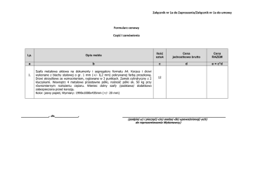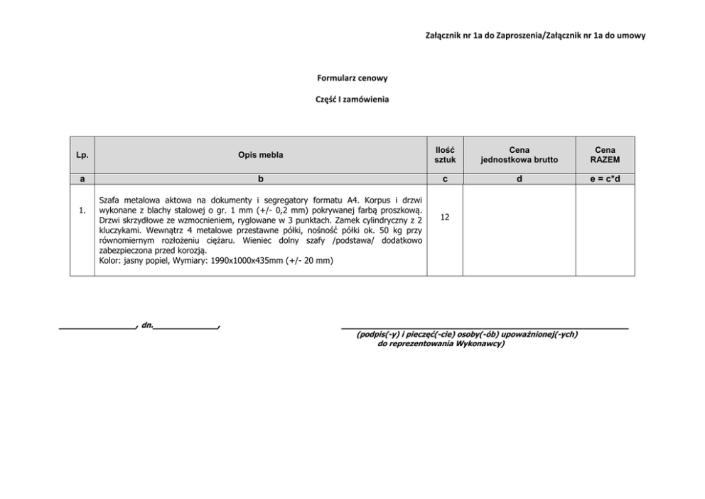 Załącznik nr 1a do Zaproszenia/Załącznik nr 1a do umowy Formularz cenowy Część I zamówienia Lp. Opis mebla Ilość sztuk Cena jednostkowa brutto Cena RAZEM a b c d e = c*d 1. Szafa metalowa aktowa na dokumenty i segregatory formatu A4. Korpus i drzwi wykonane z blachy stalowej o gr. 1 mm (+/- 0,2 mm) pokrywanej farbą proszkową. Drzwi skrzydłowe ze wzmocnieniem, ryglowane w 3 punktach. Zamek cylindryczny z 2 kluczykami. Wewnątrz 4 metalowe przestawne półki, nośność półki ok. 50 kg przy równomiernym rozłożeniu ciężaru. Wieniec dolny szafy /podstawa/ dodatkowo zabezpieczona przed korozją. Kolor: jasny popiel, Wymiary: 1990x1000x435mm (+/- 20 mm) _____________, dn.___________, 12 _________________________________________________ (podpis(-y) i pieczęć(-cie) osoby(-ób) upoważnionej(-ych) do reprezentowania Wykonawcy) Załącznik nr 1b do Zaproszenia/Załącznik nr 1b do umowy Formularz cenowy Część II zamówienia Lp. Ilość sztuk Opis mebla a b c 1. Krzesło konferencyjne, miękkie tapicerowane siedzisko i oparcie (tkanina mikro). Solidna, metalowa, lakierowana rama krzesła. Możliwość składowania kilku krzeseł w stosie. Kolor: czarny. 19 2. Krzesło obrotowe tapicerowane (tkanina mikro), z mechanizmem regulowania wysokości krzesła i oparcia. Blokada oparcia w dowolnej pozycji. Komfortowe siedzisko i ergonomicznie wyprofilowane oparcie. Kółka do powierzchni dywanowych. Wygodne, stałe podłokietniki. Wymiary siedziska ok: głębokość 53,5 cm, szerokość 50,5 cm, wysokość 43-53 cm. Kolory: 4 krzesła w kolorze szarym, 13 krzeseł w kolorze czarnym. 17 3. Biurko proste płytowe - blat i boki z płyty wiórowej melaminowanej, grubość blatu 25mm (+/- 3 mm). Płyta o strukturze zapewniającej trwałość i gładkość powierzchni roboczej blatu, klasa higieny E1. Wąskie płaszczyzny zabezpieczone okleiną PCV. Kolor: calvados. Wymiary: 120 x 70 x 75cm (+/- 2 cm). 4 4. Kontener mobilny 3-szufladowy (tej samej wielkości) na 4 kółkach, korpusy wykonane z płyty wiórowej melaminowanej o grubości min. 18mm, wypełnienie kontenerów płytowe - szuflady wykonane z płyty o grubości min. 18mm, dno szuflady wykonane z płyty o grubości min. 3mm, fronty szuflad zewnętrzne wykonane z płyty o grubości min. 18mm oklejone PCV min. 0,6mm (+/- 0,2 mm), kontener musi posiadać zamek centralny umożliwiający jednoczesne zamknięcie wszystkich szuflad. Kolor: calvados. Wymiary: 57 x 40 x 50cm (+/- 2 cm). 4 5. Biurko pełne z płyty wiórowej melaminowanej. Grubość blatu min. 25mm, reszty min. 18mm. Biurko musi posiadać po prawej stronie półkę (wnękę o wymiarach: długość 65 cm, szerokość 40 cm, wysokość 15 cm (+/- 2 cm)) a pod nią zamykaną szafkę (o 4 Cena jednostkowa brutto d Cena RAZEM e = c*d wymiarach: długość 65 cm, szerokość 40 cm, wysokość 50 cm (+/- 2 cm)). Wąskie płaszczyzny zabezpieczone okleiną PCV. Kolor: grusza dzika. Wymiary: 140 x 70 x 74cm (+/- 2 cm). 6. Biurko proste na nogach okrągłych stelaż metalowy ramowy w kolorze srebrnym, blat o grubości min. 25 mm, wykonany z płyty wiórowej melaminowanej, wąskie płaszczyzny zabezpieczone okleiną PCV, przelotka na kable w blacie, biurko wyposażone w stopki umożliwiające regulację wysokości blatu. Kolor stelaża: srebrny, kolor blatu: olcha. Wymiary: 160 x 70 x 74 cm (+/- 2 cm). 10 7. Kontener mobilny na 4 kółkach z zamykaną na kluczyk szufladą i szafką. Korpusy wykonane z płyty wiórowej melaminowanej, boki z płyty o gr. min. 18mm, wieńce z płyty o gr. min. 25mm, wypełnienie kontenerów płytowe - szuflada wykonana z płyty o gr. min.18mm. Kolor: olcha. Wymiary: 60 x 43 x 50 cm (+/- 2 cm). 11 8. Biurko prostokątne prawostronne - blat osadzony na dwóch metalowych nogach i szafce z wnęką i drzwiami z zamkiem na kluczyk. Biurko musi posiadać estetyczny szeroki dolny panel kryjący /osłonę/ w kolorze blatu. Biurko wykonane w całości z płyty meblowej o grubości min. 18 mm. Krawędzie wykończone są okleiną PCV. Kolor: olcha. Wymiary: 140 x 70 x 75h cm (+/- 2 cm). 1 9. Zestaw recepcyjny (lada + nadstawka). Blat lady wykonany z płyty min. 18 mm oklejony obrzeżem PCV min. 2 mm. Nadstawka lady wykonana z płyty min. 18 mm, oklejona obrzeżem PCV min. 2 mm. Stelaż wykonany z płyty min. 18 mm i oklejony obrzeżem PCV min. 0,6 mm, płyta dwustronnie laminowana. Kolor zestawu: olcha. Wymiary: 160 x 70 x 115 cm (+/- 2 cm). Front zestawu musi tworzyć wizualnie zamkniętą całość ( tj. płyta od podłogi do szczytu lady, bez „prześwitów”) Mile widziane wstawki estetyczne typu poziome listwy w kolorze aluminium lub chromu lub inne zaakceptowane przez Zamawiającego. Szerokość lady w górnej części musi umożliwiać swobodne położenia na niej kartek formatu A4. Zestawy typu: Lada recepcyjna z nadstawką HAWANA "L" lub równoważny. 1 _____________, dn.___________, _________________________________________________ (podpis(-y) i pieczęć(-cie) osoby(-ób) upoważnionej(-ych) do reprezentowania Wykonawcy)