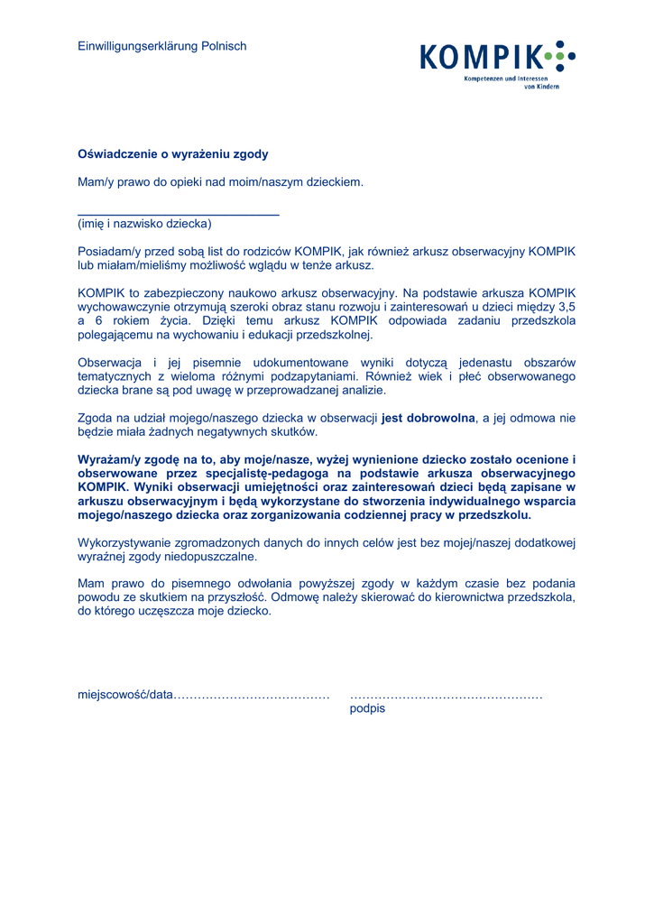 Einwilligungserklärung Polnisch Oświadczenie o wyrażeniu zgody Mam/y prawo do opieki nad moim/naszym dzieckiem. ______________________________ (imię i nazwisko dziecka) Posiadam/y przed sobą list do rodziców KOMPIK, jak również arkusz obserwacyjny KOMPIK lub miałam/mieliśmy możliwość wglądu w tenże arkusz. KOMPIK to zabezpieczony naukowo arkusz obserwacyjny. Na podstawie arkusza KOMPIK wychowawczynie otrzymują szeroki obraz stanu rozwoju i zainteresowań u dzieci między 3,5 a 6 rokiem życia. Dzięki temu arkusz KOMPIK odpowiada zadaniu przedszkola polegającemu na wychowaniu i edukacji przedszkolnej. Obserwacja i jej pisemnie udokumentowane wyniki dotyczą jedenastu obszarów tematycznych z wieloma różnymi podzapytaniami. Również wiek i płeć obserwowanego dziecka brane są pod uwagę w przeprowadzanej analizie. Zgoda na udział mojego/naszego dziecka w obserwacji jest dobrowolna, a jej odmowa nie będzie miała żadnych negatywnych skutków. Wyrażam/y zgodę na to, aby moje/nasze, wyżej wynienione dziecko zostało ocenione i obserwowane przez specjalistę-pedagoga na podstawie arkusza obserwacyjnego KOMPIK. Wyniki obserwacji umiejętności oraz zainteresowań dzieci będą zapisane w arkuszu obserwacyjnym i będą wykorzystane do stworzenia indywidualnego wsparcia mojego/naszego dziecka oraz zorganizowania codziennej pracy w przedszkolu. Wykorzystywanie zgromadzonych danych do innych celów jest bez mojej/naszej dodatkowej wyraźnej zgody niedopuszczalne. Mam prawo do pisemnego odwołania powyższej zgody w każdym czasie bez podania powodu ze skutkiem na przyszłość. Odmowę należy skierować do kierownictwa przedszkola, do którego uczęszcza moje dziecko. miejscowość/data………………………………… ………………………………………… podpis