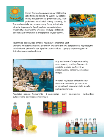 Firma Tomarchio powstała w 1920 roku jako firma rodzinna na Sycylii w Katanii, małej miejscowość u podnóża Etny. Trzy pokolenia właścicieli Firmy sprawiły, że Tomarchio stała się nowoczesną firmą jednak nie utraciła tego co dla Sycylijczyków najważniejszewspaniały smak wierny włoskiej tradycji i składniki pochodzące wyłącznie z przepięknej wyspy Sycylii. Tajemnicą osobliwego smaku napojów Tomarchio jest unikalna mieszanka wody z podnóży wulkanu Etna w połączeniu z najlepszymi składnikami, jakie oferuje Sycylia : pomarańcze i cytryny dojrzewające w śródziemnomorskim słońcu. Aby zaoferować niepowtarzalny asortyment, rodzina Tomarchio podjęła podróż po Sycylii w poszukiwaniu kolorów, smaków i miejsc. Wybrali najlepsze składniki a ich staranne dobranie przy użyciu oryginalnych receptur stało się dla nich priorytetem. Popijając napoje Tomarchio i zamykając autentyczne doświadczenie Sycylii. oczy, poczujemy najbardziej Czerwona Pomarańcza – Aranciata Rossa Produkowana wyłącznie z naturalnych składników lokalnych, nasza soda ma głęboki czerwony kolor, intensywnie pomarańczowy zapach i doskonałą równowagę słodkiego i cierpkiego smaku. Podstawą produktu jest sok z pomarańczy “sanguinello” (chroniony status geograficzny) - 16% zawartości soku. Odmiana pomarańczy, która rośnie na wulkanicznej glebie Etny. Zaskakująco orzeźwiający smak z najlepszych cytryn "Femminello" (lokalne odmiany). Nie przetworzona, nie zbyt słodka, idealna sycylijska Lemoniada - 12% soku. CHINOTTO - klasyczna, włoska cola na bazie soku z gorzkiej pomarańczy Chinotto. Oryginalny, włoski smak. Niepowtarzalna, sycylijska receptura.