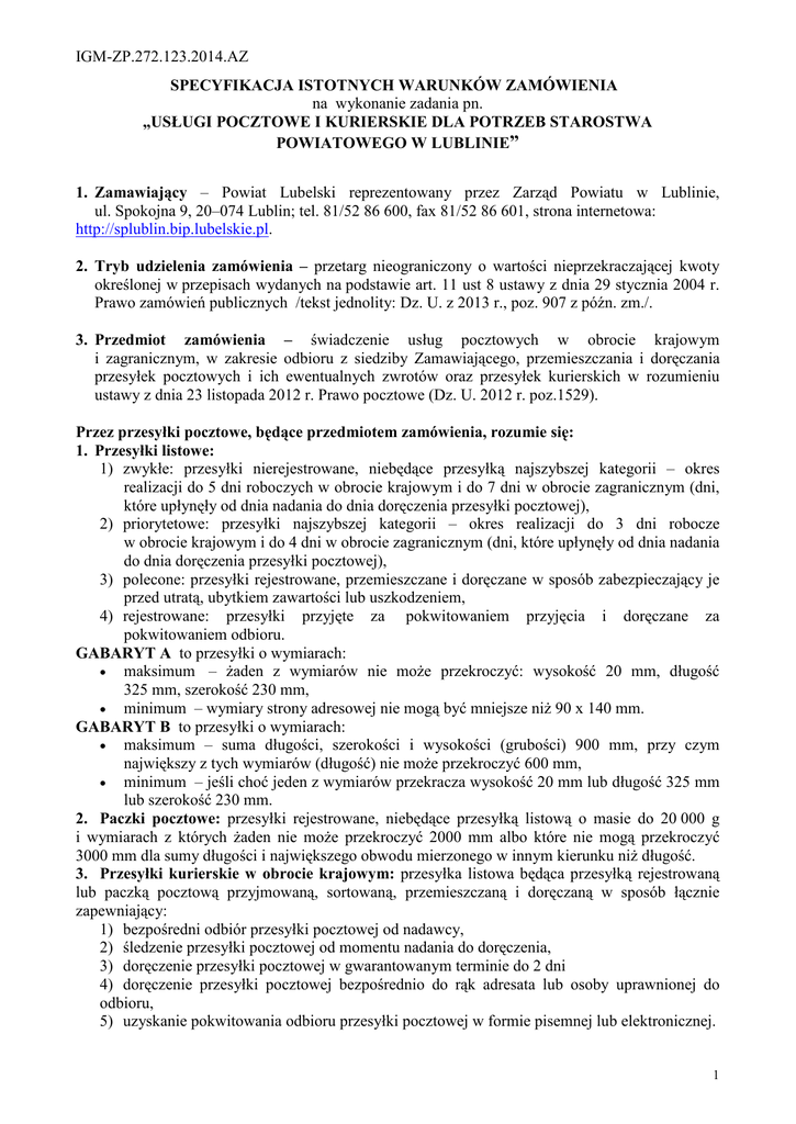 IGM-ZP.272.123.2014.AZ SPECYFIKACJA ISTOTNYCH WARUNKÓW ZAMÓWIENIA na wykonanie zadania pn. „USŁUGI POCZTOWE I KURIERSKIE DLA POTRZEB STAROSTWA POWIATOWEGO W LUBLINIE” 1. Zamawiający – Powiat Lubelski reprezentowany przez Zarząd Powiatu w Lublinie, ul. Spokojna 9, 20–074 Lublin; tel. 81/52 86 600, fax 81/52 86 601, strona internetowa: http://splublin.bip.lubelskie.pl. 2. Tryb udzielenia zamówienia – przetarg nieograniczony o wartości nieprzekraczającej kwoty określonej w przepisach wydanych na podstawie art. 11 ust 8 ustawy z dnia 29 stycznia 2004 r. Prawo zamówień publicznych /tekst jednolity: Dz. U. z 2013 r., poz. 907 z późn. zm./. 3. Przedmiot zamówienia – świadczenie usług pocztowych w obrocie krajowym i zagranicznym, w zakresie odbioru z siedziby Zamawiającego, przemieszczania i doręczania przesyłek pocztowych i ich ewentualnych zwrotów oraz przesyłek kurierskich w rozumieniu ustawy z dnia 23 listopada 2012 r. Prawo pocztowe (Dz. U. 2012 r. poz.1529). Przez przesyłki pocztowe, będące przedmiotem zamówienia, rozumie się: 1. Przesyłki listowe: 1) zwykłe: przesyłki nierejestrowane, niebędące przesyłką najszybszej kategorii – okres realizacji do 5 dni roboczych w obrocie krajowym i do 7 dni w obrocie zagranicznym (dni, które upłynęły od dnia nadania do dnia doręczenia przesyłki pocztowej), 2) priorytetowe: przesyłki najszybszej kategorii – okres realizacji do 3 dni robocze w obrocie krajowym i do 4 dni w obrocie zagranicznym (dni, które upłynęły od dnia nadania do dnia doręczenia przesyłki pocztowej), 3) polecone: przesyłki rejestrowane, przemieszczane i doręczane w sposób zabezpieczający je przed utratą, ubytkiem zawartości lub uszkodzeniem, 4) rejestrowane: przesyłki przyjęte za pokwitowaniem przyjęcia i doręczane za pokwitowaniem odbioru. GABARYT A to przesyłki o wymiarach: • maksimum – Ŝaden z wymiarów nie moŜe przekroczyć: wysokość 20 mm, długość 325 mm, szerokość 230 mm, • minimum – wymiary strony adresowej nie mogą być mniejsze niŜ 90 x 140 mm. GABARYT B to przesyłki o wymiarach: • maksimum – suma długości, szerokości i wysokości (grubości) 900 mm, przy czym największy z tych wymiarów (długość) nie moŜe przekroczyć 600 mm, • minimum – jeśli choć jeden z wymiarów przekracza wysokość 20 mm lub długość 325 mm lub szerokość 230 mm. 2. Paczki pocztowe: przesyłki rejestrowane, niebędące przesyłką listową o masie do 20 000 g i wymiarach z których Ŝaden nie moŜe przekroczyć 2000 mm albo które nie mogą przekroczyć 3000 mm dla sumy długości i największego obwodu mierzonego w innym kierunku niŜ długość. 3. Przesyłki kurierskie w obrocie krajowym: przesyłka listowa będąca przesyłką rejestrowaną lub paczką pocztową przyjmowaną, sortowaną, przemieszczaną i doręczaną w sposób łącznie zapewniający: 1) bezpośredni odbiór przesyłki pocztowej od nadawcy, 2) śledzenie przesyłki pocztowej od momentu nadania do doręczenia, 3) doręczenie przesyłki pocztowej w gwarantowanym terminie do 2 dni 4) doręczenie przesyłki pocztowej bezpośrednio do rąk adresata lub osoby uprawnionej do odbioru, 5) uzyskanie pokwitowania odbioru przesyłki pocztowej w formie pisemnej lub elektronicznej. 1 IGM-ZP.272.123.2014.AZ Cz. I - świadczenie usług pocztowych w obrocie krajowym i zagranicznym, w zakresie przyjmowania, przemieszczania i doręczania przesyłek listowych i ich ewentualnych zwrotów w siedzibie Starostwa Powiatowego w Lublinie przy ul. Spokojnej 9 za pomocą e-frankownicy NEOPOST IJ 40, działającej w systemie zdalnego doładowywania oraz paczek pocztowych. 1) Opłata za przesyłki listowe będzie naliczana przy uŜyciu ww. maszyny do frankowania a w czasie jej przestoju, spowodowanego ewentualną awarią oraz za wysyłkę paczek pocztowych w formie opłaty z dołu. 2) Zamawiający nie dopuszcza moŜliwości innego, niŜ za pomocą e-frankownicy NEOPOST IJ 40 sposobu realizacji zamówienia. 3) Dostarczanie przesyłek kaŜdego roboczego dnia tygodnia od poniedziałku do piątku do siedziby Starostwa Powiatowego przy ul. Spokojnej 9 w Lublinie nie później niŜ do godz. 1000. 4) Odbiór przesyłek - kaŜdego roboczego dnia tygodnia od poniedziałku do piątku z siedziby Starostwa Powiatowego przy ul. Spokojnej 9 w Lublinie w godzinach 14:00 – 15:00. 5) Odbiór przesyłek odbywa się na podstawie wydruku z Elektronicznego rejestru korespondencji Zamawiającego. Wykaz sporządzony będzie w dwóch egzemplarzach – jeden dla Wykonawcy, drugi dla Zamawiającego. 6) Przesyłki wydawać będą pracownicy Zamawiającego obsługujący Kancelarię, odbioru przesyłek dokonywać będzie upowaŜniony przedstawiciel Wykonawcy po okazaniu stosownego upowaŜnienia. 7) Zamawiający będzie korzystał ze wzorów druków potwierdzenia odbioru dostarczanych przez Wykonawcę. Druk potwierdzenia odbioru Wykonawca będzie dostarczał nieodpłatnie. 8) Warunki świadczenia usługi odbioru z siedziby Zamawiającego i przewozu paczek pocztowych: a) paczki dostarczane będą przez Wykonawcę do kaŜdego wskazanego miejsca w kraju w terminach obowiązujących w regulaminie Wykonawcy, b) w terminie dostarczenia do odbiorcy krajowego do 2 dni roboczych od nadania - paczka pocztowa priorytetowa, c) w terminie dostarczenia do odbiorcy krajowego do 3 dni roboczych od nadania - paczka pocztowa ekonomiczna, d) w dostarczenia na terenie Europy do 5 dniu roboczych od nadania - paczka pocztowa priorytetowa. 9) W celu umoŜliwienia adresatowi odbioru (wydania) niedoręczonej pod wskazany adres awizowanej przesyłki rejestrowanej za zwrotnym potwierdzeniem odbioru, Wykonawca zapewni wydawanie przesyłek rejestrowanych w punktach awizacyjnych, które powinny być odpowiednio oznaczone nazwą Wykonawcy oraz powinny zapewniać prawidłowe zabezpieczenie przesyłek przed dostępem osób trzecich, w szczególności gwarantować zachowanie tajemnicy pocztowej i ochronę danych