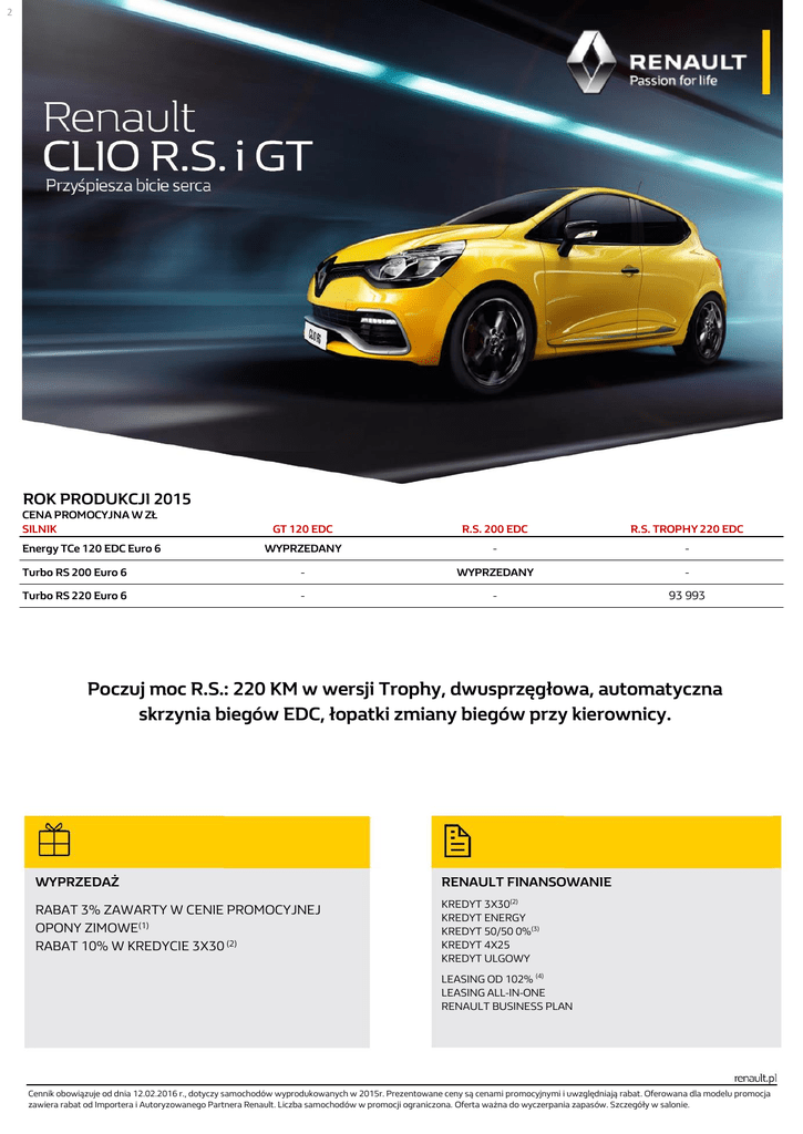 2 ROK PRODUKCJI 2015 CENA PROMOCYJNA W ZŁ SILNIK GT 120 EDC R.S. 200 EDC R.S. TROPHY 220 EDC Energy TCe 120 EDC Euro 6 WYPRZEDANY - - Turbo RS 200 Euro 6 - WYPRZEDANY - Turbo RS 220 Euro 6 - - 93 993 Poczuj moc R.S.: 220 KM w wersji Trophy, dwusprzęgłowa, automatyczna skrzynia biegów EDC, łopatki zmiany biegów przy kierownicy. WYPRZEDAŻ RENAULT FINANSOWANIE RABAT 3% ZAWARTY W CENIE PROMOCYJNEJ OPONY ZIMOWE(1) RABAT 10% W KREDYCIE 3X30 (2) KREDYT 3X30(2) KREDYT ENERGY KREDYT 50/50 0%(3) KREDYT 4X25 KREDYT ULGOWY LEASING OD 102% (4) LEASING ALL-IN-ONE RENAULT BUSINESS PLAN Cennik obowiązuje od dnia 12.02.2016 r., dotyczy samochodów wyprodukowanych w 2015r. Prezentowane ceny są cenami promocyjnymi i uwzględniają rabat. Oferowana dla modelu promocja zawiera rabat od Importera i Autoryzowanego Partnera Renault. Liczba samochodów w promocji ograniczona. Oferta ważna do wyczerpania zapasów. Szczegóły w salonie. GŁÓWNE WYPOSAŻENIE R.S. TROPHY 220 EDC: Oznakowanie TROPHY na progach drzwi Numer egzemplarza serii limitowanej Klimatyzacja regulowana automatycznie Skórzana perforowana kierownica z regulacją w dwóch płaszczyznach Łopatki przy kierownicy sterujące biegami Sportowe zawieszenie Trophy Ozdobne elementy wnętrza w kolorze czerwonym System multimedialny Renault R-LINK Evolution z ekranem dotykowym 7'', nawigacją Carminat TomTom z mapą Europy w wersji rozszerzonej, radioodtwarzaczem z przestrzennym dźwiękiem 3D by Arkamys, Bluetooth, złączem USB i Jack oraz dostępem do informacji na temat samochodu i usług on line Renault R-Sound Effect System R.S. Monitor 2.0 Elementy zewnętrzne w kolorze szarym: ozdobne wstawki w bocznych listwach z oznakowaniem TROPHY, przednia listwa aerodynamiczna F1, Funkcja R.S. DRIVE z 3 trybami pracy: Normal, Sport, Race 18” obręcze kół ze stopu metali lekkich w kolorze srebrno-czarnym z diamentowym połyskiem POZOSTAŁE WYPOSAŻENIE: Karta Renault Hands Free System dynamicznej kontroli toru jazdy ESC z systemem zapobiegania poślizgowi kół ASR ( z możliwością wyłączenia) System wspomagania ruszania pod górę(Hill Start Assist) Czołowe i boczne poduszki powietrzne Czujnik światła i deszczu Regulator-ogranicznik prędkości Elektrycznie regulowane szyby przednie i tylne Lusterka boczne elektrycznie składane Światła do jazdy dziennej typu LED Szyby tylne boczne i tylna przyciemniane Fotel kierowcy z regulacją wysokości Tylna kanapa dzielona w układzie 1/3-2/3 Światła do jazdy dziennej typu LED Zestaw do naprawy opon GT R.S. R.S. TROPHY ABS z systemem wspomagania nagłego hamowania ● ● ● Przednie poduszki powietrzne kierowcy i pasażera ● ● ● Dezaktywacja poduszki powietrznej pasażera z przodu ● ● ● Boczne poduszki powietrzne ● ● ● Regulator - ogranicznik prędkości ● ● ● System wspomagania ruszania pod górę (Hill Start Assist) System dynamicznej kontroli toru jazdy (ESC) z funkcją zapobiegania poślizgowi kół pędnych przy ruszaniu (ASR) - możliwy do wyłączenia w wersji R.S. ● ● ● ● ● ● Sygnał niezapiętych pasów bezpieczeństwa (na wszystkich miejscach) ● ● ● Przednie pasy bezpieczeństwa z regulacją wysokości, ogranicznikiem napięcia i napinaczem ● ● ● Tylne pasy bezpieczeństwa: 3-punktowe, z ogranicznikami napięcia na bocznych miejscach ● ● ● System mocowania fotelików dla dziecka Isofix na bocznych miejscach z tyłu ● ● ● BEZPIECZEŃSTWO CZYNNE I BIERNE WYGLĄD ZEWNĘTRZNY Zawieszenie Sport typowe dla wersji GT ● - - Zawieszenie Sport typowe dla wersji RS - ● - Zawieszenie CUP - P - Zawieszenie Trophy - - ● Czerwone zaciski tarcz hamulcowych - P ● Logo Renault z oznaczeniem GT (wersja GT) lub RS (wersja R.S.) ● ● ● Oznakowanie TROPHY na listwach bocznych oraz progach drzwi - - ● Przedni zderzak z aerodynamiczna listwą przednią w kolorze szarym i światłami LED Przedni zderzak ze światłami LED na szarym tle ( dla nadwozia w kolorze Niebieski Malte i Czarny Etoile; dla pozostałych kolorów w kolorze lśniącej czerni) Boczne listwy ochronne w kolorze nadwozia ze wstawkami w kolorze szarym - ● ● ● - - ● ● ● Dyfuzor w kolorze szarym z wbudowanymi po bokach końcówkami rury wydechowej - ● ● Tylny zderzak z ozdobną listwą w kolorze szarym i chromowaną, podwójną rurą wydechu (ozdobna listwa w przypadku zamówienia kamery cofania) ● - - Obudowy lusterek bocznych w kolorze szarym ● - - Obudowy lusterek bocznych w kolorze lśniącej czerni - ● ● Przednie zewnętrzne klamki drzwi w kolorze nadwozia Przednie zewnętrzne klamki drzwi w kolorze lśniącej czerni lub w kolorze nadwozia (w zależności od koloru nadwozia) ● ● - - - ● Tylne zewnętrzne klamki drzwi ukryte przy tylnym słupku ● ● ● Tylny spojler dachowy ● ● ● Dach i spojler dachowy w kolorze lśniącej czerni (wyłącznie dla koloru nadwozia Mroźna biel o wykończeniu matowym) - - 3200 Szyby tylne boczne i tylna przyciemniane ● ● ● Obręcze kół ze stopu metali lekkich 17" GT ciemnoszare ● - - Obręcze kół ze stopu metali lekkich 17" RS - ● - Obręcze kół ze stopu metali lekkich 18" Radicale (w kolorze czarnym dostępne w pakiecie Cup) - P - Obręcze kół ze stopu metali lekkich 18" Trophy srebrno-czarne z diamentowym połyskiem - - ● 1900/2100/2300 1900/2100/6000 1900/2100/6000 0 0 0 Tonacja grafitowa wnętrza ● ● ● Tapicerka grafitowa z czerwonymi elementami - ● ● 5000 5000 - - - 2000 Lakier metalizowany/ metalizowany specjalny/ metalizowany specjalny GT lub RS Lakier niemetalizowany WYGLĄD WNĘTRZA Tapicerka skórzana Tapicerka skórzana dla wersji TROPHY (dostępna wyłącznie wraz ze specjalnymi sportowymi podgrzewanymi fotelami z wbudowanymi zagłówkami) Tapicerka grafitowo-szara, z elementami skóry ekologicznej ● - - Aluminiowe pedały ● ● ● Listwy progowe z napisem RENAULT SPORT ● ● - Listwy progowe z napisem TROPHY oraz numerem egzemplarza serii limitow