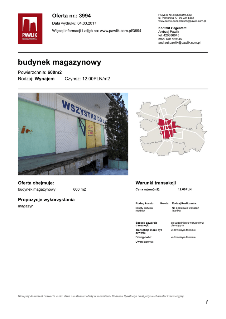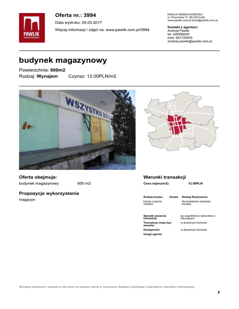 Oferta nr.: 3994 PAWLIK NIERUCHOMOŚCI ul. Pomorska 77, 90-224 Łódź www.pawlik.com.pl [email protected] Data wydruku: 04.03.2017 Więcej informacji i zdjęć na: www.pawlik.com.pl/3994 Kontakt z agentem: Andrzej Pawlik tel: 426386045 mob: 601729545 [email protected] budynek magazynowy Powierzchnia: 600m2 Rodzaj: Wynajem Czynsz: 12.00PLN/m2 Oferta obejmuje: budynek magazynowy Warunki transakcji 600 m2 Propozycje wykorzystania magazyn Cena najmu(m2): Rodzaj kosztu: 12.00PLN Kwota: koszty zużycia mediów Rodzaj Rozliczenia: Na podstawie wskazań licznika Sposób zawarcia transakcji: po uzgodnieniu warunków z oferującym Transakcja może być zawarta: w dowolnym terminie Dostępność: w dowolnym terminie Uwagi agenta: Niniejszy dokument i zawarte w nim dane nie stanowi oferty w rozumieniu Kodeksu Cywilnego i maj jedynie charakter informacyjny. 1 Oferta nr.: 3994 Więcej informacji i zdjęć na: www.pawlik.com.pl/3994 Opis oferty Wolno stojący budynek magazynowy.Dobry dojazd do centrum. Budynek zlokalizowany w sąsiedztwie obiektów handlowo-usługowych związanych z budownictwem. Oferta obejmuje budynek magazynowy Klasa obiektu: Powierzchnia: 600 m2 Stan techniczny: zadowalający Rodzaje powierzchni użytkowych Kondygnacja Rodzaj powierzchni Powierzchnia Liczba pomieszczeń Parter magazynowy 1100.00 m2 6 Kondygnacja Charakter powierzchni Powierzchnia Podłoga Parter magazynowy 1100.00 m2 Standard Ściana Sufit Okna Stan techniczny Budynek Rok budowy Opis techniczny Konstrukcja budynku: Strop: Kondygnacja Rodzaj powierzchni Powierzchnia Parter magazynowy 1100.00 m2 Wysokość Dostęp Wyposażenie Dojazd TIR Bezpieczeństwo plac manewrowy Ochrona fizyczna Parking P-poż Siatka słupów Strop Teleinformatyka Telefon Internet Ogrzewanie/klimatyzacja Media Położenie Instalacja elektryczna Droga utwardzona? Tak Instalacja siłowa Instalacja wodno-kanalizacyjna ZDJĘCIA OFERTY Niniejszy dokument i zawarte w nim dane nie stanowi oferty w rozumieniu Kodeksu Cywilnego i maj jedynie charakter informacyjny. 2 Oferta nr.: 3994 Więcej informacji i zdjęć na: www.pawlik.com.pl/3994 Niniejszy dokument i zawarte w nim dane nie stanowi oferty w rozumieniu Kodeksu Cywilnego i maj jedynie charakter informacyjny. 3