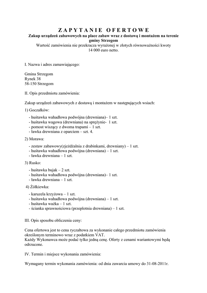ZAPYTANIE OFERTOWE Zakup urządzeń zabawowych na place zabaw wraz z dostawą i montażem na terenie gminy Strzegom Wartość zamówienia nie przekracza wyrażonej w złotych równoważności kwoty 14 000 euro netto. I. Nazwa i adres zamawiającego: Gmina Strzegom Rynek 38 58-150 Strzegom II. Opis przedmiotu zamówienia: Zakup urządzeń zabawowych z dostawą i montażem w następujących wsiach: 1) Goczałków: - huśtawka wahadłowa podwójna (drewniana)– 1 szt. - huśtawka wagowa (drewniana) na sprężynie- 1 szt. - pomost wiszący z dwoma trapami – 1 szt. - ławka drewniana z oparciem – szt. 4. 2) Morawa: - zestaw zabawowy(zjeżdżalnia z drabinkami, drewniany) – 1 szt. - huśtawka wahadłowa podwójna (drewniana) – 1 szt. - ławka drewniana – 1 szt. 3) Rusko: - huśtawka bujak – 2 szt. - huśtawka wahadłowa podwójna (drewniana)– 1 szt. - ławka drewniana – 1 szt. 4) Żółkiewka: - karuzela krzyżowa – 1 szt. - huśtawka wahadłowa podwójna (drewniana) – 1 szt. - huśtawka ważka – 1 szt. - ścianka sprawnościowa (przeplotnia drewniana) – 1 szt. III. Opis sposobu obliczenia ceny: Cena ofertowa jest to cena ryczałtowa za wykonanie całego przedmiotu zamówienia określonym terminowo wraz z podatkiem VAT. Każdy Wykonawca może podać tylko jedną cenę. Oferty z cenami wariantowymi będą odrzucone. IV. Termin i miejsce wykonania zamówienia: Wymagany termin wykonania zamówienia: od dnia zawarcia umowy do 31-08-2011r. V. Rodzaje kryteriów, którymi Zamawiający będzie się kierował przy wyborze oferty: najkorzystniejsza cena. VI. Miejsce, sposób i termin składania ofert: Ofertę należy złożyć w terminie do dnia 18-07-2011r. w formie pisemnej, w rozbiciu na każdą wieś, osobiście w Biurze Obsługi Interesanta pok. Nr 15 w Urzędzie Miejskim w Strzegomiu, faxem: 74 8560 516 lub na adres mailowy: [email protected] (Za dostarczone w terminie formularze ofertowe uważa się te, które w wyznaczonym terminie wpłyną do siedziby Zamawiającego tj. Urząd Miejski w Strzegomiu, Rynek 38, 58-150 Strzegom). VII. W przypadku gdy w określonym terminie nie wpłynie żadna oferta lub wpłynie/wpłyną niej niż 2 ważne oferty, Zamawiający unieważnia to postępowanie i przeprowadza ponowne. Strzegom, dnia …………………… ………………………… (podpis)