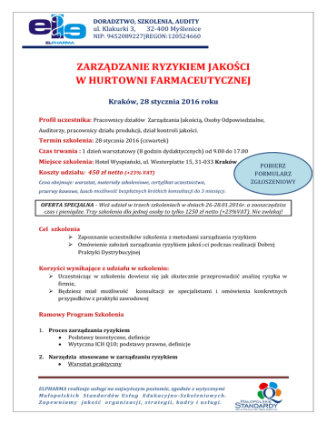 DORADZTWO, SZKOLENIA, AUDITY ul. Klakurki 3, 32-400 Myślenice NIP: 9452089227|REGON:120524660 ZARZĄDZANIE RYZYKIEM JAKOŚCI W HURTOWNI FARMACEUTYCZNEJ Kraków, 28 stycznia 2016 roku Profil uczestnika: Pracownicy działów Zarządzania Jakością, Osoby Odpowiedzialne, Auditorzy, pracownicy działu produkcji, dział kontroli jakości. Termin szkolenia: 28 stycznia 2016 (czwartek) Czas trwania : 1 dzień warsztatowy (8 godzin dydaktycznych) od 9.00 do 17.00 Miejsce szkolenia: Hotel Wyspiański, ul. Westerplatte 15, 31-033 Kraków Koszty udziału: 450 zł netto (+23% VAT) POBIERZ FORMULARZ ZGŁOSZENIOWY możliwość bezpłatnych krótkich konsultacji do 3 miesięcy. OFERTA SPECJALNA - Weź udział w trzech szkoleniach w dniach 26-28.01.2016r. a zaoszczędzisz czas i pieniądze. Trzy szkolenia dla jednej osoby to tylko 1250 zł netto (+23%VAT). Nie zwlekaj! Cel szkolenia Zapoznanie uczestników szkolenia z metodami zarządzania ryzykiem Omówienie założeń zarządzania ryzykiem jakośoci podczas realizacji Dobrej Praktyki Dystrybucyjnej Korzyści wynikające z udziału w szkoleniu: Uczestnicząc w szkoleniu dowiesz się jak skutecznie przeprowadzić analizę ryzyka w firmie, Będziesz miał możliwość konsultacji ze specjalistami i omówienia konkretnych przypadków z praktyki zawodowej Ramowy Program Szkolenia 1. Proces zarządzania ryzykiem Podstawy teoretyczne, definicje Wytyczna ICH Q10; podstawy prawne, definicje 2. Narzędzia stosowane w zarządzaniu ryzykiem Warsztat praktyczny ELPHARMA realizuje usługi na najwyższym poziomie, zgodnie z wytycznymi Małopolskich Standardów Usług Edukacyjno -Szkoleniowych. Zapewniamy jakość organizacji, strategii, kadry i usługi. DORADZTWO, SZKOLENIA, AUDITY ul. Klakurki 3, 32-400 Myślenice NIP: 9452089227|REGON:120524660 3. Ocena Ryzyka Identyfikacja ryzyka Diagram Ishikawy Burza mózgów Analiza Pareto Analiza Ryzyka Metoda: Analiza rodzajów i skutków uszkodzeń metodą FMEA , ang. Failure Mode Effects Analysis (FMEA) Teoria, metodologia Zastosowanie metody Ćwiczenia praktyczne; studia przypadków, paca zespołowa Ewaluacja Ryzyka 4. Kontrola Ryzyka Redukcja Ryzyka Akceptacja Ryzyka 5. Przegląd Ryzyka 6. Komunikacja Ryzyka 7. Zastosowanie Zarządzania Ryzykiem Jakości w codziennej praktyce GDP Trener: mgr Elżbieta Bętkowska-Ożóg Dyplomowany trener Szkoły Trenerów Zarządzania MATRIK. Wykładowca studiów podyplomowych Farmacja Przemysłowa Wydziału Farmaceutycznego Collegium Medicum Uniwersytetu Jagiellońskiego. Specjalizuje się w prowadzeniu szkoleń dla: farmaceutów przemysłowych w oparciu o najnowsze wytyczne Dobrej Praktyki Wytwarzania, dla producentów kosmetyków oraz w zakresie Systemów Zarządzania Jakością w tych branżach. Od 2007 roku Ekspert podczas auditowania i certyfikowania systemów zarządzania jakością w międzynarodowej jednostce certyfikującej w branżach: produkcja wyrobów farmaceutycznych, ochrona zdrowia, Dobra Praktyka Wytwarzania opakowań do celów farmaceutycznych, Dobra Praktyka Wytwarzania kosmetyków. W sprawach organizacyjnych prosimy o kontakt: Kamil Kozieł tel. : +48 885-656-597 e-mail: [email protected] skype: kamil.elpharma Zapraszamy do udziału w szkoleniu ELPHARMA realizuje usługi na najwyższym poziomie, zgodnie z wytycznymi Małopolskich Standardów Usług Edukacyjno -Szkoleniowych. Zapewniamy jakość organizacji, strategii, kadry i usługi.
