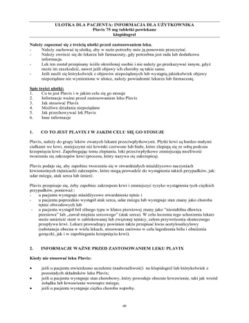 ULOTKA DLA PACJENTA: INFORMACJA DLA UŻYTKOWNIKA Plavix 75 mg tabletki powlekane klopidogrel Należy zapoznać się z treścią ulotki przed zastosowaniem leku. Należy zachować tę ulotkę, aby w razie potrzeby móc ją ponownie przeczytać. Należy zwrócić się do lekarza lub farmaceuty, gdy potrzebna jest rada lub dodatkowa informacja. Lek ten został przepisany ściśle określonej osobie i nie należy go przekazywać innym, gdyż może im zaszkodzić, nawet jeśli objawy ich choroby są takie same. Jeśli nasili się którykolwiek z objawów niepożądanych lub wystąpią jakiekolwiek objawy niepożądane nie wymienione w ulotce, należy powiadomić lekarza lub farmaceutę. Spis treści ulotki: 1. Co to jest Plavix i w jakim celu się go stosuje 2. Informacje ważne przed zastosowaniem leku Plavix 3. Jak stosować Plavix 4. Możliwe działania niepożądane 5. Jak przechowywać lek Plavix 6. Inne informacje 1. CO TO JEST PLAVIX I W JAKIM CELU SIĘ GO STOSUJE Plavix, należy do grupy leków zwanych lekami przeciwpłytkowymi. Płytki krwi są bardzo małymi ciałkami we krwi, mniejszymi niż krwinki czerwone lub białe, które zlepiają się ze sobą podczas krzepnięcia krwi. Zapobiegając temu zlepianiu, leki przeciwpłytkowe zmniejszają możliwość tworzenia się zakrzepów krwi (procesu, który nazywa się zakrzepicą). Plavix podaje się, aby zapobiec tworzeniu się w stwardniałych miażdżycowo naczyniach krwionośnych (tętnicach) zakrzepów, które mogą prowadzić do wystąpienia takich przypadków, jak: udar mózgu, atak serca lub śmierć. Plavix przepisuje się, żeby zapobiec zakrzepom krwi i zmniejszyć ryzyko wystąpienia tych ciężkich przypadków, ponieważ:: u pacjenta występuje miażdżycowe stwardnienie tętnic i u pacjenta poprzednio wystąpił atak serca, udar mózgu lub występuje stan znany jako choroba tętnic obwodowych lub - u pacjenta wystąpił ból silnego typu w klatce piersiowej znany jako ”niestabilna dławica piersiowa” lub „zawał mięśnia sercowego” (atak serca). W celu leczenia tego schorzenia lekarz może umieścić stent w zablokowanej lub zwężonej tętnicy, celem przywrócenia skutecznego przepływu krwi. Lekarz prowadzący powinien także przepisać kwas acetylosalicylowy (substancja obecna w wielu lekach, stosowana zarówno w celu łagodzenia bólu i obniżenia gorączki, jak i w zapobieganiu krzepnięciu krwi). 2. INFORMACJE WAŻNE PRZED ZASTOSOWANIEM LEKU PLAVIX Kiedy nie stosować leku Plavix: • • • jeśli u pacjenta stwierdzono uczulenie (nadwrażliwość) na klopidogrel lub którykolwiek z pozostałych składników leku Plavix; jeśli u pacjenta występuje stan chorobowy, który powoduje obecnie krwawienie, taki jak wrzód żołądka lub krwawienie wewnątrz mózgu; jeśli u pacjenta występuje ciężka choroba wątroby. 40 Jeśli pacjent uważa, że dotyczy go którykolwiek z tych problemów lub ma w ogóle jakiekolwiek inne wątpliwości, powinien skonsultować się z lekarzem prowadzącym zanim zastosuje Plavix. Kiedy zachować szczególną ostrożność stosując Plavix: Jeśli którakolwiek z sytuacji wymienionych poniżej dotyczy pacjenta, to przed zastosowaniem leku Plavix powinien on poinformować o tym lekarza prowadzącego: • jeśli występuje ryzyko krwawienia, takie jak: - stan chorobowy, który powoduje ryzyko wewnętrznego krwawienia (np. wrzód żołądka) - zaburzenie krwi usposabiające do wewnętrznego krwawienia (krwawienie wewnątrz tkanek, narządów lub stawów ciała) - ostatnio doznany ciężki uraz - ostatnio przebyty zabieg chirurgiczny (włącznie ze stomatologicznym) - planowany w następnych siedmiu dniach zabieg chirurgiczny (włącznie ze stomatologicznym) • jeśli u pacjenta stwierdzono zakrzep w tętnicy mózgu (udar niedokrwienny), który wystąpił w ciągu ostatnich siedmiu dni • jeśli pacjent przyjmuje inne leki (patrz Stosowanie leku Plavix z innymi lekami) • jeśli u pacjenta występuje choroba nerek lub wątroby Podczas stosowania leku Plavix: • Należy poinformować lekarza, jeśli u pacjenta planowany jest zabieg operacyjny (w tym stomatologiczny). • Należy również niezwłocznie poinformować lekarza, jeśli u pacjenta wystąpi stan chorobowy, który obejmuje gorączkę i siniaki pod skórą, pojawiające się w postaci czerwonych, punktowych plamek występujących z lub bez nie dającego się wyjaśnić uczucia skrajnego zmęczenia, stanem dezorientacji, zażółceniem skóry lub oczu (żółtaczka) (patrz MOŻLIWE DZIAŁANIA NIEPOŻĄDANE). • W przypadku skaleczenia lub zranienia, czas jaki upłynie zanim krwawienie ustanie, może być nieco dłuższy niż zwykle. Jest to związane ze sposobem działania leku, ponieważ zapobiega powstawaniu zakrzepów krwi . Nie sprawia to zwykle kłopotów przy niewielkich skaleczeniach i zranieniach np. skaleczenia w czasie golenia. Tym niemniej, w przypadku wystąpienia krwawienia należy niezwłocznie skontaktować się z lekarzem prowadzącym (patrz MOŻLIWE DZIAŁANIA NIEPOŻĄDANE). • Lekarz prowadzący może zlecić przeprowadzenie badań krwi. • Należy powiadomić lekarza prowadzącego lub farmaceutę, jeśli wystąpi jakikolwiek objaw niepożądany nie wymieniony w punkcie „MOŻLIWE DZIAŁANIA NIEPOŻĄDANE” tej ulotki lub jeśli nasili się którykolwiek z objawów niepożądanych. Plavix nie jest przeznaczony do stosowania u dzieci oraz młodzieży. Stosowanie leku Plavix z innymi lekami: Niektóre inne leki mogą wpływać na stosowanie leku Plavix lub odwrotnie. Należy powiedzieć lekarzowi o wszystkich przyjmowanych ostatnio lekach, również tych, które wydawane są bez recepty. Stosowanie doustnych leków przeciwzakrzepowych (leki stosowane w celu zmniejszenia krzepliwości krwi) jednocześnie z lekiem Plavix nie jest zalecane. Pacjent powinien poinformować lekarza prowadzącego zwłaszcza wtedy, jeśli przyjmuje niesteroidowy lek przeciwzapalny, zwykle stosowany do leczenia stanów bólowy