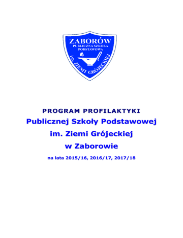 PROGRAM PROFILAKTYKI Publicznej Szkoły Podstawowej im. Ziemi Grójeckiej w Zaborowie na lata 2015/16, 2016/17, 2017/18 Spis treści Wstęp 1. 2. 3. 4. 5. 6. 7. 8. Charakterystyka środowiska szkolnego Diagnoza zagrożeń Działania profilaktyczne Cele programu a) cele programu dla kl. 0 – III b) cele programu dla kl. IV – VI Treści nauczania Formy realizacji programu Warunki realizacji programu Ewaluacja WSTĘP Podstawa prawna: Ustawa z dnia 7 września 1991 r. o systemie oświaty (Dz. U. z 1996 r. nr 67, poz. 329, tekst jednolity ze zmianami). Rozporządzenie Ministra Edukacji Narodowej i Sportu z dnia 12 lutego 2002 r. w sprawie ramowych planów nauczania w szkołach publicznych (Dz. U. z 2002 r. nr 15, poz. 142). Rozporządzenie Ministra Edukacji Narodowej i Sportu z dnia 26 lutego 2002 r. w sprawie podstawy programowej kształcenia ogólnego (Dz. U. z 2002 nr 51 poz. 458). Rozporządzenie Ministra Edukacji Narodowej z dnia 7 stycznia 2003 r. w sprawie zasad udzielania i organizacji pomocy psychologicznej i pedagogicznej (Dz. U. 2001 r. nr 11, poz. 114). Rozporządzenie Ministra Edukacji Narodowej i Sportu z dnia 31 stycznia 2003 r. w sprawie szczegółowych form działalności wychowawczej i zapobiegawczej wśród dzieci i młodzieży zagrożonych uzależnieniem (Dz. U. 2003 r. nr 13, poz. 226). Konwencja o Prawach Dziecka przyjęta przez Zgromadzenie Ogólne Narodów Zjednoczonych dnia 20 listopada 1989 roku, ratyfikowana przez Polskę 30 września 1991 r. (Dz. U. nr 120, poz. 526). Konstytucja Rzeczypospolitej Polskiej z dnia 2 kwietnia 1997 r. (Dz. U. nr 78, poz. 483). Ustawa z dnia 9 listopada 1995 r. o ochronie zdrowia przed następstwami używania tytoniu i wyrobów tytoniowych (Dz. U. z 1996 r. nr 10, poz. 55, tekst jednolity ze zmianami). Statut Publicznej Szkoły Podstawowej im. Ziemi Grójeckiej w Zaborowie. Program Wychowawczy Publicznej Szkoły Podstawowej im. Ziemi Grójeckiej w Zaborowie. Zadaniem wszystkich nauczycieli jest poza przekazywaniem wiadomości i umiejętności wychowywanie, kierowanie rozwojem psychicznym, a także kształtowanie prawidłowych zachowań społecznych. W celu skonstruowania programu profilaktyki uwzględniony został program wychowawczy szkoły, jako baza do wszelkich działań profilaktycznych. Zdiagnozowane zostały potrzeby i problemy uczniów oraz spostrzeżenia i propozycje rodziców. Uwzględnione zostały także uwagi i wnioski nauczycieli oraz wychowawców. W oparciu o przeprowadzone obserwacje, rozmowy, ankiety wśród uczniów szkoły („Uczeń i szkoła” – anonimowa ankieta przeprowadzona w klasach IV – VI), spotkania, ankiety i wywiady z rodzicami („Jakie są Państwa oczekiwania?” – ankieta wśród rodziców uczniów szkoły), a w szczególności biorąc pod uwagę podmioty współdziałające na rzecz edukacji i wychowania dzieci i młodzieży, ustalono konkretne obszary działań oraz zadania do realizacji, istotne dla naszej szkoły. Zakres profilaktyki jest dosyć szeroki, a jej cele pokrywają się z celami wychowania. Skuteczność działań profilaktycznych zależy od długofalowych oddziaływań. Są one możliwe do zrealizowania w szkole, gdzie zapewniony jest codzienny kontakt uczniów z wychowawcą. Oddziaływania profilaktyczne mają duże znaczenie w odniesieniu do dzieci w wieku szkolnym, w czasie dorastania (klasy III –VI). Wtedy kształtują się i dojrzewają osobowości młodych ludzi. Prowadzenie dzieci przez ten okres jest zarówno wychowaniem, jak i profilaktyką. 1. CHARAKTERYSTYKA ŚRODOWISKA SZKOLNEGO Szkoła rozwija, kształtuje postawy młodych ludzi już od najmłodszych lat. W trakcie całego złożonego procesu kształcenia i wychowywania zdarza się wiele trudności i problemów. W obecnych czasach coraz częściej zagrożenia, o których wcześniej małe szkoły dowiadywały się tylko z mediów, spotykane są w środowiskach wiejskich, nawet wśród uczniów klas najmłodszych. Narastającym problemem wśród dzieci i młodzieży jest: agresja, przemoc oraz sięganie po różnego rodzaju używki (papierosy, alkohol, narkotyki). Wszystkie środowiska szkolne borykają się z problemami wychowawczymi. W celu zapobiegania patologiom oraz różnym narastającym problemom należy stworzyć wspólny program działania. Istotą takiego programu profilaktyki jest współpraca wszystkich nauczycieli szkoły oraz rodziców, a także policji, placówek pedagogiczno – psychologicznych, kościoła. W obecnych czasach coraz częściej sprawy wychowania są spychane na plan dalszy. Coraz częściej zdarza się, że problemy dotyczące dzieci i młodzieży wychodzą na jaw za późno. Nie ma żadnych skutecznych działań, by zapobiec agresji, bójkom, namowom na pierwszego papierosa. Ze względu na wagę problemów należy jak najwcześniej podjąć działania profilaktyczne. Po przeprowadzeniu diagnoz i analiz dotyczących zachowań dzieci i młodzieży w naszej szkole konieczne okazało się zwrócenie uwagi na bezpieczeństwo wewnątrz szkoły, różnego rodzaju przejawy złego zachowania, agresji: bójek, przezwisk, ubliżania, dokuczania młodszym kolegom i koleżankom. Sporadycznie pojawiły się symptomy o paleniu papierosów i piciu alkoholu. Problem ten zasygnalizowali rodzice i uczniowie klas starszych. Aby przeciwdziałać i zapobiegać wyżej wymienionym zjawiskom konieczne jest podjęcie działań profilaktycznych na terenie szkoły. Działania profilaktyczne powinny spełniać określone zadania: profilaktyka oparta na metodach aktywizujących dostosowanych do możliwości dzieci, promocja zdrowia, wiedza o środkach odurzających, możliwość szukania pomocy w trudnych sytuacjach, tworzenie więzi z rówieśnikami, informacja jak unikać niebezpiecznych osób, przedmiotów, sytuacji, profilaktyka przeciwdziałania agresji i przemocy. DIAGNOZA ZAGROŻEŃ W celu dokładnego przygotowania zakresu działań profilaktycznych przeprowadzone zostały na terenie szkoły badania: obs