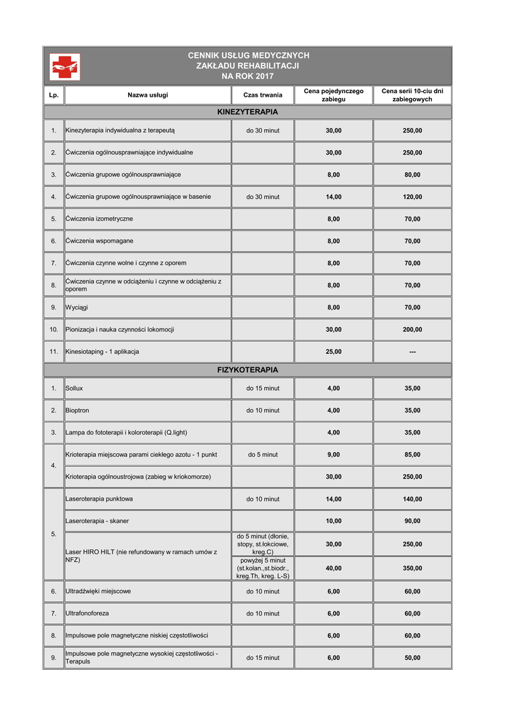 CENNIK USŁUG MEDYCZNYCH ZAKŁADU REHABILITACJI NA ROK 2017 Nazwa usługi Lp. Czas trwania Cena pojedynczego zabiegu Cena serii 10-ciu dni zabiegowych 30,00 250,00 KINEZYTERAPIA 1. Kinezyterapia indywidualna z terapeutą 2. Ćwiczenia ogólnousprawniające indywidualne 30,00 250,00 3. Ćwiczenia grupowe ogólnousprawniające 8,00 80,00 4. Ćwiczenia grupowe ogólnousprawniające w basenie 14,00 120,00 5. Ćwiczenia izometryczne 8,00 70,00 6. Ćwiczenia wspomagane 8,00 70,00 7. Ćwiczenia czynne wolne i czynne z oporem 8,00 70,00 8. Ćwiczenia czynne w odciążeniu i czynne w odciążeniu z oporem 8,00 70,00 9. Wyciągi 8,00 70,00 10. Pionizacja i nauka czynności lokomocji 30,00 200,00 11. Kinesiotaping - 1 aplikacja 25,00 --- do 30 minut do 30 minut FIZYKOTERAPIA 1. Sollux do 15 minut 4,00 35,00 2. Bioptron do 10 minut 4,00 35,00 3. Lampa do fototerapii i koloroterapii (Q.light) 4,00 35,00 9,00 85,00 30,00 250,00 14,00 140,00 10,00 90,00 30,00 250,00 40,00 350,00 Krioterapia miejscowa parami ciekłego azotu - 1 punkt do 5 minut 4. Krioterapia ogólnoustrojowa (zabieg w kriokomorze) Laseroterapia punktowa do 10 minut Laseroterapia - skaner 5. Laser HIRO HILT (nie refundowany w ramach umów z NFZ) do 5 minut (dłonie, stopy, st.łokciowe, kreg.C) powyżej 5 minut (st.kolan.,st.biodr., kreg.Th, kreg. L-S) 6. Ultradźwięki miejscowe do 10 minut 6,00 60,00 7. Ultrafonoforeza do 10 minut 6,00 60,00 8. Impulsowe pole magnetyczne niskiej częstotliwości 6,00 60,00 9. Impulsowe pole magnetyczne wysokiej częstotliwości Terapuls 6,00 50,00 do 15 minut 10. Galwanizacja do 15 minut 6,00 50,00 11. Elektrostymulacja do 15 minut 8,00 75,00 12. Jonoforeza do 15 minut 6,00 55,00 13. Prądy diadynamiczne do 15 minut 6,00 50,00 14. Interdyn - prądy interferencyjne do 15 minut 6,00 50,00 15. Prądy TENS do 15 minut 6,00 50,00 16. Prądy Träberta do 15 minut 6,00 50,00 17. Prądy Kotza do 15 minut 6,00 50,00 18. Tonoliza do 15 minut 8,00 70,00 19. Terapia skojarzona elektroterapia z podciśnieniem do 15 minut 10,00 90,00 20. Terapia skojarzona elektroterapia z ultradźwiękami do 15 minut 10,00 90,00 21. Aerodyn (sucha terapia ciepla) do 15 minut 7,00 60,00 22. Aquavibron - masaż wibracyjny do 10 minut 12,00 100,00 23. Aquai (łóżko) - masaż membranowy do 15 minut 20,00 180,00 24. BOA - masaż uciskowy, odchudzający, zwalczający cellulit 1 kończyna 10,00 90,00 BOA - masaż uciskowy, odchudzający, zwalczający cellulit 2 kończyny 18,00 170,00 10,00 90,00 25. Fango - 1 okolica do 15 minut MASAŻ SUCHY 1. Masaż klasyczny całościowy 60 minut 60,00 600,00 2. Masaż klasyczny częściowy (np.kręgosłupa odc.C/TH lub odc.L-S z obręczą barkową) 30 minut 40,00 350,00 3. Masaż klasyczny odcinka (np. kręgosłupa odc.C lub odc.LS lub twarzy) 15 minut 30,00 250,00 4. Drenaż limfatyczny kończyny górnej 20 minut 30,00 250,00 5. Drenaż limfatyczny kończyny dolnej 20 minut 40,00 350,00 6. Nauka automasażu 7. Kompleksowa terapia udrażniająca z bandażowaniem kończyny górnej (z bandażami) 60 minut 70,00 650,00 8. Kompleksowa terapia udrażniająca z bandażowaniem kończyny górnej (bez bandaży) 60 minut 50,00 450,00 9. Kompleksowa terapia udrażniająca z bandażowaniem kończyny dolnej (z bandażami) 60 minut 90,00 800,00 10. Kompleksowa terapia udrażniająca z bandażowaniem kończyny dolnej (bez bandaży) 60 minut 60,00 550,00 14,00 HYDROTERAPIA Nazwa usługi Lp. Cena pojedynczego zabiegu Cena serii 10-ciu dni zabiegowych 1. Masaż podwodny całkowity 25,00 200,00 2. Maaż podwodny hydropowietrzny (perełki) 35,00 300,00 3. Masaż wirowy kończyn 10,00 90,00 4. Masaż wirowy kończyn dolnych z odc. L-S 15,00 100,00 5. Kąpiel solankowa 20,00 150,00 6. Kąpiel solankowa z perełką 35,00 250,00 7. Kąpiel kwasowęglowa 30,00 250,00 8. Kąpiel kwasowęglowa (sucha kąpiel w CO₂) 20,00 150,00 9. Kąpiel elektryczno-wodna czterokomorowa 15,00 140,00 10. Bicze szkockie 20,00 150,00 INNE Lp. Środek do wykonania zabiegu Cena pojedynczego środka 1. Damski strój do zabiegu kriokomory 58,00 2. Męski strój do zabiegu kriokomory 56,00 3. Podkład wiskozowy do elektrolecznictwa 7,00 PORADY REHABILITACYJNE Porada Lp. Cena 1. Porada lekarska pierwszorazowa 70,00 2. Porada lekarska kontrolna 60,00 3. Porada lekarska z wypisaniem zaświadczeń o leczeniu 40,00 INNE PORADY Wizyta Lp. Cena 1. Wizyta logopedyczna/psychologiczna pierwszorazowa (60 min.) 100,00 2. Wizyta 2-ga i kolejne (45 min.) 70,00 3. Wydanie opinii psychologicznej/logopedycznej 60,00
