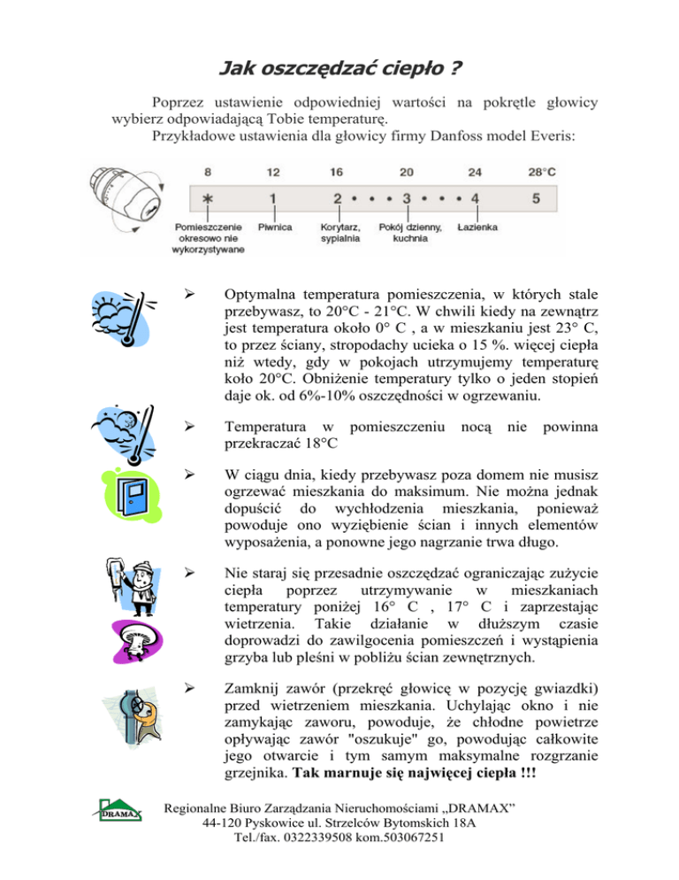 Jak oszczędzać ciepło ? Poprzez ustawienie odpowiedniej wartości na pokrętle głowicy wybierz odpowiadającą Tobie temperaturę. Przykładowe ustawienia dla głowicy firmy Danfoss model Everis: Optymalna temperatura pomieszczenia, w których stale przebywasz, to 20°C - 21°C. W chwili kiedy na zewnątrz jest temperatura około 0° C , a w mieszkaniu jest 23° C, to przez ściany, stropodachy ucieka o 15 %. więcej ciepła niż wtedy, gdy w pokojach utrzymujemy temperaturę koło 20°C. Obniżenie temperatury tylko o jeden stopień daje ok. od 6%-10% oszczędności w ogrzewaniu. Temperatura w pomieszczeniu przekraczać 18°C nocą nie powinna W ciągu dnia, kiedy przebywasz poza domem nie musisz ogrzewać mieszkania do maksimum. Nie można jednak dopuścić do wychłodzenia mieszkania, ponieważ powoduje ono wyziębienie ścian i innych elementów wyposażenia, a ponowne jego nagrzanie trwa długo. Nie staraj się przesadnie oszczędzać ograniczając zużycie ciepła poprzez utrzymywanie w mieszkaniach temperatury poniżej 16° C , 17° C i zaprzestając wietrzenia. Takie działanie w dłuższym czasie doprowadzi do zawilgocenia pomieszczeń i wystąpienia grzyba lub pleśni w pobliżu ścian zewnętrznych. Zamknij zawór (przekręć głowicę w pozycję gwiazdki) przed wietrzeniem mieszkania. Uchylając okno i nie zamykając zaworu, powoduje, że chłodne powietrze opływając zawór "oszukuje" go, powodując całkowite jego otwarcie i tym samym maksymalne rozgrzanie grzejnika. Tak marnuje się najwięcej ciepła !!! Regionalne Biuro Zarządzania Nieruchomościami „DRAMAX” 44-120 Pyskowice ul. Strzelców Bytomskich 18A Tel./fax. 0322339508 kom.503067251 Aby uzyskać maksymalny efekt wietrzenia należy: • zamknąć zawory termostatyczne w wietrzonym pokoju • odsunąć zasłony i firanki • otworzyć szeroko drzwi balkonowe lub okno (najlepiej dwa skrzydła) • w czasie przewietrzania zamknąć drzwi do wietrzonego pokoju • optymalny czas wietrzenia wynosi od 3 do 5 minut • po przewietrzeniu, zamknąć balkon lub okna i otworzyć zawory termostatyczne Ten sposób wietrzenia zapewni pełną wymianę powietrza i jednocześnie zapobiegnie utracie ciepła „zmagazynowanego” w ścianach pokoju i meblach. Nie zasłaniaj grzejnika i głowicy termostatycznej meblami, zasłonami i innymi przedmiotami. Zasłonięcie grzejnika powoduje ogrzewanie zastawiających go mebli i wywiewanie ogrzanego powietrza przez okna (szczególnie jak są nieszczelne). Dodatkowo „oszukuje” zawór termostatyczny wokół którego powietrze szybko nagrzewa się powodując jego zamknięcie mimo, że temperatura w pomieszczeniu jest niska. W okresie poza sezonem grzewczym lub w przypadku czasowego wyłączenia ogrzewania, ustaw głowicę w pozycji „5” (zawór całkowicie otwarty). Przed złożeniem reklamacji kwestionującej poprawność funkcjonowania instalacji sprawdź jaka temperatura została nastawiona na głowicy termostatycznej i sprawdź przy pomocy termometru pokojowego, jaka temperatura panuje w pomieszczeniu. Określanie temperatury grzejnika “ręcznie” jako “zimny” lub “letni” nie jest miarą nieprawidłowego działania instalacji. Ważna jest temperatura w pomieszczeniu, a nie temperatura grzejnika. Regionalne Biuro Zarządzania Nieruchomościami „DRAMAX” 44-120 Pyskowice ul. Strzelców Bytomskich 18A Tel./fax. 0322339508 kom.503067251