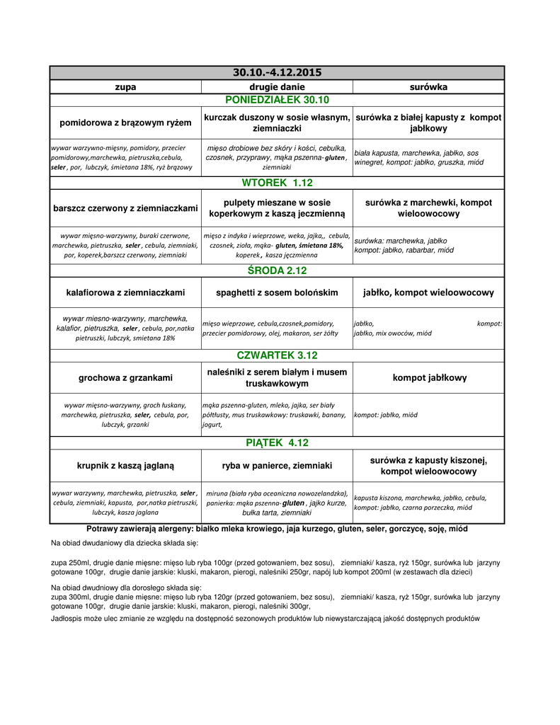 30.10.-4.12.2015 zupa drugie danie surówka PONIEDZIAŁEK 30.10 pomidorowa z brązowym ryżem wywar warzywno-mięsny, pomidory, przecier pomidorowy,marchewka, pietruszka,cebula, seler , por, lubczyk, śmietana 18%, ryż brązowy kurczak duszony w sosie własnym, surówka z białej kapusty z kompot ziemniaczki jabłkowy mięso drobiowe bez skóry i kości, cebulka, biała kapusta, marchewka, jabłko, sos czosnek, przyprawy, mąka pszenna- gluten , winegret, kompot: jabłko, gruszka, miód ziemniaki WTOREK 1.12 barszcz czerwony z ziemniaczkami pulpety mieszane w sosie koperkowym z kaszą jeczmienną surówka z marchewki, kompot wieloowocowy wywar mięsno-warzywny, buraki czerwone, mięso z indyka i wieprzowe, weka, jajka,, cebula, surówka: marchewka, jabłko marchewka, pietruszka, seler , cebula, ziemniaki, czosnek, zioła, mąka- gluten, śmietana 18%, kompot: jabłko, rabarbar, miód por, koperek,barszcz czerwony, ziemniaki koperek , kasza jęczmienna ŚRODA 2.12 kalafiorowa z ziemniaczkami wywar miesno-warzywny, marchewka, kalafior, pietruszka, seler , cebula, por,natka pietruszki, lubczyk, smietana 18% spaghetti z sosem bolońskim mięso wieprzowe, cebula,czosnek,pomidory, przecier pomidorowy, olej, makaron, ser żółty jabłko, kompot wieloowocowy jabłko, jabłko, mix owoców, miód kompot: CZWARTEK 3.12 grochowa z grzankami wywar mięsno-warzywny, groch łuskany, marchewka, pietruszka, seler, cebula, por, lubczyk, grzanki naleśniki z serem białym i musem truskawkowym mąka pszenna-gluten, mleko, jajka, ser biały półtłusty, mus truskawkowy: truskawki, banany, jogurt, kompot jabłkowy kompot: jabłko, miód PIĄTEK 4.12 krupnik z kaszą jaglaną wywar warzywny, marchewka, pietruszka, seler , cebula, ziemniaki, kapusta, por,natka pietruszki, lubczyk, kasza jaglana ryba w panierce, ziemniaki surówka z kapusty kiszonej, kompot wieloowocowy miruna (biała ryba oceaniczna nowozelandzka), kapusta kiszona, marchewka, jabłko, cebula, panierka: mąka pszenna-gluten , jajko kurze, kompot: jabłko, czarna porzeczka, miód bułka tarta, ziemniaki Potrawy zawierają alergeny: białko mleka krowiego, jaja kurzego, gluten, seler, gorczycę, soję, miód Na obiad dwudaniowy dla dziecka składa się: zupa 250ml, drugie danie mięsne: mięso lub ryba 100gr (przed gotowaniem, bez sosu), ziemniaki/ kasza, ryż 150gr, surówka lub jarzyny gotowane 100gr, drugie danie jarskie: kluski, makaron, pierogi, naleśniki 250gr, napój lub kompot 200ml (w zestawach dla dzieci) Na obiad dwudniowy dla dorosłego składa się: zupa 300ml, drugie danie mięsne: mięso lub ryba 120gr (przed gotowaniem, bez sosu), ziemniaki/ kasza, ryż 150gr, surówka lub jarzyny gotowane 100gr, drugie danie jarskie: kluski, makaron, pierogi, naleśniki 300gr, Jadłospis może ulec zmianie ze względu na dostępność sezonowych produktów lub niewystarczającą jakość dostępnych produktów