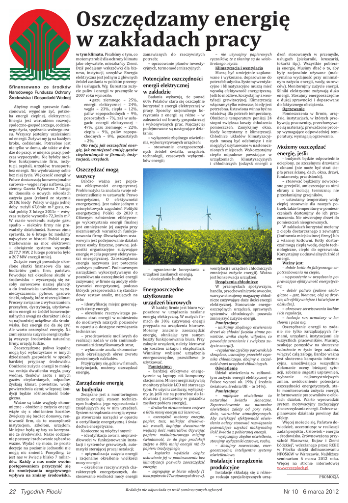 Oszczędzamy energię w zakładach pracy Abyśmy mogli sprawnie funkcjonować, wygodnie żyć, potrzeba energii cieplnej, elektrycznej. Energia jest warunkiem rozwoju społeczno-gospodarczego, codziennego życia, spędzania wolnego czasu. Wszyscy jesteśmy uzależnieni od energii. Zużywamy ją na każdym kroku, codziennie. Potrzebne jest nie tylko w domu, ale także w drodze do pracy, w miejscu pracy, podczas wypoczynku. Nie byłoby możliwe funkcjonowanie irm, instytucji, szpitali, urzędów, transportu bez energii. Nie wyobrażamy sobie bez niej życia. Większość energii w Polsce dostarczają konwencjonalne surowce – węgiel, ropa naftowa, gaz ziemny. Gazeta Wyborcza 7 lutego br. donosiła o nowych rekordach zużycia gazu (rekord ze stycznia 2010r, kiedy Polacy w ciągu jednej doby zużyli 67,8mln m3 gazu, został pobity 3 lutego 2011r – wówczas zużycie wynosiło 72,3mln m3. W czasie weekendu zużycie gazu spadło – niektóre irmy nie prowadziły działalności. Surowa zima sprawiła, że 6 lutego br. mieliśmy najwyższe w historii Polski zapotrzebowanie na moc elektrowni – obciążenie systemu wynosiło 2577,7 MW, 2 lutego potrzeba było o 207 MW energii mniej. Zużycie energii powoduje określone skutki inansowe dla nas, budżetów gmin, irm, państwa. Powoduje też określone skutki w środowisku – wyczerpują się zasoby surowcowe naszej planety, a do środowiska uwalniane są zanieczyszczenia: pyłowe, gazowe, ścieki, odpady, które niszczą klimat. Procesy związane z wytwarzaniem, przesyłem, dystrybucją, użytkowaniem energii ze źródeł konwencjonalnych z uwagi na charakter i skalę są najbardziej uciążliwe dla środowiska. Bez energii nie da się żyć. Ale warto oszczędzać energię. Na zmniejszaniu zużycia energii zyskają wszyscy: środowisko naturalne, irmy, urzędy, ludzie. Zaoszczędzone paliwa kopalne mogą być wykorzystane w innych dziedzinach gospodarki w sposób bardziej przyjazny środowisku. Obniżenie zużycia energii to mniejsza emisja dwutlenku węgla, pary wodnej, tlenków azotu i innych gazów cieplarnianych, odpadów. Zyskają klimat, powietrze, wody, powierzchnia ziemi; w lepszej kondycji będzie różnorodność biologiczna. Ważne są takie względy ekonomiczne - obniżenie zużycia energii wiąże się z obniżeniem kosztów. Zwiększy się budżet domowy, rentowność irm, da to oszczędność instytucjom, szkołom, urzędom. Mniejsze będą opłaty za korzystanie ze środowiska. Nasze codziennie postawy i zachowanie są bardzo ważne. Wydać się może, że proste decyzje na poziomie jednostki nie mogą nic zmienić. Pomyślmy, że jest nas w świecie blisko 7 miliardów. Każdy z nas może swoim postępowaniem przyczynić się do zmniejszania negatywnego wpływu na zmiany środowiska, 22 Tygodnik Płocki w tym klimatu. Pisaliśmy o tym, co możemy zrobić dla ochrony klimatu jako obywatele, mieszkańcy Ziemi. Dziś podajemy wskazówki dla biznesu, instytucji, urzędów. Energia elektryczna jest jednym z głównych źródeł zasilania w polskim przemyśle i usługach. Wg Eurostatu zużycie paliw i energii w przemyśle w 2007 roku wynosiło: gazu ziemnego – 25%, energii elektrycznej – 24%, węgla – 23%, ciepła – 12%, paliw ropopochodnych – 9%, pozostałych – 7%, zaś w usługach: energii elektrycznej – 47%, gazu ziemnego – 22%, ciepła – 9%, paliw ropopochodnych – 8%, pozostałych – 2%. Oto rady, jak oszczędzać energię, jak zmniejszać emisję gazów cieplarnianych w irmach, instytucjach, urzędach. zamawianych do rzeczywistych potrzeb; – opracowanie planów inwestycyjnych, termomodernizacyjnych. Potencjalne oszczędności energii elektrycznej w zakładzie Badania wykazują, że ponad 60% Polaków stara się oszczędnie korzystać z energii elektrycznej w pracy. Sposoby racjonalnego korzystania z energii są różne – w zależności od branży gospodarczej i wykonywanych prac. Najczęściej podejmowane są następujące działania: – wyłączenie zbędnego oświetlenia, wykorzystywanych urządzeń; – stosowanie energooszczędnych źródeł światła, urządzeń, technologii, czasowych wyłączników energii; – nie używajmy papierowych ręczników, te z tkaniny są do wielokrotnego użycia. Klimatyzacja i wentylacja Muszą być umiejętnie zaplanowane i wykonane, dopasowane do potrzeb budynku. Systemy wentylacyjne i klimatyzacyjne muszą mieć wysoką efektywność energetyczną. Jeśli to możliwe, korzystajmy z wentylacji grawitacyjnej. Klimatyzację włączamy tylko wówczas, kiedy jest potrzebna. Ustawiona winna być na właściwą dla potrzeb temperaturę. Obniżenie temperatury poniżej 24 stopni zwiększa koszty chłodzenia pomieszczeń. Zamykajmy okna, kiedy korzystamy z klimatyzacji. Chłodnice układów klimatyzacyjnych muszą być odsłonięte i nie mogą być usytuowane w nasłonecznionych miejscach. Wykorzystajmy ciepło odpadowe powstające w urządzeniach klimatyzacyjnych i chłodniczych (odzysk energii z Oszczędzać mogą wszyscy Bardzo ważna jest poprawa efektywności energetycznej. Problematyka ta znalazła swoje odzwierciedlenie w ustawach: Prawo energetyczne, O efektywności energetycznej. Jest także jednym z priorytetowych zagadnień Polityki energetycznej Polski do 2030 r. Głównym założeniem efektywnego wykorzystania energii inalnej jest zmniejszenie jej zużycia przy niezmiennych warunkach funkcjonowania irmy. Obowiązkiem ustawowym jest podejmowanie działań przez osoby izyczne, prawne, jednostki organizacyjne zużywające energię w celu poprawy efektywności energetycznej. Zaoszczędzona energia nazywana jest potocznie „szóstym paliwem”. Podstawowym narzędziem wykorzystywanym do poszukiwania oszczędności energii zużywanej w irmie są audyty efektywności energetycznej, podczas których przeprowadza się standardowy zestaw analiz, mających na celu: – identy ikację miejsc generujących straty energii; – określenie rzeczywistego poziomu strat ene