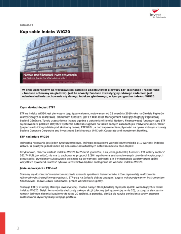 2010-09-23 Kup sobie indeks WIG20 W dniu wczorajszym na warszawskim parkiecie zadebiutował pierwszy ETF (Exchange Traded Fund - fundusz notowany na giełdzie). Jest to otwarty fundusz inwestycyjny, którego zadaniem jest odzwierciedlanie zachowania się danego indeksu giełdowego, w tym przypadku indeksu WIG20. Czym dokładnie jest ETF? ETF na indeks WIG20 jest pierwszym tego typu walorem, notowanym od 22 września 2010 roku na Giełdzie Papierów Wartościowych w Warszawie. Emitentem funduszu jest LYXOR Asset Management należący do grupy kapitałowej Société Générale. Tytuły uczestnictwa (nazwa zgodna z ustaleniami Komisji Nadzoru Finansowego) funduszy typu ETF są notowane w polskich złotych w systemie notowań ciągłych na takich samych zasadach jak tradycyjne akcje. Walor (papier wartościowy) działa pod skróconą nazwą: ETFW20L, a nad zapewnieniem płynności na rynku wtórnym czuwają Societe Generale Corporate and Investment Banking oraz UniCredit Corporate and Investment Banking. ETF naśladuje WIG20 Jednostką notowania jest jeden tytuł uczestnictwa, którego początkowa wartość odzwierciedla 1:10 wartości indeksu WIG20. W praktyce jednak może się ona różnić od aktualnych notowań indeksu blue-chipów. Przykładowo, obecna wartość indeksu WIG20 to 2564,51 punktów, a za jedną jednostkę funduszu ETF należy zapłacić 261,74 PLN. Jak widać, nie ma tu zachowanej proporcji 1:10 i wynika ona ze skumulowanych dywidend wypłacanych przez spółki. Dywidendy sukcesywnie doliczane są do wartości jednostki ETF i w momencie wypłaty przez spółki wszystkich dywidend, wartość tytułów uczestnictwa będzie analogiczna do wartości indeksu WIG20. Jakie są korzyści z ETF-ów? Staramy się dostarczać inwestorom możliwie szerokie spektrum instrumentów, które zapewniają realizowanie różnorodnych strategii inwestycyjnych. ETF-y są na świecie dobrze znanym i często wykorzystywanym instrumentem finansowym - mówi Ludwik Sobolewski, prezes warszawskiej giełdy. Stosując ETF-y w swojej strategii inwestycyjnej, można nabyć 20 najbardziej płynnych spółek, wchodzących w skład indeksu WIG20. Dzięki temu obniża się koszty zakupu akcji (płacimy jedną prowizję, a nie 20), oszczędza się czas (w ramach jednego zlecenia kupujemy de facto 20 spółek), a ponadto, obniża się ryzyko poniesienia straty, poprzez zastosowanie dywersyfikacji swojego portfela. 1 Jeszcze jedna, ważna korzyść Posiadając akcje dowolnej spółki, mamy prawo do uzyskania dywidendy z tegoż waloru. Również w przypadku posiadania tytułów uczestnictwa w LYXOR ETF WIG20 raz w roku inwestorowi może być wypłacana przez fundusz dywidenda będąca ekwiwalentem dywidendy wypłacanej przez spółki wchodzące w skład indeksu WIG20. ETF, a inne instrumenty Należy pamiętać, iż ETF nie jest funduszem indeksowym, który wyceniamy jest raz dziennie, bądź raz na tydzień. Natomiast nowy instrument wyceniony jest na zasadzie intraday, a mianowicie wartość tytułów uczestnictwa jest publikowana na bieżąco podczas sesji giełdowej. Jest to podstawowa różnica pomiędzy tradycyjnym funduszem indeksowym czy inwestycyjnym, a funduszem typu ETF. Nie można również funduszu porównywać do kontraktów terminowych na indeks WIG20, gdyż futuresy są pochodnym instrumentem finansowym. W tym przypadku wykorzystuje się tzw. efekt dźwigni finansowej (kupuje się instrument, który opiewa na większą wartość niż kwota zakupu kontraktu terminowego). ETF jest instrumentem zbliżonym do akcji, chociaż nie jest to ani akcja, ani spółka notowana na giełdzie. Sposób obrotu jednostkami funduszu jest analogiczny do obrotu akcjami. Należy również pamiętać, iż wartość ETF-ów nie zależy od popytu i podaży zgłaszanej na ten instrument. Innymi słowy, cena funduszu jest silnie skorelowana z wartością indeksu WIG20. Doświadczenia zagranicznych giełd pokazują, iż porównywalność z głównym indeksem giełdowym, bardzo niskie opłaty za zarządzanie oraz możliwość szybkiego upłynnienia inwestycji, zapewniły ETF-om dużą popularność, zarówno wśród inwestorów indywidualnych, jak i instytucji. Pełen prospekt emisyjny (1,3 MB) Skrócony prospekt emisyjny (161 KB) Marek Trocha Autor MT 2