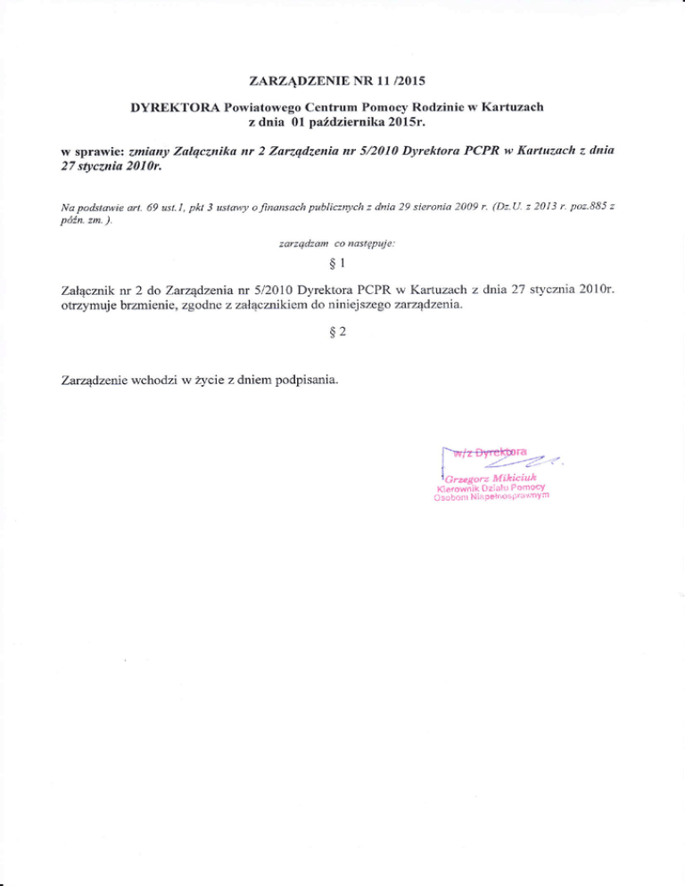ZARZ.ĄDZENIE NR 11 /2015 DYREKTORA Powiatowego Centrum Pomocy Rodzinie z dnia 01 października 2015r. w Kańuzach w sprawie: zmiany Załqcznika nr 2 Zarzqdzenia nr 5/2010 Ąrektora PCPR w Kartuzach z dnia 27 stycznia 2010r. Ną podstq|łie art. 69 ust.1, pkt 3 ustawy późn. zm. ). o Jżnansach publicznych z dnia 29 sieronią 2009 r, (Dz.U. z 20I j r. poz.885 z zarzqdzam co następuj e: §1 Załącznik nr 2 do Załządzenia nr 5/2010 Dyrektora PCPR w Kartuzach ohzymuje brzmienie, zgodne z zŃącznikiem do niniejszego zarządzenia. z dnia 27 stycznia 2010r. §2 Zatządzeńe wchodzi w Ęcie z dniem podpisania. \ł'ryż-. |Grzesoru Mihiłiuh Ki.rownik o:iółu Pomocy o§Obo|r NiępełriJ§l,e!T Y m