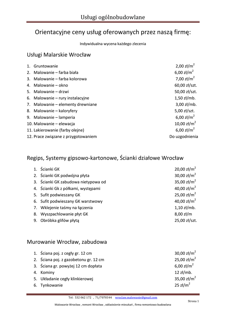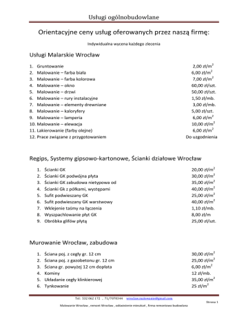 Usługi ogólnobudowlane Orientacyjne ceny usług oferowanych przez naszą firmę: Indywidualna wycena każdego zlecenia Usługi Malarskie Wrocław 2,00 zł/m2 6,00 zł/m2 7,00 zł/m2 60,00 zł/szt. 50,00 zł/szt. 1,50 zł/mb. 3,00 zł/mb. 5,00 zł/szt. 6,00 zł/m2 10,00 zł/m2 6,00 zł/m2 Do uzgodnienia 1. Gruntowanie 2. Malowanie – farba biała 3. Malowanie – farba kolorowa 4. Malowanie – okno 5. Malowanie – drzwi 6. Malowanie – rury instalacyjne 7. Malowanie – elementy drewniane 8. Malowanie – kaloryfery 9. Malowanie – lamperia 10. Malowanie – elewacja 11. Lakierowanie (farby olejne) 12. Prace związane z przygotowaniem Regips, Systemy gipsowo-kartonowe, Ścianki działowe Wrocław 1. 2. 3. 4. 5. 6. 7. 8. 9. 20,00 zł/m2 30,00 zł/m2 35,00 zł/m2 40,00 zł/m2 25,00 zł/m2 40,00 zł/m2 1,10 zł/mb. 8,00 zł/m 25,00 zł/szt. Ścianki GK Ścianki GK podwójna płyta Ścianki GK zabudowa nietypowa od Ścianki Gk z półkami, występami Sufit podwieszany GK Sufit podwieszany GK warstwowy Wklejenie taśmy na łączenia Wyszpachlowanie płyt GK Obróbka glifów płytą Murowanie Wrocław, zabudowa 1. 2. 3. 4. 5. 6. 30,00 zł/m2 25,00 zł/m2 6,00 zł/m2 12 zł/mb. 35,00 zł/m2 25 zł/m2 Ściana poj. z cegły gr. 12 cm Ściana poj. z gazobetonu gr. 12 cm Ściana gr. powyżej 12 cm dopłata Kominy Układanie cegły klinkierowej Tynkowanie Tel: 532 062 172 , 71/7070344 [email protected] Strona 1 Malowanie Wrocław , remont Wrocław , odświeżenie mieszkań , firma remontowo budowlana Usługi ogólnobudowlane Demontaż ogólnobudowlany Wrocław 2,20 zł/m2 15,00 zł/m2 2,60 zł/m2 1,40 zł/m2 2,60 zł/m2 1,20 zł/m2 1,00 zł/m2 6,00 zł/m2 8,00 zł/m2 9,00 zł/m2 25,00 zł/szt. 30,00 zł/szt. 1,00 zł/mb. 7,00 zł/m2 7,00 zł/m2 12,00 zł/m2 10,00 zł/m2 8,00 zł/szt. 2,00 zł/szt. 15,00 zł/szt. 25,00 zł/szt. 1,20 zł/mb. 35,00 zł/szt. 50,00 zł/szt. 80,00 zł/szt. 20,00 zł/szt. 35,00 zł/szt. 2,80 zł/mb. 1. Zerwanie boazerii 2. Zbicie podłogi betonowej 3. Zbicie podłogi – boazeria 4. Zerwanie paneli 5. Zbicie kafli, glazury terrakoty 6. Zerwanie linoleum, gumoleum 7. Zerwanie wykładziny podłogowej 8. Zbicie tynków lekkich 9. Zbicie tynków cementowych 10. Zbicie tynków cementowo-wap. 11. Wykucie ościeżnicy z cegły 12. Wykucie ościeżnicy z betonu 13. Demontaż listwy podłogowej 14. Rozebranie sufitu podwieszanego 15. Rozebranie ścianki z GK 16. Rozebranie ścianki z cegły 17. Rozebranie ścianki z bloczka 18. Demontaż oświetlenia 19. Demontaż gniazd 20. Demontaż parapetów 21. Demontaż grzejnika, kaloryfera 22. Demontaż instalacji elektrycznej 23. Demontaż wc, bidet, zlew 24. Demontaż wanny 25. Demontaż brodzika, kabiny 26. Rozebranie pawlacza 27. Rozebranie szafy wnękowych 28. Demontaż ogrodzenia stalowego Powyższy cennik nie stanowi oferty handlowej w rozumieniu art. 66, § 1 Kodeksu Cywilnego. Tel: 532 062 172 , 71/7070344 [email protected] Strona 2 Malowanie Wrocław , remont Wrocław , odświeżenie mieszkań , firma remontowo budowlana