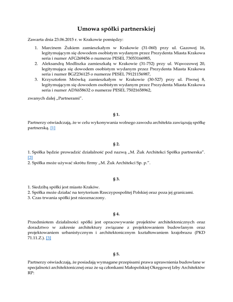 Umowa spółki partnerskiej Zawarta dnia 23.06.2015 r. w Krakowie pomiędzy: 1. Marcinem Żukiem zamieszkałym w Krakowie (31-060) przy ul. Gazowej 16, legitymującym się dowodem osobistym wydanym przez Prezydenta Miasta Krakowa seria i numer AFG269456 o numerze PESEL 73053166985, 2. Aleksandrą Modliszka zamieszkałą w Krakowie (31-752) przy ul. Wąwozowej 20, legitymująca się dowodem osobistym wydanym przez Prezydenta Miasta Krakowa seria i numer BGZ236125 o numerze PESEL 79121156987, 3. Krzysztofem Mrówką zamieszkałym w Krakowie (30-527) przy ul. Piwnej 8, legitymującym się dowodem osobistym wydanym przez Prezydenta Miasta Krakowa seria i numer ADX658632 o numerze PESEL 75021658962, zwanych dalej „Partnerami”. § 1. Partnerzy oświadczają, że w celu wykonywania wolnego zawodu architekta zawiązują spółkę partnerską. [1] § 2. 1. Spółka będzie prowadzić działalność pod nazwą „M. Żuk Architekci Spółka partnerska”. [2] 2. Spółka może używać skrótu firmy „M. Żuk Architekci Sp. p.”. § 3. 1. Siedzibą spółki jest miasto Kraków. 2. Spółka może działać na terytorium Rzeczypospolitej Polskiej oraz poza jej granicami. 3. Czas trwania spółki jest nieoznaczony. § 4. Przedmiotem działalności spółki jest opracowywanie projektów architektonicznych oraz doradztwo w zakresie architektury związane z projektowaniem budowlanym oraz projektowaniem urbanistycznym i architektonicznym kształtowaniem krajobrazu (PKD 71.11.Z.). [3] § 5. Partnerzy oświadczają, że posiadają wymagane przepisami prawa uprawnienia budowlane w specjalności architektonicznej oraz że są członkami Małopolskiej Okręgowej Izby Architektów RP: a. Marcin Żuk wpisany pod numerem: MP-2055, b. Aleksandra Modliszka wpisana pod numerem: MP-3200, c. Krzysztof Mrówka wpisany pod numerem: MP-2099. § 6. 1. Partnerzy wnoszą do spółki następujące wkłady: a. Marcin Żuk wnosi wkład pieniężny w wysokości 40.000,00 zł (czterdzieści tysięcy złotych) oraz zobowiązuje się do świadczenia na rzecz Spółki usług architektonicznych, b. Aleksandra Modliszka wnosi wkład pieniężny w wysokości 20.000,00 zł (dwadzieścia tysięcy złotych) oraz zobowiązuje się do świadczenia na rzecz Spółki usług architektonicznych, c. Krzysztof Mrówka wnosi wkład pieniężny w wysokości 20.000,00 zł (dwadzieścia tysięcy złotych) oraz zobowiązuje się do świadczenia na rzecz Spółki usług architektonicznych. 2. Wartość powyższych wkładów niepieniężnych Partnerzy wyceniają na 40.000,00 zł (czterdzieści tysięcy złotych) każdy. 3. Prawo żądania corocznie wypłacenia odsetek od udziału kapitałowego Partnera jest wyłączone w okresie 5 kolejnych lat obrotowych licząc od daty wpisu Spółki do rejestru. [4] § 7. 1. Partnerzy uczestniczą w zysku w następujący sposób: [5] a. Marcin Żuk – 50%, b. Aleksandra Modliszka – 25%, c. Krzysztof Mrówka – 25%. 2. W stratach spółki Partnerzy uczestniczą w częściach równych. § 8. 1. Prowadzenie spraw spółki i jej reprezentację powierza się zarządowi spółki. [6] 2. Zarząd może być jednoosobowy lub wieloosobowy. 3. W przypadku zarządu wieloosobowego każdy członek zarządu może prowadzić sprawy spółki oraz reprezentować spółkę samodzielnie. 4. Członkowie zarządu mogą być powołani spośród Partnerów lub spoza ich grona. 5. O powołaniu osoby na stanowisko członka zarządu decydują jednomyślną uchwałą wszyscy Partnerzy. Powołanie członka zarządu następuje na czas nieoznaczony. Art. 201 § 1 k.s.h. w zw. z art. 97 § 2 k.s.h. nie stosuje się. 6. Odwołanie osoby z funkcji członka zarządu może nastąpić w każdym czasie uchwałą Partnerów podjętą zwykłą większością głosów. 7. Prawo członka zarządu do prowadzenia spraw spółki i jej reprezentowania dotyczy wszystkich czynności sądowych i pozasądowych spółki z zastrzeżeniem ust. 8 niniejszego paragrafu. 8. Jednomyślnej uchwały wszystkich Partnerów wymaga: a. udzielenie oraz odwołanie prokury, b. powołanie pełnomocnika Spółki do zawierania umów z członkiem Zarządu, c. ustalenie wynagrodzenia członka zarządu, d. zawieranie umów o pracę, e. dokonanie rozporządzenia prawem lub zaciągnięcia zobowiązania o wartości powyżej 200.000,00 zł (dwieście tysięcy złotych), f. zawieranie umów na czas nieoznaczony, których okres wypowiedzenia jest dłuższy niż 3 miesiące, g. zbycie i wydzierżawienie przedsiębiorstwa spółki lub jego zorganizowanej części oraz ustanowienie na nich ograniczonego prawa rzeczowego, h. nabycie, zbycie lub obciążenie nieruchomości lub udziału nieruchomości. § 9. 1. Rozwiązanie spółki powodują: a. jednomyślna uchwała wszystkich Partnerów, b. ogłoszenie upadłości spółki, c. utrata przez wszystkich Partnerów prawa wykonywania wolnego zawodu, d. prawomocne orzeczenie sądu. 2. W przypadku rozwiązania spółki przeprowadza się jej likwidację na zasadach określonych w Kodeksie spółek handlowych. 3. Śmierć Partnera, ogłoszenie upadłości Partnera, wypowiedzenie umowy spółki przez Partnera lub wierzyciela Partnera nie powoduje rozwiązania spółki, a spółka trwa pomiędzy pozostałymi Partnerami. 4. Spadkobierca Partnera nie może wstąpić do spółki w miejsce zmarłego Partnera. 5. W przypadku, gdy w spółce pozostanie tylko jeden Partner lub gdy tylko jeden Partner będzie posiadał uprawnienia do wykonywania zawodu architekta, spółka rozwiązuje się z upływem roku od dnia, w którym nastąpiły zdarzenia powodujące rozwiązanie spółki, chyba że przed jego upływem do spółki przystąpi nowy Partner posiadający uprawnienia do wykonywania zawodu architekta. § 10. 1. Rok obrotowy spółki pokrywa się z rokiem kalendarzowym. 2. Pierwszy rok obrotowy spółki kończy się dnia 31 grudnia 2015 roku. § 11. Zmiana postanowień niniejszej umowy wymaga zgody wszystkich Partnerów i zachowania formy pisemnej pod r