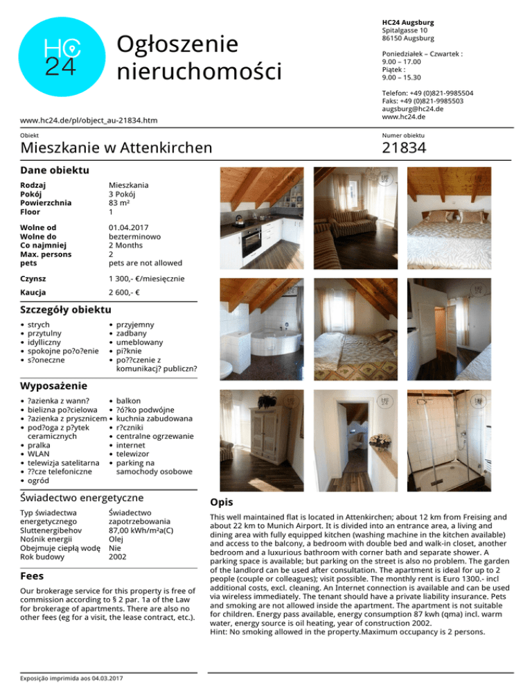 Ogłoszenie nieruchomości HC24 Augsburg Spitalgasse 10 86150 Augsburg Poniedziałek – Czwartek : 9.00 – 17.00 Piątek : 9.00 – 15.30 Telefon: +49 (0)821-9985504 Faks: +49 (0)821-9985503 [email protected] www.hc24.de www.hc24.de/pl/object_au-21834.htm Obiekt Numer obiektu Mieszkanie w Attenkirchen 21834 Dane obiektu Rodzaj Pokój Powierzchnia Floor Mieszkania 3 Pokój 83 m² 1 Wolne od Wolne do Co najmniej Max. persons pets 01.04.2017 bezterminowo 2 Months 2 pets are not allowed Czynsz 1 300,- €/miesięcznie Kaucja 2 600,- € Szczegóły obiektu strych przytulny idylliczny spokojne po?o?enie s?oneczne przyjemny zadbany umeblowany pi?knie po??czenie z komunikacj? publiczn? Wyposażenie ?azienka z wann? bielizna po?cielowa ?azienka z prysznicem pod?oga z p?ytek ceramicznych pralka WLAN telewizja satelitarna ??cze telefoniczne ogród balkon ?ó?ko podwójne kuchnia zabudowana r?czniki centralne ogrzewanie internet telewizor parking na samochody osobowe Świadectwo energetyczne Typ świadectwa energetycznego Sluttenergibehov Nośnik energii Obejmuje ciepłą wodę Rok budowy Świadectwo zapotrzebowania 87,00 kWh/m²a(C) Olej Nie 2002 Fees Our brokerage service for this property is free of commission according to § 2 par. 1a of the Law for brokerage of apartments. There are also no other fees (eg for a visit, the lease contract, etc.). Exposição imprimida aos 04.03.2017 Powered by TCPDF (www.tcpdf.org) Opis This well maintained flat is located in Attenkirchen; about 12 km from Freising and about 22 km to Munich Airport. It is divided into an entrance area, a living and dining area with fully equipped kitchen (washing machine in the kitchen available) and access to the balcony, a bedroom with double bed and walk-in closet, another bedroom and a luxurious bathroom with corner bath and separate shower. A parking space is available; but parking on the street is also no problem. The garden of the landlord can be used after consultation. The apartment is ideal for up to 2 people (couple or colleagues); visit possible. The monthly rent is Euro 1300.- incl additional costs, excl. cleaning. An Internet connection is available and can be used via wireless immediately. The tenant should have a private liability insurance. Pets and smoking are not allowed inside the apartment. The apartment is not suitable for children. Energy pass available, energy consumption 87 kwh (qma) incl. warm water, energy source is oil heating, year of construction 2002. Hint: No smoking allowed in the property.Maximum occupancy is 2 persons.