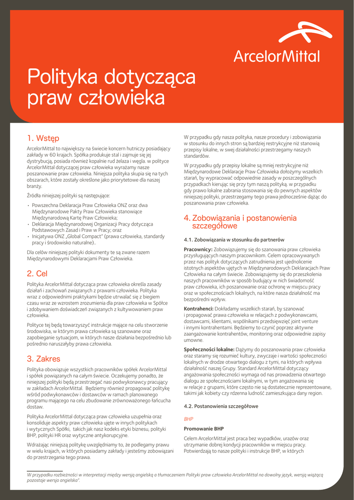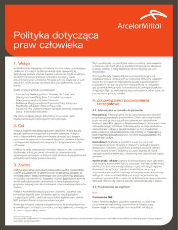 Polityka dotycząca praw człowieka 1. Wstęp ArcelorMittal to największy na świecie koncern hutniczy posiadający zakłady w 60 krajach. Spółka produkuje stal i zajmuje się jej dystrybucją, posiada również kopalnie rud żelaza i węgla. w polityce ArcelorMittal dotyczącej praw człowieka wyrażamy nasze poszanowanie praw człowieka. Niniejsza polityka skupia się na tych obszarach, które zostały określone jako priorytetowe dla naszej branży. Źródła niniejszej polityki są następujące: • Powszechna Deklaracja Praw Człowieka ONZ oraz dwa Międzynarodowe Pakty Praw Człowieka stanowiące Międzynarodową Kartę Praw Człowieka; • Deklaracja Międzynarodowej Organizacji Pracy dotycząca Podstawowych Zasad i Praw w Pracy; oraz • Inicjatywa ONZ „Global Compact” (prawa człowieka, standardy pracy i środowisko naturalne).. Dla celów niniejszej polityki dokumenty te są zwane razem Międzynarodowymi Deklaracjami Praw Człowieka. 2. Cel Polityka ArcelorMittal dotycząca praw człowieka określa zasady działań i zachowań związanych z prawami człowieka. Polityka wraz z odpowiednimi praktykami będzie utrwalać się z biegiem czasu wraz ze wzrostem zrozumienia dla praw człowieka w Spółce i zdobywaniem doświadczeń związanych z kultywowaniem praw człowieka. Polityce tej będą towarzyszyć instrukcje mające na celu stworzenie środowiska, w którym prawa człowieka są szanowane oraz zapobieganie sytuacjom, w których nasze działania bezpośrednio lub pośrednio naruszałyby prawa człowieka. 3. Zakres Polityka obowiązuje wszystkich pracowników spółek ArcelorMittal i spółek powiązanych na całym świecie. Oczekujemy ponadto, że niniejszej polityki będą przestrzegać nasi podwykonawcy pracujący w zakładach ArcelorMittal. Będziemy również propagować politykę wśród podwykonawców i dostawców w ramach planowanego programu mającego na celu zbudowanie zrównoważonego łańcucha dostaw. Polityka ArcelorMittal dotycząca praw człowieka uzupełnia oraz konsoliduje aspekty praw człowieka ujęte w innych politykach i wytycznych Spółki, takich jak nasz kodeks etyki biznesu, polityki BHP, polityki HR oraz wytyczne antykorupcyjne. Wdrażając niniejszą politykę uwzględniamy to, że podlegamy prawu w wielu krajach, w których posiadamy zakłady i jesteśmy zobowiązani do przestrzegania tego prawa. W przypadku gdy nasza polityka, nasze procedury i zobowiązania w stosunku do innych stron są bardziej restrykcyjne niż stanowią przepisy lokalne, w swej działalności przestrzegamy naszych standardów. W przypadku gdy przepisy lokalne są mniej restrykcyjne niż Międzynarodowe Deklaracje Praw Człowieka dołożymy wszelkich starań, by wypracować odpowiednie zasady w poszczególnych przypadkach kierując się przy tym naszą polityką. w przypadku gdy prawo lokalne zabrania stosowania się do pewnych aspektów niniejszej polityki, przestrzegamy tego prawa jednocześnie dążąc do poszanowania praw człowieka. 4.Zobowiązania i postanowienia szczegółowe 4.1. Zobowiązania w stosunku do partnerów Pracownicy: Zobowiązujemy się do szanowania praw człowieka przysługujących naszym pracownikom. Celem opracowywanych przez nas polityk dotyczących zatrudnienia jest ujednolicenie istotnych aspektów ujętych w Międzynarodowych Deklaracjach Praw Człowieka na całym świecie. Zobowiązujemy się do przeszkolenia naszych pracowników w sposób budujący w nich świadomość praw człowieka, ich poszanowanie oraz ochronę w miejscu pracy oraz w społecznościach lokalnych, na które nasza działalność ma bezpośredni wpływ. Kontrahenci: Dokładamy wszelkich starań, by szanować i propagować prawa człowieka w relacjach z podwykonawcami, dostawcami, klientami, wspólnikami przedsięwzięć joint venture i innymi kontrahentami. Będziemy to czynić poprzez aktywne zaangażowanie kontrahentów, monitoring oraz odpowiednie zapisy umowne. Społeczności lokalne: Dążymy do poszanowania praw człowieka oraz staramy się rozumieć kultury, zwyczaje i wartości społeczności lokalnych w drodze otwartego dialogu z tymi, na których wpływa działalność naszej Grupy. Standard ArcelorMittal dotyczący angażowania społeczności wymaga od nas prowadzenia otwartego dialogu ze społecznościami lokalnymi, w tym angażowania się w relacje z grupami, które często nie są dostatecznie reprezentowane, takimi jak kobiety czy rdzenna ludność zamieszkująca dany region. 4.2. Postanowienia szczegółowe BHP Promowanie BHP Celem ArcelorMittal jest praca bez wypadków, urazów oraz utrzymanie dobrej kondycji pracowników w miejscu pracy. Potwierdzają to nasze polityki i instrukcje BHP, w których W przypadku rozbieżności w interpretacji między wersją angielską a tłumaczeniem Polityki praw człowieka ArcelorMittal na dowolny język, wersją wiążącą pozostaje wersja angielska”. propagowana jest nasza filozofia produkowania stali w bezpieczny i zrównoważony sposób. Praca Promowanie wolności zgromadzeń ArcelorMittal wspiera wolność zgromadzeń oraz uznaje prawo do sporów zbiorowych. Podejmujemy również współpracę z podwykonawcami i dostawcami w celu realizacji tej zasady. Eliminacja pracy przymusowej i niewolniczej ArcelorMittal sprzeciwia się pracy przymusowej i niewolniczej. Podejmiemy również współpracę z podwykonawcami i dostawcami, by zapobiegać pośredniemu czerpaniu korzyści lub promowaniu tego typu nielegalnych działań. Zniesienie pracy dzieci ArcelorMittal sprzeciwia się korzystaniu z pracy dzieci. Podejmiemy również współpracę z podwykonawcami i dostawcami podwykonawcami i dostawcami, by zapobiegać przypadkom pracy dziecięcej, a istniejące eliminować, w sposób leżący w najlepszym interesie dziecka. Eliminacja niedozwolonej dyskryminacji w miejscu pracy ArcelorMittal zobowiązuje się do tego, by każdy pracownik i potencjalny pracownik był traktowany w sposób uczciwy i godny. Nie będą tolerowane 
