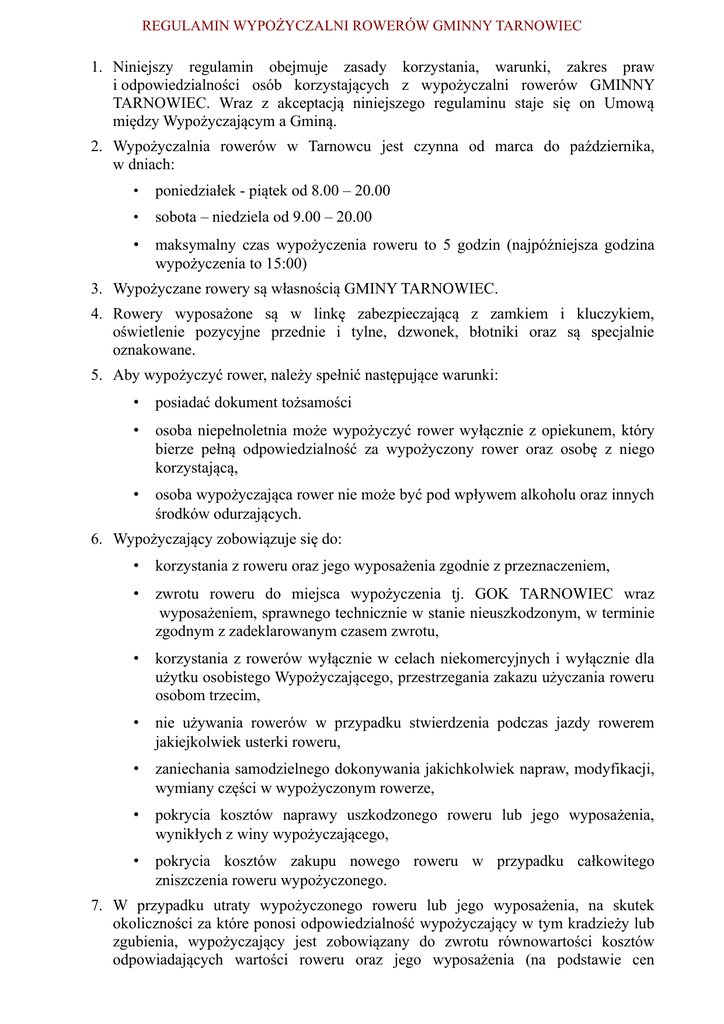 REGULAMIN WYPOŻYCZALNI ROWERÓW GMINNY TARNOWIEC 1. Niniejszy regulamin obejmuje zasady korzystania, warunki, zakres praw i odpowiedzialności osób korzystających z wypożyczalni rowerów GMINNY TARNOWIEC. Wraz z akceptacją niniejszego regulaminu staje się on Umową między Wypożyczającym a Gminą. 2. Wypożyczalnia rowerów w Tarnowcu jest czynna od marca do października, w dniach: • poniedziałek - piątek od 8.00 – 20.00 • sobota – niedziela od 9.00 – 20.00 • maksymalny czas wypożyczenia roweru to 5 godzin (najpóźniejsza godzina wypożyczenia to 15:00) 3. Wypożyczane rowery są własnością GMINY TARNOWIEC. 4. Rowery wyposażone są w linkę zabezpieczającą z zamkiem i kluczykiem, oświetlenie pozycyjne przednie i tylne, dzwonek, błotniki oraz są specjalnie oznakowane. 5. Aby wypożyczyć rower, należy spełnić następujące warunki: • posiadać dokument tożsamości • osoba niepełnoletnia może wypożyczyć rower wyłącznie z opiekunem, który bierze pełną odpowiedzialność za wypożyczony rower oraz osobę z niego korzystającą, • osoba wypożyczająca rower nie może być pod wpływem alkoholu oraz innych środków odurzających. 6. Wypożyczający zobowiązuje się do: • korzystania z roweru oraz jego wyposażenia zgodnie z przeznaczeniem, • zwrotu roweru do miejsca wypożyczenia tj. GOK TARNOWIEC wraz wyposażeniem, sprawnego technicznie w stanie nieuszkodzonym, w terminie zgodnym z zadeklarowanym czasem zwrotu, • korzystania z rowerów wyłącznie w celach niekomercyjnych i wyłącznie dla użytku osobistego Wypożyczającego, przestrzegania zakazu użyczania roweru osobom trzecim, • nie używania rowerów w przypadku stwierdzenia podczas jazdy rowerem jakiejkolwiek usterki roweru, • zaniechania samodzielnego dokonywania jakichkolwiek napraw, modyfikacji, wymiany części w wypożyczonym rowerze, • pokrycia kosztów naprawy uszkodzonego roweru lub jego wyposażenia, wynikłych z winy wypożyczającego, • pokrycia kosztów zakupu nowego roweru w przypadku całkowitego zniszczenia roweru wypożyczonego. 7. W przypadku utraty wypożyczonego roweru lub jego wyposażenia, na skutek okoliczności za które ponosi odpowiedzialność wypożyczający w tym kradzieży lub zgubienia, wypożyczający jest zobowiązany do zwrotu równowartości kosztów odpowiadających wartości roweru oraz jego wyposażenia (na podstawie cen obowiązujących na rynku w dniu stwierdzenia faktu). 8. Wypożyczający zgadza się pokryć wszystkie szkody i kary związane z użytkowaniem roweru wynikające z nieprzestrzegania przepisów prawa obowiązujących w Polsce w tym wynikające z Kodeksu Ruchu Drogowego. 9. Pełną odpowiedzialność za wypadki, wszelkie szkody powstałe w czasie korzystania z wypożyczonego roweru ponosi Wypożyczający. Wypożyczający będąc uczestnikiem ruchu drogowego jest obowiązany przestrzegać zasad poruszania się po drogach i czyni to tylko i wyłącznie na własną odpowiedzialność. Użytkownik zrzeka się wszelkich roszczeń wobec Gminy Tarnowiec z tytułu wypadków, poniesionych szkód lub obrażeń powstałych w okresie korzystania z wypożyczonych rowerów. 10. Wypożyczający ponosi wyłączną odpowiedzialność za wszelkie szkody wyrządzone osobom trzecim związane z korzystaniem z wypożyczonych rowerów. 11. W przypadku wypożyczenia rowerów przez grupę zorganizowaną konieczne jest wcześniejsze uzgodnienie terminu oraz ilości rowerów z pracownikiem GOK-u. 12. W przypadku nie zwrócenia roweru do momentu zamknięcia Wypożyczalni, tj. do godz. 20.00, dane Wypożyczającego będą przekazane policji z informacją o prawdopodobieństwie popełnienia czynu karalnego przez Wypożyczającego. 13. Wypożyczający zobowiązuje się przestrzegać warunków Regulaminu w szczególności zapłacić należności wynikające z regulaminu wypożyczalni oraz używać roweru zgodnie z regulaminem. 14. Rezerwacji rowerów można dokonywać pod nr. tel. 134424842 lub 885555206.