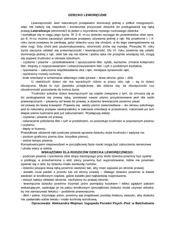 DZIECKO LEWORĘCZNE Leworęczność Jest naturalnym przejawem dominacji jednej z półkul mózgowych, więc nie należy się niepokoić i koniecznie przyuczać dziecka do posługiwania się ręką prawą.Lateralizacja (stronność) to jeden z czynników rozwoju ruchowego dziecka i kształtuje się w ciągu jego życia. W 3.-6. m-cu dziecko wyciąga do przedmiotów obie ręce, po 6. m-cu można zauważyć pierwsze przejawy używania jednej z rąk. Na przełomie I. i II. roku życia przejawy te zanikają, gdyż dziecko uczy się chodzić, a do tego zaangażowane są obie nogi. Gdy chód jest zautomatyzowany, stronność znów się rozwija. Powyżej III. roku życia zaczyna ustalać się praworęczność i leworęczność. Do VI. roku powinna się ustalić dominacja jednej z rąk. Jeśli tak się nie stanie i jedna ręka nie przejmie wiodącej roli, mogą się pojawić trudności w okresie szkolnym: - czytanie i pisanie – przeskakiwanie i opuszczanie liter, sylab, wyrazów, zmiana kolejności liter, kłopoty z rozpoznawaniem i odwzorowywaniem liter i cyfr o podobnym kształcie, - rysowanie – zaburzone współdziałanie oka i ręki, mniejsza sprawność ręki, - opóźniony rozwój ruchowy, - brak orientacji w schemacie własnego ciała (prawa – lewa strona, góra – dół). U niektórych dzieci nie ma wyraźnych różnic w pracy obu rąk – są to dzieci oburęczne. Może to być zjawisko przejściowe, ale zdarza się, że oburęczność czy obustronność pozostanie do końca życia. Trudności szkolne dzieci leworęcznych są często związane z tym, że zmusza się je do posługiwania się prawą ręką, ponieważ nasze pismo przystosowane jest dla osób praworęcznych – piszemy od lewej do prawej, a dziecko leworęczne powinno pisać od prawej do lewej krawędzi. Pojawia się wtedy pismo zwierciadlane – do okresu szkolnego jest to naturalny przejaw niedojrzałości w zakresie orientacji w przestrzeni, natomiast po tym etapie pismo lustrzane jest już zaburzeniem. Występują wtedy: - czytanie i pisanie od prawej, - odwracanie położenia liter i cyfr w przestrzeni, co powoduje trudności w poprawnym pisaniu i czytaniu, - błędy w liczeniu. Prawidłowe ułożenie ręki podczas pisania sprawia dziecku duże trudności i wpływa na: - poziom graficzny pisma (tzw. brzydkie pismo), - wolne tempo pisania. Konsekwencjami niepowodzeń w początkowej fazie nauki mogą być zaburzenia nerwicowe i utrata wiary w siebie. WSKAZÓWKI DLA RODZICÓW DZIECKA LEWORĘCZNEGO: - podczas pisania i rysowania obie stopy siedzącego przy stole dziecka powinny być oparte o podłogę, a przedramiona o stół; plecy powinny być wyprostowane, tułów nie powinien opierać się o stół, by dziecko miało swobodę ruchów; - dziecko piszące lewą ręką powinno siedzieć tak, aby mieć sąsiada po stronie prawej; - światło musi padać z przodu lub od strony prawej – dlatego dziecko powinno w klasie siedzieć w środkowym rzędzie, gdzie światło jest najbardziej rozproszone; - zeszyt należy układać skośnie, nachylony ku prawej stronie; - leworęczne dziecko powinno trzymać pióro pomiędzy kciukiem i lekko zgiętym palcem wskazującym, opierając je na palcu środkowym (początkowo dziecko może używać ołówka, by nie zamazywać tekstu) – podobnie praworęczne; - dłoń i palce, trzymając pióro, powinny się znajdować poniżej liniatury zeszytu, aby dziecko nie zasłaniało sobie tekstu i miało kontrolę wzrokową. Opracowała: Aleksandra Wejman, logopeda Poradni Psych.-Ped. w Bełchatowie