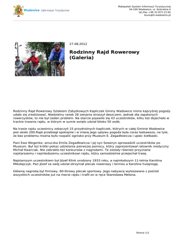 Małopolski System Informacji Turystycznej 34-100 Wadowice, ul. Kościelna 4 tel./fax +48 33 873 23 65 [email protected] 27.08.2012 Rodzinny Rajd Rowerowy (Galeria) Rodzinny Rajd Rowerowy Szlakiem Zabytkowych Kapliczek Gminy Wadowice mimo kapryśnej pogody udało się zrealizować. Niedzielny ranek 26 sierpnia straszył deszczem, jednak dla zapalonych rowerzystów, to nie był żaden problem. Na starcie pojawiło się 43 uczestników, kilku też dojechało w trackie trwania rajdu, w którym w sumie wzięło udział blisko 50 osób. Na trasie rajdu uczestnicy zobaczyli 15 przydrożnych kapliczek, których w całej Gminie Wadowice jest około 200.Rajd przebiegł spokojnie i w miarę jego upływu pogoda była coraz łaskawsza, na tyle, że bez problemu można było rozpalić ognisko przy Muzeum E. Zegadłowicza i upiec kiełbaski. Pani Ewa Wegenke, wnuczka Emila Zegadłowicza i jej syn Seweryn oprowadzili uczestników po Muzeum. Był też krótki pokaz udzielania pierwszej pomocy, który zaprezentował ratownik medyczny Michał Kwarciak. Nie zabrakło też konkursów z nagrodami. Te zostały również przyznane najstarszemu i najmłodszemu uczestnikowi rajdu, który samodzielnie przejechał trasę. Najstarszym uczestnikiem był Józef Klink urodzony 1933 roku, a najmłodszym 11-letnia Karolina Mikołajczyk. Pan Józef za swój udział otrzymał plecak rowerowy i termos a Karolina hulajnogę. Główną nagrodą był firmowy, 60-litrowy plecak sportowy. Jego nabywcę wylosowano z pośród wszystkich uczestników już na mecie rajdu i trafił on w ręce Stanisława Melona. Strona 1/1 Powered by TCPDF (www.tcpdf.org)