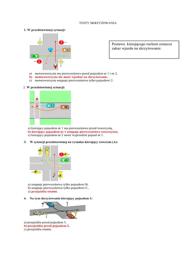 TESTY SKRZYŻOWANIA 1. W przedstawionej sytuacji: Postawa kierującego ruchem oznacza zakaz wjazdu na skrzyżowanie. a) motorowerzysta ma pierwszeństwo przed pojazdem nr 1 i nr 2, b) motorowerzysta nie może wjechać na skrzyżowanie, c) motorowerzysta ustępuje pierwszeństwa tylko pojazdowi 2. 2. W przedstawionej sytuacji: a) kierujący pojazdem nr 1 ma pierwszeństwo przed rowerzystą, b) kierujący pojazdem nr 1 ustępuje pierwszeństwa rowerzyście, c) kierujący pojazdem nr 2 może wyprzedzić pojazd nr 1. 3. W sytuacji przedstawionej na rysunku kierujący rowerem (A): a) ustępuje pierwszeństwa tylko pojazdowi B, b) ustępuje pierwszeństwa tylko pojazdowi C, c) przejeżdża ostatni. 4. Na tym skrzyżowaniu kierujący pojazdem 1: a) przejeżdża przed pojazdem 3, b) przejeżdża przed pojazdem 2, c) przejeżdża ostatni. 5. Na tym skrzyżowaniu kierujący pojazdem 1 ma pierwszeństwo przed pojazdem: a) 2, b) 3, c) uprzywilejowanym nr 4. 6. W tej sytuacji kierujący pojazdem powinien zatrzymać pojazd: a) – tuż przed przejściem dla pieszych, b) – na wysokości znaku oznaczającego przystanek, c) – w takim miejscu aby zapewnić pieszym dojście do tramwaju. 7. W przedstawionej sytuacji kierujący rowerem: a) – ustępuje pierwszeństwa pojazdowi 1, b) – ustępuje pierwszeństwa pojazdowi 2, c) – ma pierwszeństwo przed pojazdem 2. 8. W tej sytuacji skrzyżowanie może opuścić pojazd: a) – 1, b) – 2, c) – 3. 9. Na tym skrzyżowaniu kierujący pojazdem 1: a) – ustępuje pierwszeństwa pojazdowi 3, b) – ustępuje pierwszeństwa pojazdowi 2, c) – przejeżdża pierwszy. 10. W tej sytuacji kierujący pojazdem 1: a) – powinien zatrzymać pojazd przed przejściem dla pieszych, b) – może przejechać przez przejście dla pieszych z zachowaniem szczególnej ostrożności, c) – może przejechać przez przejście dla pieszych, jeżeli pojazd 2 zaczyna ruszać. 11. W przedstawionej sytuacji rowerzysta: a) – ma pierwszeństwo przed tramwajem, b) – ustępuje pierwszeństwa tramwajowi i pojazdowi 2, c) – ustępuje pierwszeństwa tylko pojazdowi 2. 12. Na tym skrzyżowaniu kierujący pojazdem 1: a) – ustępuje pierwszeństwa pojazdowi 2, b) – ma pierwszeństwo przed pojazdem 3, c) – przejeżdża ostatni. 13. W przedstawionej sytuacji rowerzysta przejeżdża jako: a) pierwszy, b) drugi, c) trzeci. 14. W tej sytuacji kierujący pojazdem 1: a) ustępuje pierwszeństwa pojazdowi 3, b) ustępuje pierwszeństwa pojazdowi 2, c) przejeżdża ostatni 15. W tej sytuacji pojazd 1: a) ustępuje pierwszeństwa pojazdowi 2, b) ustępuje pierwszeństwa rowerzyście, c) przejeżdża pierwszy. 16. W sytuacji przedstawionej na rysunku kierujący rowerem (A): a) przejeżdża ostatni, b) ustępuje pierwszeństwa tylko pojazdowi C, c) ustępuje pierwszeństwa tylko pojazdowi B. 17. W przedstawionej sytuacji kierujący rowerem: a) ustępuje pierwszeństwa pojazdowi nr 1, b) ustępuje pierwszeństwa pojazdowi nr 2, c) ma pierwszeństwo przed pojazdem nr 2. 18. W przedstawionej sytuacji rowerzysta: a) ustępuje pierwszeństwa pojazdowi nr 2 b) ustępuje pierwszeństwa pojazdowi nr 1 c) przejeżdża jako pierwszy 19. Kierujący pojazdem nr 1 na takim skrzyżowaniu: a) ma pierwszeństwo przed pojazdem nr 2, b) ma pierwszeństwo przed pojazdem nr 3, c) przejeżdża ostatni. 20. Na tym skrzyżowaniu kierujący pojazdem nr 3: a) przejeżdża przed pojazdem nr 2, b) przejeżdża przed pojazdem nr 1, c) przejeżdża ostatni. 21. Na tym skrzyżowaniu kierujący pojazdem nr 1: a) ustępuje pierwszeństwa pojazdowi 2, b) ustępuje pierwszeństwa pojazdowi 4, c) przejeżdża pierwszy. 22. Na tym skrzyżowaniu kierujący pojazdem nr 1: a) przejeżdża przed pojazdem nr 3, b) przejeżdża przed pojazdem nr 2, c) przejeżdża ostatni. 23. Na tym skrzyżowaniu kierujący pojazdem nr 1: a) przejeżdża przed pojazdem 2, b) ustępuje pierwszeństwa pojazdowi 4, c) przejeżdża pierwszy. 24. W przedstawionej sytuacji kierujący pojazdem nr 3: a) ma pierwszeństwo przed pojazdem 2, b) wjeżdża pierwszy c) ma pierwszeństwo przed pojazdem 1 25. W tej sytuacji rowerzysta: a) ustępuje pierwszeństwa pojazdowi 2, b) ustępuje pierwszeństwa pojazdowi 1, c) przejeżdża pierwszy. 26. W tej sytuacji kierujący pojazdem 3: a) ustępuje pierwszeństwa pojazdowi 1, b) przejeżdża pierwszy, c) przejeżdża ostatni. 27. W przedstawionej sytuacji kierujący rowerem nr 1, zamierzając jechać na wprost: a) nie może wjechać na skrzyżowanie b) może wjechać na skrzyżowanie i zatrzymać się na wysokości pasa dzielącego jezdnie c) może zatrzymać się tuż za przejściem dla pieszych 28. W tej sytuacji kierujący rowerem z numerem 1: a) ma pierwszeństwo przed pojazdem numer 3, b) ustępuje pierwszeństwa tylko tramwajowi z numerem 2, c) jedzie ostatni. 29. W tej sytuacji rowerzysta z numerem 1: a) ustępuje pierwszeństwa pojazdowi z numerem 3, b) ma pierwszeństwo tylko przed pojazdem numer 2, c) jedzie pierwszy. 30. W tej sytuacji kolejność przejazdu jest następująca: a) 4-1-2-3, b) 1-2-3-4, c) 3-4-1-2. 31. W przedstawionej sytuacji jako drugi pojedzie: a) pojazd A, b) pojazd B, c) pojazd C. 32. W przedstawionej sytuacji rowerzysta przejeżdża jako: a) pierwszy, b) drugi, c) trzeci. 33. Rowerzysta: a) pojedzie jako drugi b) zatrzymując się nie powinien wjeżdżać na jezdnię poprzeczną c) jest pod ochroną, więc przejedzie przed tramwajem 34. Rowerzysta nie może: a) na tym skrzyżowaniu skręcić w lewo b) pojechać przed czerwonym pojazdem jadącym z przeciwka c) zwalniać przed skrzyżowaniem