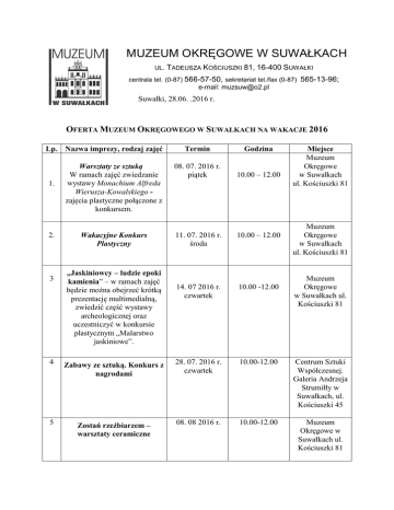 MUZEUM OKRĘGOWE W SUWAŁKACH UL. TADEUSZA KOŚCIUSZKI 81, 16-400 SUWAŁKI centrala tel. (0-87) 566-57-50, sekretariat tel./fax (0-87) 565-13-96; e-mail: [email protected] Suwałki, 28.06. .2016 r. OFERTA MUZEUM OKRĘGOWEGO W SUWAŁKACH NA WAKACJE 2016 Lp. Nazwa imprezy, rodzaj zajęć 1. 2. 3 Warsztaty ze sztuką W ramach zajęć zwiedzanie wystawy Monachium Alfreda Wierusza-Kowalskiego zajęcia plastyczne połączone z konkursem. Wakacyjne Konkurs Plastyczny „Jaskiniowcy – ludzie epoki kamienia” – w ramach zajęć będzie można obejrzeć krótką prezentację multimedialną, zwiedzić część wystawy archeologicznej oraz uczestniczyć w konkursie plastycznym „Malarstwo jaskiniowe”. Termin Godzina 08. 07. 2016 r. piątek 10.00 – 12.00 11. 07. 2016 r. środa 10.00 – 12.00 14. 07 2016 r. czwartek 10.00 -12.00 Miejsce Muzeum Okręgowe w Suwałkach ul. Kościuszki 81 Muzeum Okręgowe w Suwałkach ul. Kościuszki 81 Muzeum Okręgowe w Suwałkach ul. Kościuszki 81 4 Zabawy ze sztuką. Konkurs z nagrodami 28. 07. 2016 r. czwartek 10.00-12.00 Centrum Sztuki Współczesnej. Galeria Andrzeja Strumiłły w Suwałkach, ul. Kościuszki 45 5 Zostań rzeźbiarzem – warsztaty ceramiczne 08. 08 2016 r. 10.00-12.00 Muzeum Okręgowe w Suwałkach ul. Kościuszki 81 6 Wakacyjne spotkania z krasnoludkami 7. Poznajemy swoje miasto – zabawy historyczne 17. 08. 2016 r. piątek 18. 08. 2016 r. czwartek 10.00 -12.00 10.00-12.00 Muzeum im. Marii Konopnickiej w Suwałkach ul. Kościuszki 31 Muzeum Okręgowe w Suwałkach ul. Kościuszki 81 Serdecznie zapraszamy do skorzystania z naszych propozycji i jednocześnie informujemy, że zajęcia są bezpłatne. Dzieci do lat 7 zapraszamy z opiekunami.