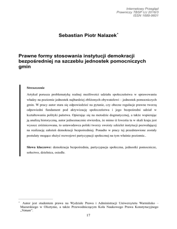 Internetowy Przegląd Prawniczy TBSP UJ 2016/3 ISSN 1689-9601 Sebastian Piotr Nalazek * Prawne formy stosowania instytucji demokracji bezpośredniej na szczeblu jednostek pomocniczych gmin Streszczenie Artykuł porusza problematykę realnej możliwości udziału społeczeństwa w sprawowaniu władzy na poziomie jednostek najbardziej zbliżonych obywatelowi – jednostek pomocniczych gmin. W pracy autor stara się odpowiedzieć na pytanie, czy obecne regulacje prawne tworzą odpowiedni fundament pod aktywizację społeczeństwa i jego bezpośredni udział w kształtowaniu polityki państwa. Opierając się na metodzie dogmatycznej, a także wspierając ją analizą historyczną, autor jednoznacznie stwierdza, że mimo iż kwestia ta w skali kraju jest wysoce zróżnicowana, to ustawodawca polski tworzy swoisty szkielet instytucji pozwalającej na realizację założeń demokracji bezpośredniej. Ponadto w pracy tej przedstawione zostały postulaty mogące służyć rozwojowi partycypacji społecznej na tym właśnie poziomie.. Słowa kluczowe: demokracja bezpośrednia, partycypacja społeczna, jednostki pomocnicze, sołectwo, dzielnica, osiedle. ∗ Autor jest studentem prawa na Wydziale Prawa i Administracji Uniwersytetu Warmińsko – Mazurskiego w Olsztynie, a także Przewodniczącym Koła Naukowego Prawa Konstytucyjnego „Votum”. (17 1. Wstęp Zasada systemu demokratycznego obecna jest w ustawach zasadniczych wielu współczesnych państw1 . Pojęcie to nie zostało jednak zdefiniowane w sposób legalny. Również nauka nie wypracowała jednoznacznej definicji, a poszczególni badacze podejmują różnorodne próby wypełnienia tej luki. Jednakże B. Banaszak2 podkreśla, że definicja uniwersalna nie jest konieczna ze względu na liczne różnice kulturowe, społeczne czy też te związane z określoną wizją ustroju demokratycznego. Dlatego też przedstawiciele nauki z poszczególnych państw podejmują różnorodne próby zdefiniowania terminu „demokracja”, uwzględniając przy tym wspomniane wyżej czynniki. Historycznie podstawy tegoż systemu politycznego objawiały się poprzez bezpośredni udział ludności w procesach decyzyjnych. Partycypacja społeczna występująca we współczesnych państwach demokratycznych jest więc swoistą próbą restauracji ustroju wywodzącego się ze starożytnych Aten, a także w dużej mierze z wieców germańskich3 oraz słowiańskich4 . Jak zauważa M. H. Hansen, „Stopień aktywności politycznej obywateli Aten nie miał sobie równych w dziejach świata”5 , wyznaczając nieosiągalny wzór dla wszystkich współczesnych ustawodawstw. Charakter tej formy rządów doprowadził do ukształtowania się nowej kultury politycznej, opartej na zdecydowanie innych wzorcach niż wcześniej, a także wieki później. Dając przy tym asumpt do rozwoju instytucji demokratycznych na przełomie XVIII i XIX wieku. Odnosząc się do tej koncepcji, T. Mołdawa stwierdza, że kluczowym jej elementem jest konstatacja, że „demokracja nie może w sposób trwały istnieć bez aktywności obywateli”6. Aktywność ta objawia się licznym, intensywnym i refleksyjnym uczestnictwem w procesie decyzyjnym. Jednak ze względu na liczne ograniczenia systemowe ustrój demokratyczny rozwijał się po okresie ateńskiej demokracji w dość ograniczonych formach i nie rozpowszechnił się w tak szerokiej, jak obecnie, skali. Poszukując na przestrzeni 1 B. Banaszak wymienia w tym gronie: art. 20 ustawy zasadniczej RFN z 1949 r., art. 2 Konstytucji Rzeczpospolitej Polskiej z 2 kwietnia 1997 r. czy preambułę do Konstytucji Szwajcarii z 1999 r., szer.: B. Banaszak, Porównawcze Prawo Konstytucyjne Współczesnych Państw Demokratycznych, Warszawa 2012, s. 239. 2 B. Banaszak, Porównawcze …, s. 208. 3 P. Uziębło, Demokracja Partycypacyjna, Gdańsk 2009, s. 36. 4 B. Banaszak, Porównawcze …, s. 241. 5 M.H. Hansen, Demokracja ateńska w czasach Demostenesa, Warszawa 1999, s. 312. 6 T. Mołdawa, Aktywność polityczna obywateli w systemie demokratycznym, [w:] (red.) K. A. Wojtaszczyk, W. Jakubowski Społeczeństwo i polityka. Podstawy nauk politycznych, K. A. Wojtaszczyk, W. Jakubowski (red.) Warszawa 2007, s. 364. (18 wieków polskich doświadczeń związanych z aktywizacją obywateli, należy zwrócić uwagę na wiece ogólnopaństwowe7 czy też rozwijający się na ich kanwie ustrój demokracji szlacheckiej, który choć nie realizował obecnego wzorca, to tworzył swoiste podwaliny dzisiejszego systemu. Powrót do idei demokracji rozpoczął się w XVIII w., kiedy to coraz bardziej świadome społeczeństwa, a często również i ich władcy zaczęli formułować i uznawać zasadę suwerenności narodu. Ojcem tej koncepcji był J. J. Rousseau8, który w swych pracach dowodził, że władza zwierzchnia należy do podmiotu zbiorowego, jakim jest lud. Nie bez znaczenia w kontekście jego dzieł wydaje się fakt, iż konstatował on jednoznacznie, że władza ta sprawowana winna być w postaci przedstawicielskiej. W polskiej Konstytucji9 zasada suwerenności narodu zawarta została w art. 4, gdzie bezsprzecznie stanowi urzeczywistnienie idei zawartej w tezach wspomnianego wyżej autora. Uważał on, że najwyższa władza narodu przejawia się w momencie decydowania oraz że jest ona ostateczna i żaden inny czynnik nie może na nią wpływać. Zgodnie z § 2 art. 4 Konstytucji RP „Naród sprawuje władzę przez swoich przedstawicieli lub bezpośrednio”, przy czym zaznaczyć należy, że ta druga forma jest tylko swoistym uzupełnieniem i jako taka nie powinna być rozszerzana zanadto10 . Dodatkowo nie bez znaczenia pozostaje stanowisko części teoretyków prawa, którzy w ujęciu ogólnym krytycznie oceniają model bezpośredniego sprawowania władzy11 . Koncepcja odrzucająca współcześnie demokrację bezpośrednią opiera się na argumencie, że sprawowanie władzy przez obywateli nie jest możliwe ze względu na brak możliwości spełnienia dwóc