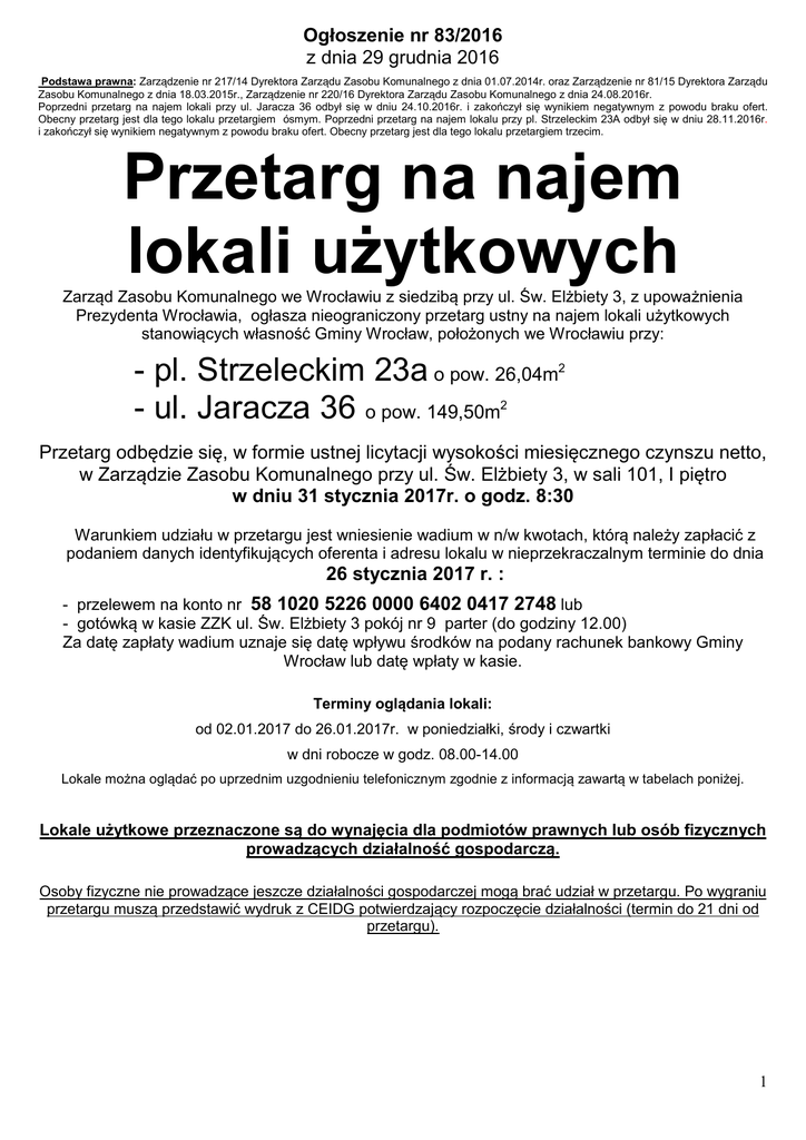 Ogłoszenie nr 83/2016 z dnia 29 grudnia 2016 Podstawa prawna: Zarządzenie nr 217/14 Dyrektora Zarządu Zasobu Komunalnego z dnia 01.07.2014r. oraz Zarządzenie nr 81/15 Dyrektora Zarządu Zasobu Komunalnego z dnia 18.03.2015r., Zarządzenie nr 220/16 Dyrektora Zarządu Zasobu Komunalnego z dnia 24.08.2016r. Poprzedni przetarg na najem lokali przy ul. Jaracza 36 odbył się w dniu 24.10.2016r. i zakończył się wynikiem negatywnym z powodu braku ofert. Obecny przetarg jest dla tego lokalu przetargiem ósmym. Poprzedni przetarg na najem lokalu przy pl. Strzeleckim 23A odbył się w dniu 28.11.2016r. i zakończył się wynikiem negatywnym z powodu braku ofert. Obecny przetarg jest dla tego lokalu przetargiem trzecim. Przetarg na najem lokali użytkowych Zarząd Zasobu Komunalnego we Wrocławiu z siedzibą przy ul. Św. Elżbiety 3, z upoważnienia Prezydenta Wrocławia, ogłasza nieograniczony przetarg ustny na najem lokali użytkowych stanowiących własność Gminy Wrocław, położonych we Wrocławiu przy: - pl. Strzeleckim 23a o pow. 26,04m - ul. Jaracza 36 o pow. 149,50m 2 2 Przetarg odbędzie się, w formie ustnej licytacji wysokości miesięcznego czynszu netto, w Zarządzie Zasobu Komunalnego przy ul. Św. Elżbiety 3, w sali 101, I piętro w dniu 31 stycznia 2017r. o godz. 8:30 Warunkiem udziału w przetargu jest wniesienie wadium w n/w kwotach, którą należy zapłacić z podaniem danych identyfikujących oferenta i adresu lokalu w nieprzekraczalnym terminie do dnia 26 stycznia 2017 r. : - przelewem na konto nr 58 1020 5226 0000 6402 0417 2748 lub - gotówką w kasie ZZK ul. Św. Elżbiety 3 pokój nr 9 parter (do godziny 12.00) Za datę zapłaty wadium uznaje się datę wpływu środków na podany rachunek bankowy Gminy Wrocław lub datę wpłaty w kasie. Terminy oglądania lokali: od 02.01.2017 do 26.01.2017r. w poniedziałki, środy i czwartki w dni robocze w godz. 08.00-14.00 Lokale można oglądać po uprzednim uzgodnieniu telefonicznym zgodnie z informacją zawartą w tabelach poniżej. Lokale użytkowe przeznaczone są do wynajęcia dla podmiotów prawnych lub osób fizycznych prowadzących działalność gospodarczą. Osoby fizyczne nie prowadzące jeszcze działalności gospodarczej mogą brać udział w przetargu. Po wygraniu przetargu muszą przedstawić wydruk z CEIDG potwierdzający rozpoczęcie działalności (termin do 21 dni od przetargu). 1 Adres 2 powierzchnia lokalu [m ] Oznaczenie nieruchomości wg ewidencji gruntów i katastru Rodzaj budynku Budynek w wykazie lub rejestrze zabytków pl. Strzelecki 23A ul. Jaracza 36 43,13 149,50 Obręb Plac Grunwaldzki AM-19 dz.16/16, lokal użytkowy nie ma urządzonej ksiegi wieczystej. Dla nieruchomości, w której znajduje się lokal użytkowy Sąd Rejonowy dla Wrocławia-Krzyków prowadzi księgę wieczystą nr WR1K/00096576/7 Obręb Plac Grunwaldzki AM-10 dz.153/15, dz. 153/3, dz. 153/9, lokal użytkowy nie ma urządzonej księgi wieczystej. Dla nieruchomości, w której znajduje się lokal użytkowy Sąd Rejonowy dla Wrocławia-Krzyków prowadzi księgę wieczystą nr WR1K/ 00131962/8, WR1K/ 00101493/0, WR1K/00107147/2 mieszkalno-użytkowy mieszkalno-użytkowy Budynek ujęty w gminnej ewidencji zabytków (wykaz) brak 231 brak lokal w budynku mieszkalno-użytkowym, frontowym, przyziemie, wejście od ulicy, WC w lokalu lokal w budynku mieszkano-użytkowym, frontowym, poziom piwnic, wejście i dojazd od podwórza. Lokal położony w trzech nieruchomościach (Jaracza 38, 36 i 34), wod-kan, elektryczna wod-kan, elektryczna, CO-miejskie Branża po przetargu bez ograniczeń, z wyłączeniem gastronomii i sprzedaży alkoholu biuro, magazyn, cicha produkcja, usługi, z wyłączeniem usług prawno-finansowych Dodatkowe warunki dot. prowadzenia działalności w lokalu W lokalach zabrania się umieszczania automatów do gier o niskich wygranych. Prowadzona działalność nie może powodować uciążliwości w funkcjonowaniu i korzystaniu z nieruchomości przez innych użytkowników lub zakłócać spokoju mieszkańcom poprzez np. hałas, wydzielające się zapachy itp. Numer miejsc. planu zagospod. przestrzennego Lokalizacja Instalacje Wywoławczy miesięczny czynsz netto [zł] Wysokość wadium [zł] Wysokość minimalnego postąpienia [zł] Wspólnota mieszkaniowa Poprzednia branża Czas zawarcia umowy najmu Remont i ulepszenia Orientacyjny zakres robót remontowobudowlanych Oglądanie lokali – pobranie kluczy 690,00 628,00 690,00 628,00 20,00 10,00 nie handel 3 wspólnoty mieszkaniowe pracownia art. Na czas nieoznaczony 1 Remont i ulepszenia prowadzone mogą być na koszt własny najemcy, bez dochodzenia zwrotu od Wynajmującego zarówno w czasie trwania umowy najmu jak i po jej ustaniu. sprawdzenie i ewentualna wymiana instalacji elektrycznej, likwidacja zawilgocenia (ściany, sufit), malowanie ścian i sufitów z przygotowaniem powierzchni, naprawa drzwi wewnętrznych, wymiana urządzeń sanitarnych i likwidacja zbędnych podejść wod-kan., uzyskanie pozytywnej opinii kominiarskiej (wentylacja), zapewnienie ogrzewania sprawdzenie i ewentualna wymiana instalacji elektrycznej, malowanie ścian i sufitów z przygotowaniem powierzchni, naprawa posadzki, uzyskanie pozytywnej opinii kominiarskiej (dot. wentylacji), legalizacja/wymiana wodomierza Pok. 207 tel. 71-777-84-63 Pok. 213, tel. 71-777-84-50 OZNACZENIA: 1 - W okresie 5 lat od zawarcia umowy Wynajmujący może rozwiązać umowę (poza przypadkami niewywiązywania się najemcy z zobowiązań określonych w umowie najmu) jedynie z ważnych przyczyn, w szczególności w przypadku: zamiaru rewitalizacji budynku lub dokonania wszelkich innych zmian na nieruchomości uzasadniających potrzebę opróżnienia przedmiotu najmu, lub zmiany przeznaczenia nieruchomości w miejscowym planie zagospodarowania przestrzennego lub w obowiązującym akcie wydanym przez Wynajmującego. Przystępujący do przetargu przed jego rozpoczęciem powinien pod rygorem niedopuszczenia do uczestnicze