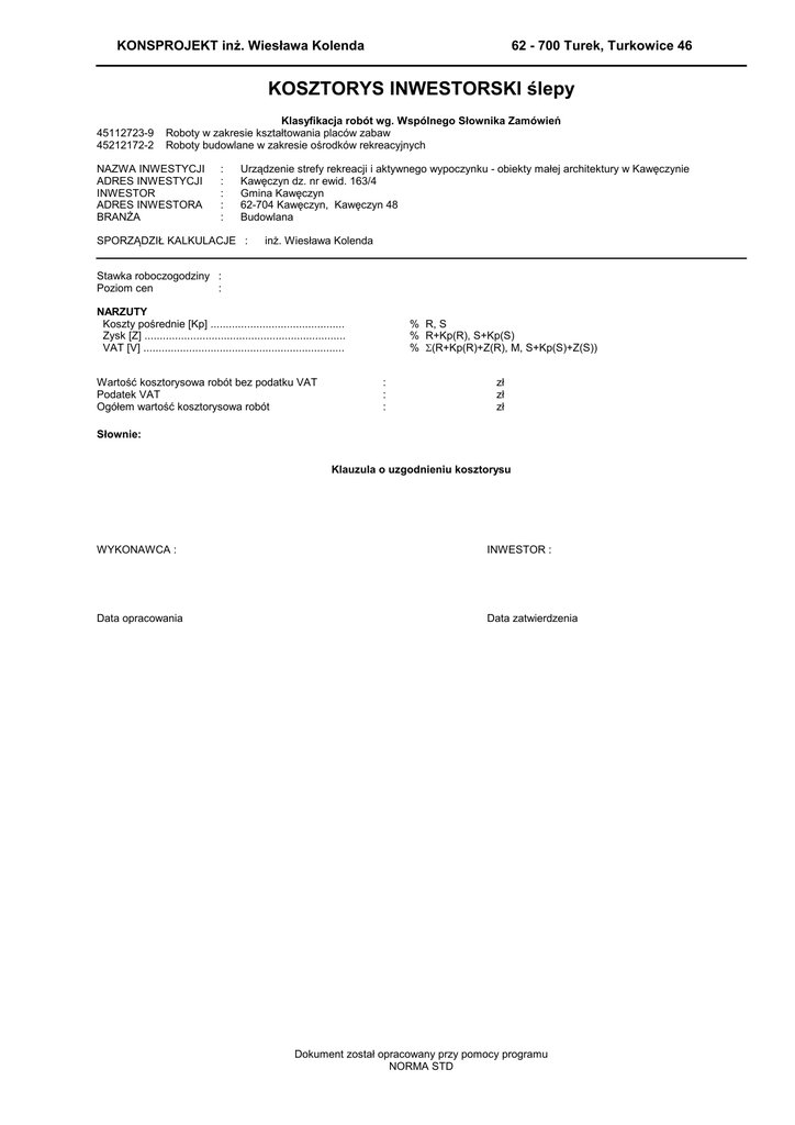 KONSPROJEKT inż. Wiesława Kolenda 62 - 700 Turek, Turkowice 46 KOSZTORYS INWESTORSKI ślepy 45112723-9 45212172-2 Klasyfikacja robót wg. Wspólnego Słownika Zamówień Roboty w zakresie kształtowania placów zabaw Roboty budowlane w zakresie ośrodków rekreacyjnych NAZWA INWESTYCJI ADRES INWESTYCJI INWESTOR ADRES INWESTORA BRANŻA : : : : : Urządzenie strefy rekreacji i aktywnego wypoczynku - obiekty małej architektury w Kawęczynie Kawęczyn dz. nr ewid. 163/4 Gmina Kawęczyn 62-704 Kawęczyn, Kawęczyn 48 Budowlana SPORZĄDZIŁ KALKULACJE : inż. Wiesława Kolenda Stawka roboczogodziny : Poziom cen : NARZUTY Koszty pośrednie [Kp] ............................................ Zysk [Z] .................................................................. VAT [V] .................................................................. Wartość kosztorysowa robót bez podatku VAT Podatek VAT Ogółem wartość kosztorysowa robót % R, S % R+Kp(R), S+Kp(S) % Σ(R+Kp(R)+Z(R), M, S+Kp(S)+Z(S)) : : : zł zł zł Słownie: Klauzula o uzgodnieniu kosztorysu WYKONAWCA : INWESTOR : Data opracowania Data zatwierdzenia Dokument został opracowany przy pomocy programu NORMA STD OGÓLNA CHARAKTERYSTYKA OBIEKTU I. Przedmiot opracowania Przedmiotem opracowania jest "Urządzenie strefy rekreacji i aktywnego wypoczynku - obiekty małej architektury" w Kawęczynie. II. W ramach zagospodarowania terenu zaprojektowano obiekty: 1. Miejsce na ognisko 2. Plac zabaw 3. Siłownia plenerowa III. Wyposażenie placu zabaw: 1. Zestaw zabawowy MAJK 34 2. Sprężynowiec pojedynczy 1 kpl 2 szt IV. Wyposażenie siłowni plenerowej 1. Krzesło do wyciskania i surfer 2. Orbitrek i biegacz 3. Wioślarz i Stepper 1 szt 1 szt 1 szt Powierzchnie 1. Powierzchnia całkowita opracowania 2. Nawierzchnia trawiasta 515,3 m2 88,6 m2 - wykonanie siłami własnymi V. Plac zabaw 1. Nawierzchnia piaskowa 2. Powierzchnia stref ochronnych 3. Obrzeże betonowe 90,7 m2 97,8 m2 10,7 mb VIII. Miejsce na ognisko - 38,50 m2 1. Palenisko 2. Nawierzchnia z kostki brukowej 3. Obrzeża betonowe 2,2 m2 36,3 m2 28,0 mb IX. Inne elementy 1. Ogrodzenie metalowe - naprawa 2. Obrzeże betonowe - przełożenie 3. Nawierzchnia istn. chodnika - przełożenie 29,0 mb - wykonanie siłami własnymi 14,5mb - wtkonanie siłami własnymi 19,0 m2 - wykonanie siłami własnymi -2- Norma STD Wersja 4.29 Licencja: 9871 Kawęczyn - teren rekreac 1-1 Lp. Nazwa 1 Miejsce na ognisko 451112914 2 Nawierzchnia z piasku - Plac zabaw 45233250-6 3 Plac zabaw - z wyposażeniem 45112723-9 4 Siłownia plenerowa 452122008 5 Dokumentacja geodezyjna RAZEM netto VAT Razem brutto TABELA ELEMENTÓW SCALONYCH Robocizna Materiały Słownie: -3- Norma STD Wersja 4.29 Licencja: 9871 Sprzęt Kp Z RAZEM Kawęczyn - teren rekreac 1-1 Lp. 1 1 d.1 2 d.1 3 d.1 Podstawa KOSZTORYS INWESTORSKI Opis Jedn. przedm. 45111291-4 KNNR 6 040401 KNNR 4 200105 KNR-W 4-01 0312-09 Miejsce na ognisko 45111291-4 Obrzeża betonowe o wymiarach 20x6 cm na podsypce piaskowej, spoiny wypełnione zaprawą cementową Ścianka paleniska betonowa o gr. 20 cm - beton B 15 wsp. do R=1,5 Uzupełnienie rolek z cegieł klinkierowych pełnych na zaprawie cementowej o szerokości 1 ceg. poziomo Wsp. do R=1,5 4 KNNR 1 0113- Usunięcie warstwy ziemi urodzajnej (humusu) o grubośd.1 01 ci do 15 cm za pomocą spycharek 5 KNNR 6 0103- Profilowanie i zagęszczanie podłoża wykonywane ręczd.1 01 nie w gruncie kat. II-IV pod warstwy konstrukcyjne nawierzchni 6 KNNR 6 0104- Warstwy odsączające zagęszczane mechanicznie o d.1 01 gr.10 cm 7 KNNR 6 0105- Warstwy podsypkowe cementowo-piaskowe zagęszczad.1 08 ne mechanicznie o gr.5 cm 8 KNR 2-31 0511- Nawierzchnie z kostki brukowej betonowej kolorowej d.1 03 grubość 6 cm na podsypce cementowo-piaskowej gr. 4 cm. 9 A.W. Ławki drewniane długości 175 cm, siedzisko ławki o d.1 szerokości 30 cm złożone z dwóch desek grub. 5 cm impregnowanych. Deski oparte na krawędzikakach drewnianych lub stelażu betonowym. Razem dział: Miejsce na ognisko 45111291-4 2 45233250-6 Nawierzchnia z piasku - Plac zabaw 45233250-6 10 KNNR 1 0113- Usunięcie warstwy ziemi urodzajnej (humusu) o grubośd.2 01 ci do 15 cm za pomocą spycharek 11 KNNR 1 0113- Usunięcie warstwy ziemi urodzajnej (humusu) za pomod.2 02 cą spycharek - dodatek za dalsze 5 cm ponad 15 cm 12 KNNR 6 0103- Profilowanie i zagęszczanie podłoża wykonywane ręczd.2 01 nie w gruncie kat. II-IV pod warstwy konstrukcyjne nawierzchni 13 KNNR 6 0104- Warstwy odsączające zagęszczane mechanicznie o d.2 02 gr.20 cm 14 KNNR 6 0104- Warstwy odsączające zagęszczane mechanicznie o d.2 01 gr.10 cm - do grubości całkowitej 30 cm. 15 KNR 2-31 0401- Rowki pod obrzeża betonowe o wymiarach 20x20 cm w d.2 02 gruncie kat.III-IV 16 KNNR 6 0404- Obrzeża betonowe o wymiarach 20x6 cm na podsypce d.2 01 piaskowej, spoiny wypełnione zaprawą cementową Razem dział: Nawierzchnia z piasku - Plac zabaw 45233250-6 3 45112723-9 Plac zabaw - z wyposażeniem 45112723-9 17 oferta produ- Zestaw zabawowy - MAJKA 34 - składa się co najmniej d.3 centa z wieży z daszkiem, zjeżdżalni z uchwytem, uchwytu wejściowego. trapu wejściowego, ścianki wspinaczkowej, pomostu pośredniego, pomostu, przejścia rurowego, gry kółko-krzyżyk i zabezpieczeń. zakup,dostawa i montaż. 18 Sprężynowiec pojedynczy. Huśtawka sprężynowa - bud.3 oferta produ- jak. Elementy konstrukcyjne ze sklejki wodoodpornej bądż płytyHDPE. Sprężyna stalowa zabezpieczona centa przed zakleszczeniem. Uchwyt do rąk-rurka z tworzywa sztucznego. Podparcie dla stóp- rurka z tworzywa sztucznego, stopa betonowa. Elementy stalowa malowane proszkowo. zakup, dostawa i montaż. Razem dział: Plac zabaw - z wyposażeniem 45112723-9 4 45212200-8 Siłownia plenerowa 45212200-8 19 oferta produ- Krzesło do wyciskania i surfer - całe ciało. - zakup, dod.4 centa stawa, montaż. 20 oferta produ- Orbitrek i biegacz - całe ciało - zakup,dostawa, montaż. d.4 centa 21 oferta produ- Wioślarz i