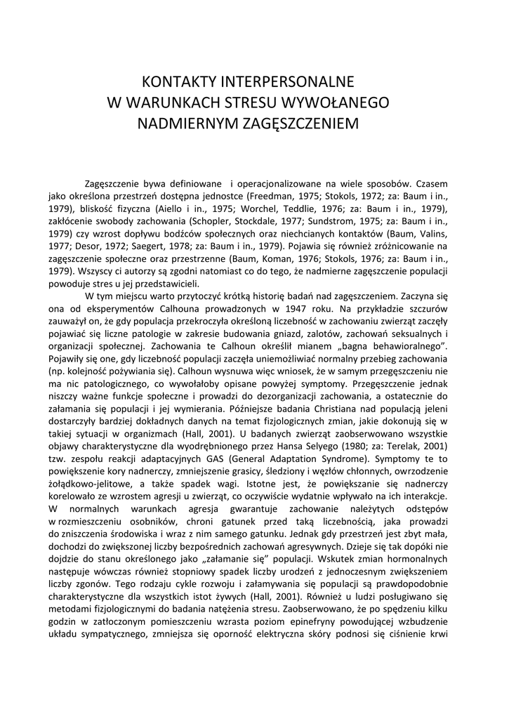 KONTAKTY INTERPERSONALNE W WARUNKACH STRESU WYWOŁANEGO NADMIERNYM ZAGĘSZCZENIEM Zagęszczenie bywa definiowane i operacjonalizowane na wiele sposobów. Czasem jako określona przestrzeń dostępna jednostce (Freedman, 1975; Stokols, 1972; za: Baum i in., 1979), bliskość fizyczna (Aiello i in., 1975; Worchel, Teddlie, 1976; za: Baum i in., 1979), zakłócenie swobody zachowania (Schopler, Stockdale, 1977; Sundstrom, 1975; za: Baum i in., 1979) czy wzrost dopływu bodźców społecznych oraz niechcianych kontaktów (Baum, Valins, 1977; Desor, 1972; Saegert, 1978; za: Baum i in., 1979). Pojawia się również zróżnicowanie na zagęszczenie społeczne oraz przestrzenne (Baum, Koman, 1976; Stokols, 1976; za: Baum i in., 1979). Wszyscy ci autorzy są zgodni natomiast co do tego, że nadmierne zagęszczenie populacji powoduje stres u jej przedstawicieli. W tym miejscu warto przytoczyć krótką historię badań nad zagęszczeniem. Zaczyna się ona od eksperymentów Calhouna prowadzonych w 1947 roku. Na przykładzie szczurów zauważył on, że gdy populacja przekroczyła określoną liczebność w zachowaniu zwierząt zaczęły pojawiać się liczne patologie w zakresie budowania gniazd, zalotów, zachowań seksualnych i organizacji społecznej. Zachowania te Calhoun określił mianem „bagna behawioralnego”. Pojawiły się one, gdy liczebność populacji zaczęła uniemożliwiać normalny przebieg zachowania (np. kolejność pożywiania się). Calhoun wysnuwa więc wniosek, że w samym przegęszczeniu nie ma nic patologicznego, co wywołałoby opisane powyżej symptomy. Przegęszczenie jednak niszczy ważne funkcje społeczne i prowadzi do dezorganizacji zachowania, a ostatecznie do załamania się populacji i jej wymierania. Późniejsze badania Christiana nad populacją jeleni dostarczyły bardziej dokładnych danych na temat fizjologicznych zmian, jakie dokonują się w takiej sytuacji w organizmach (Hall, 2001). U badanych zwierząt zaobserwowano wszystkie objawy charakterystyczne dla wyodrębnionego przez Hansa Selyego (1980; za: Terelak, 2001) tzw. zespołu reakcji adaptacyjnych GAS (General Adaptation Syndrome). Symptomy te to powiększenie kory nadnerczy, zmniejszenie grasicy, śledziony i węzłów chłonnych, owrzodzenie żołądkowo-jelitowe, a także spadek wagi. Istotne jest, że powiększanie się nadnerczy korelowało ze wzrostem agresji u zwierząt, co oczywiście wydatnie wpływało na ich interakcje. W normalnych warunkach agresja gwarantuje zachowanie należytych odstępów w rozmieszczeniu osobników, chroni gatunek przed taką liczebnością, jaka prowadzi do zniszczenia środowiska i wraz z nim samego gatunku. Jednak gdy przestrzeń jest zbyt mała, dochodzi do zwiększonej liczby bezpośrednich zachowań agresywnych. Dzieje się tak dopóki nie dojdzie do stanu określonego jako „załamanie się” populacji. Wskutek zmian hormonalnych następuje wówczas również stopniowy spadek liczby urodzeń z jednoczesnym zwiększeniem liczby zgonów. Tego rodzaju cykle rozwoju i załamywania się populacji są prawdopodobnie charakterystyczne dla wszystkich istot żywych (Hall, 2001). Również u ludzi posługiwano się metodami fizjologicznymi do badania natężenia stresu. Zaobserwowano, że po spędzeniu kilku godzin w zatłoczonym pomieszczeniu wzrasta poziom epinefryny powodującej wzbudzenie układu sympatycznego, zmniejsza się oporność elektryczna skóry podnosi się ciśnienie krwi oraz zwiększa częstotliwość oddechu (np.: Baum i in., 1982; Lundberg, 1976; Singer i in., 1978; za: Baum i Paulus, 1987). Analogie „zwierzęce” są niewątpliwie przydatne dla wyjaśnienia mechanizmu również ludzkiej reakcji na zatłoczenie, nie są jednak wystarczające. Człowiek znajduje się na nieporównywalnie wyższym poziomie rozwoju społecznego, dlatego styka się ze specyficznymi problemami. Saegert (1979) na podstawie wywiadów z mieszkańcami miast uzyskała następująca listę przyczyn stresu związanego z zatłoczeniem (od najczęściej wymienianej): częste spóźnianie się spowodowane korkami etc., konieczność dodatkowego wysiłku, bycie popychanym, irytacja nachalnymi obcymi osobami, przebywanie w zbytniej bliskości z innymi, konieczność przebywania w nielubianym środowisku fizycznym, poczucie osamotnienia, strach przed uszkodzeniem ciała, poczucie przytłoczenia, potrzeba bycia samym. Natomiast Schmidt (1979) wyróżnił następujące okoliczności sprzyjające zbytniemu zagęszczeniu: a) w mieszkaniu: zbyt duża liczba osób, brak prywatności, niemożność wyjścia/wyprowadzenia się z mieszkania; b) w mieście: bardzo rozwinięta zabudowa w najbliższej okolicy (sąsiedztwie), duże natężenie ruchu drogowego, tłok w miejscach przeznaczonych do wypoczynku (parki, baseny etc.), brak prywatności. O specyfice ludzkiej reakcji na zagęszczenie świadczy również fakt, iż nawet bardzo duży tłok nie musi powodować stresu. Jak wykazano, poczucie kontroli nad sytuacją może zniwelować ten efekt. Lundberg (1976; za: Baum i Paulus, 1987) wykazał, że pasażerowie zatłoczonego pociągu odczuwali lub nie stres w zależności od tego kiedy na której stacji wsiedli. Paradoksalnie, ci, którzy wsiedli pierwsi, czyli dłużej przebywali w nadmiernym zagęszczeniu odczuwali mniejszy stres. Autor tłumaczy to tym, że wsiadając jako pierwsi, mogli wybrać sobie miejsce, mieli więc poczucie kontrolowania sytuacji. Podobnie uczestnicy masowych festiwali rockowych, stłoczeni nawet przez kilka dni na małej przestrzeni nie skarżą się z reguły na zbyt duży tłum. Kiedy uświadomimy sobie panujący tam zwykle upał, duże spożycie alkoholu, złe warunki sanitarne, można by się spodziewać dotkliwych stresów, frustracji, wybuchów wściekłości i rękoczynów. Jednak do zachowań agresywnych dochodzi tam rzadko, a statystyki przestępczości są niskie. Niewątpliwie więc muzyka nie jest jedyną atrakcją takich festiwali, tłum sam w so