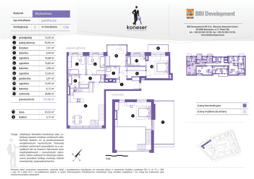 Wytwórnia Budynek penthouse typ mieszkania kondygnacja 5 nr mieszkania 1 przedpokój 13,35 m2 2 pokój dzienny 45,95 m2 3 korytarz 7,01 m2 4 łazienka 4,49 m2 5 sypialnia 10,68 m2 6 sypialnia 10,82 m2 7 łazienka 4,96 m2 8 sypialnia 13,36 m2 9 garderoba 10 sypialnia 15,95 m2 11 łazienka 6,12 m2 12 antresola 28,80 m2 powierzchnia C56 5,97 m2 BBI Development NFI S.A., Warsaw Corporate Center, 00-688 Warszawa, ul. E. Plater 28, tel.: +48 22 630 33 55, fax: +48 22 630 33 90, www.bbidevelopment.pl poziom główny B 8 5 11 6 10 7 9 3 4 1 antresola 167,46 m 2 ściany konstrukcyjne 2 T1 taras B balkon ściany możliwe do zmiany 25,52 m2 12 5,17 m2 T1 B Uwagi: Lokalizacja elemetów konstrukcji stała. Lokalizacja pionów instalacji sanitarnych stała. Kuchnie, łazienki, wc są pomieszczeniami wentylowanymi mechanicznie. Przewody instalacji sanitarnych prowadzone są w posadzkach lub na ścianach. Naruszanie ścian międzylokalowych i zewnętrznych zabronione. Zakres realizacji nie obejmuje wykończenia posadzek, białego montażu, stolarki wewnętrznej, wyposażenia kuchni. 1m Niniejsze opisy, zestawienia powierzchni, schematy lokali i przedstawione wizualizacje nie stanowią oferty w rozumieniu Kodeksu cywilnego (Dz. U. nr 16 z 1964 r. poz. 93 z późn zm.) i są publikowane jedynie w celach informacyjnych. Przedstawione wizualizacje mają charakter poglądowy i nie mogą być traktowane jako ostateczne projekty realizacyjne.