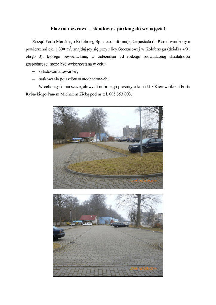 Plac manewrowo – składowy / parking do wynajęcia! Zarząd Portu Morskiego Kołobrzeg Sp. z o.o. informuje, że posiada do Plac utwardzony o powierzchni ok. 1 800 m2, znajdujący się przy ulicy Stoczniowej w Kołobrzegu (działka 4/91 obręb 3), którego powierzchnia, w zależności od rodzaju prowadzonej działalności gospodarczej może być wykorzystana w celu: – składowania towarów; – parkowania pojazdów samochodowych; W celu uzyskania szczegółowych informacji prosimy o kontakt z Kierownikiem Portu Rybackiego Panem Michałem Ziębą pod nr tel. 605 353 803.