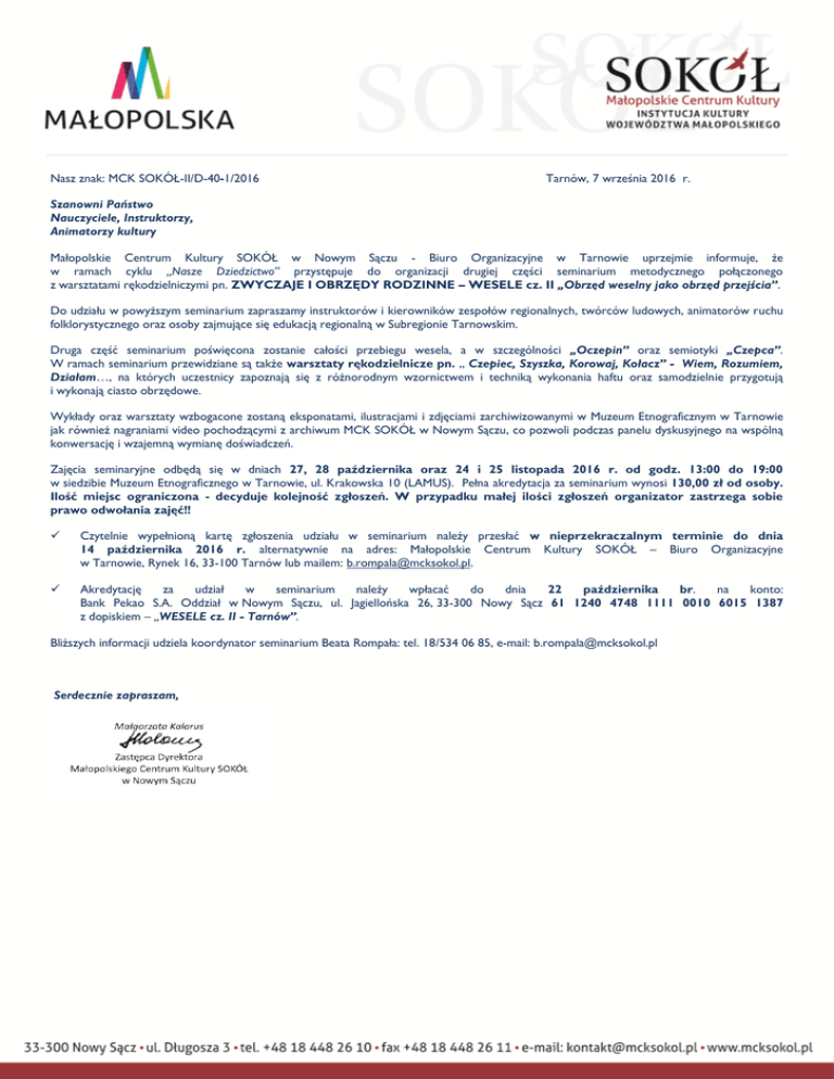 Pismo informujące - Małopolskie Centrum Kultury SOKÓŁ