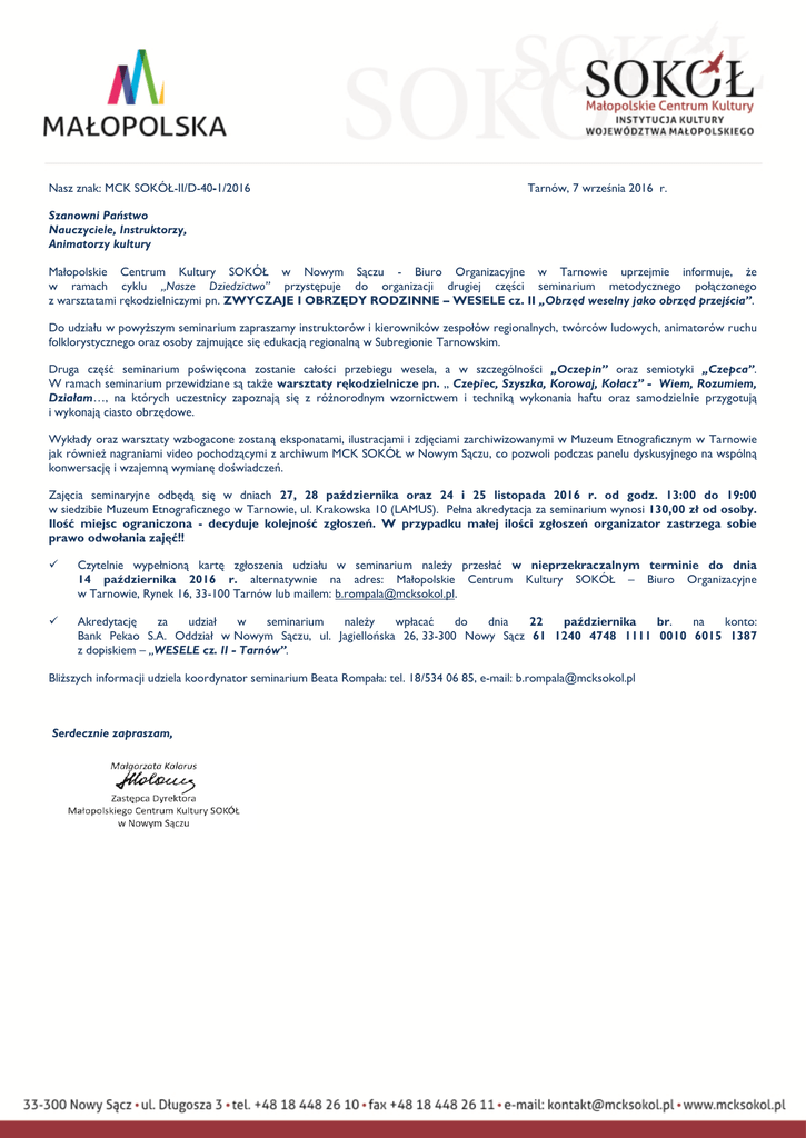Nasz znak: MCK SOKÓŁ-II/D-40-1/2016 Tarnów, 7 września 2016 r. Szanowni Państwo Nauczyciele, Instruktorzy, Animatorzy kultury Małopolskie Centrum Kultury SOKÓŁ w Nowym Sączu - Biuro Organizacyjne w Tarnowie uprzejmie informuje, że w ramach cyklu „Nasze Dziedzictwo” przystępuje do organizacji drugiej części seminarium metodycznego połączonego z warsztatami rękodzielniczymi pn. ZWYCZAJE I OBRZĘDY RODZINNE – WESELE cz. II „Obrzęd weselny jako obrzęd przejścia”. Do udziału w powyższym seminarium zapraszamy instruktorów i kierowników zespołów regionalnych, twórców ludowych, animatorów ruchu folklorystycznego oraz osoby zajmujące się edukacją regionalną w Subregionie Tarnowskim. Druga część seminarium poświęcona zostanie całości przebiegu wesela, a w szczególności „Oczepin” oraz semiotyki „Czepca”. W ramach seminarium przewidziane są także warsztaty rękodzielnicze pn. „ Czepiec, Szyszka, Korowaj, Kołacz” - Wiem, Rozumiem, Działam…, na których uczestnicy zapoznają się z różnorodnym wzornictwem i techniką wykonania haftu oraz samodzielnie przygotują i wykonają ciasto obrzędowe. Wykłady oraz warsztaty wzbogacone zostaną eksponatami, ilustracjami i zdjęciami zarchiwizowanymi w Muzeum Etnograficznym w Tarnowie jak również nagraniami video pochodzącymi z archiwum MCK SOKÓŁ w Nowym Sączu, co pozwoli podczas panelu dyskusyjnego na wspólną konwersację i wzajemną wymianę doświadczeń. Zajęcia seminaryjne odbędą się w dniach 27, 28 października oraz 24 i 25 listopada 2016 r. od godz. 13:00 do 19:00 w siedzibie Muzeum Etnograficznego w Tarnowie, ul. Krakowska 10 (LAMUS). Pełna akredytacja za seminarium wynosi 130,00 zł od osoby. Ilość miejsc ograniczona - decyduje kolejność zgłoszeń. W przypadku małej ilości zgłoszeń organizator zastrzega sobie prawo odwołania zajęć!! Czytelnie wypełnioną kartę zgłoszenia udziału w seminarium należy przesłać w nieprzekraczalnym terminie do dnia 14 października 2016 r. alternatywnie na adres: Małopolskie Centrum Kultury SOKÓŁ – Biuro Organizacyjne w Tarnowie, Rynek 16, 33-100 Tarnów lub mailem: [email protected]. Akredytację za udział w seminarium należy wpłacać do dnia 22 października br. na konto: Bank Pekao S.A. Oddział w Nowym Sączu, ul. Jagiellońska 26, 33-300 Nowy Sącz 61 1240 4748 1111 0010 6015 1387 z dopiskiem – „WESELE cz. II - Tarnów”. Bliższych informacji udziela koordynator seminarium Beata Rompała: tel. 18/534 06 85, e-mail: [email protected] Serdecznie zapraszam,